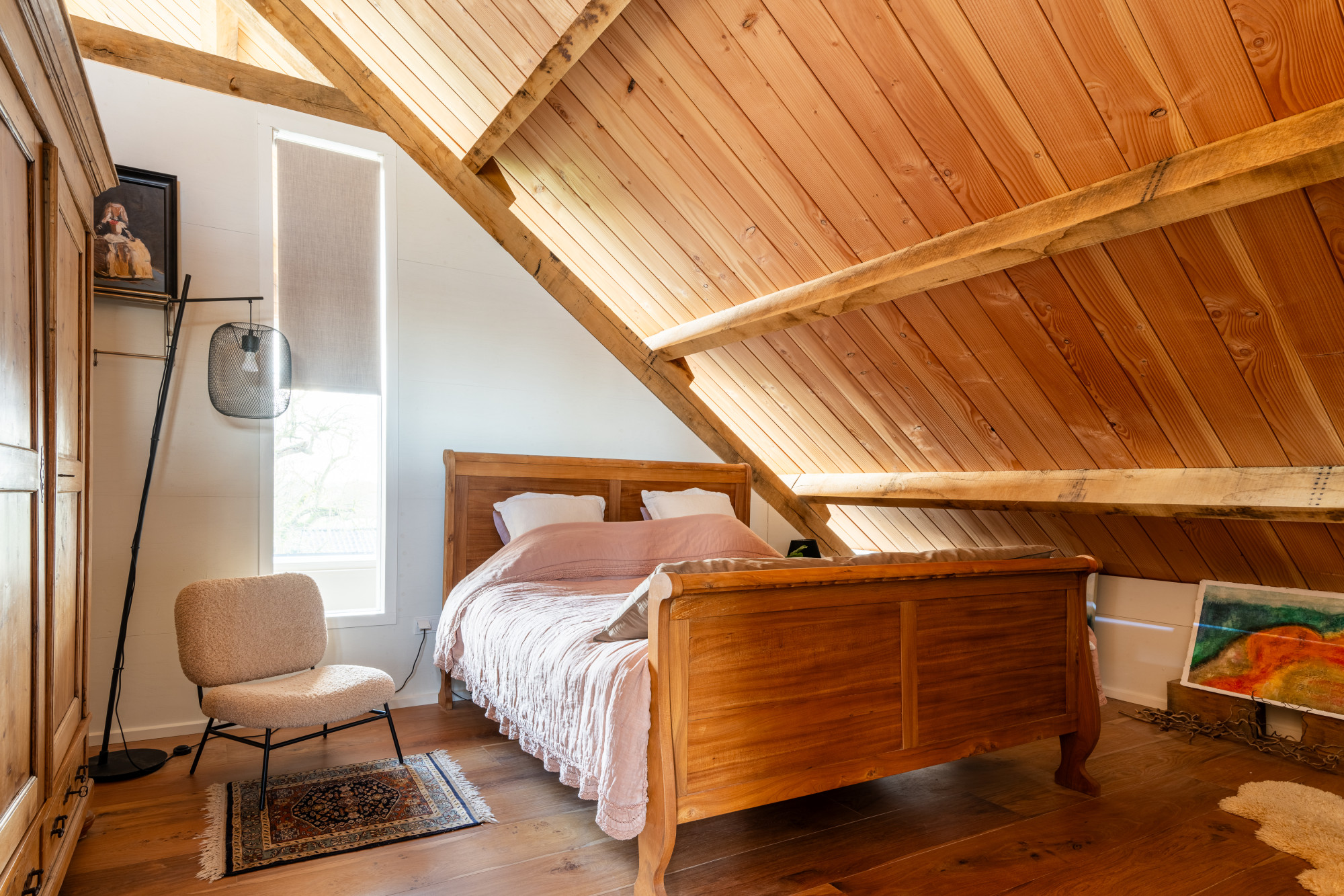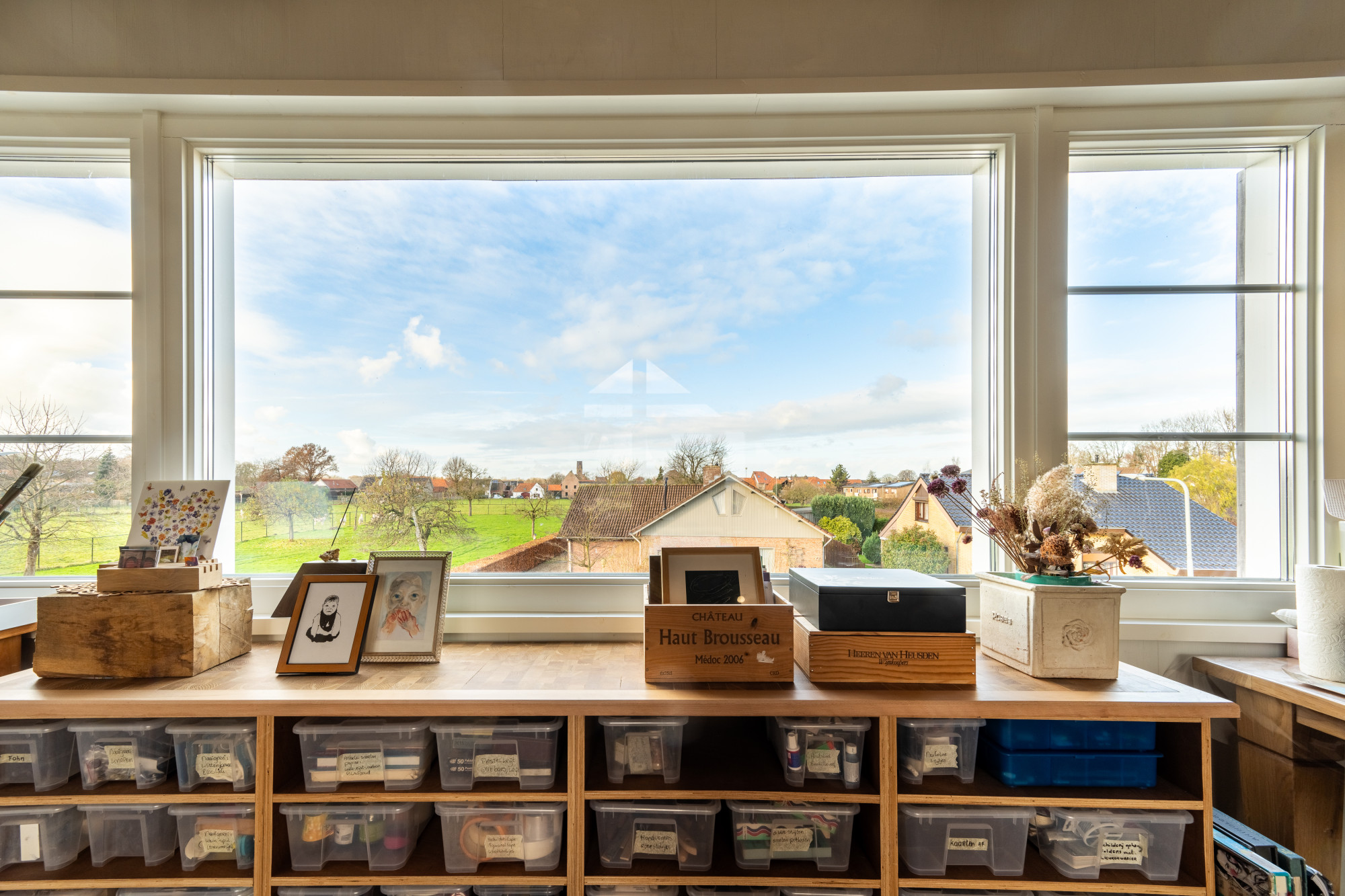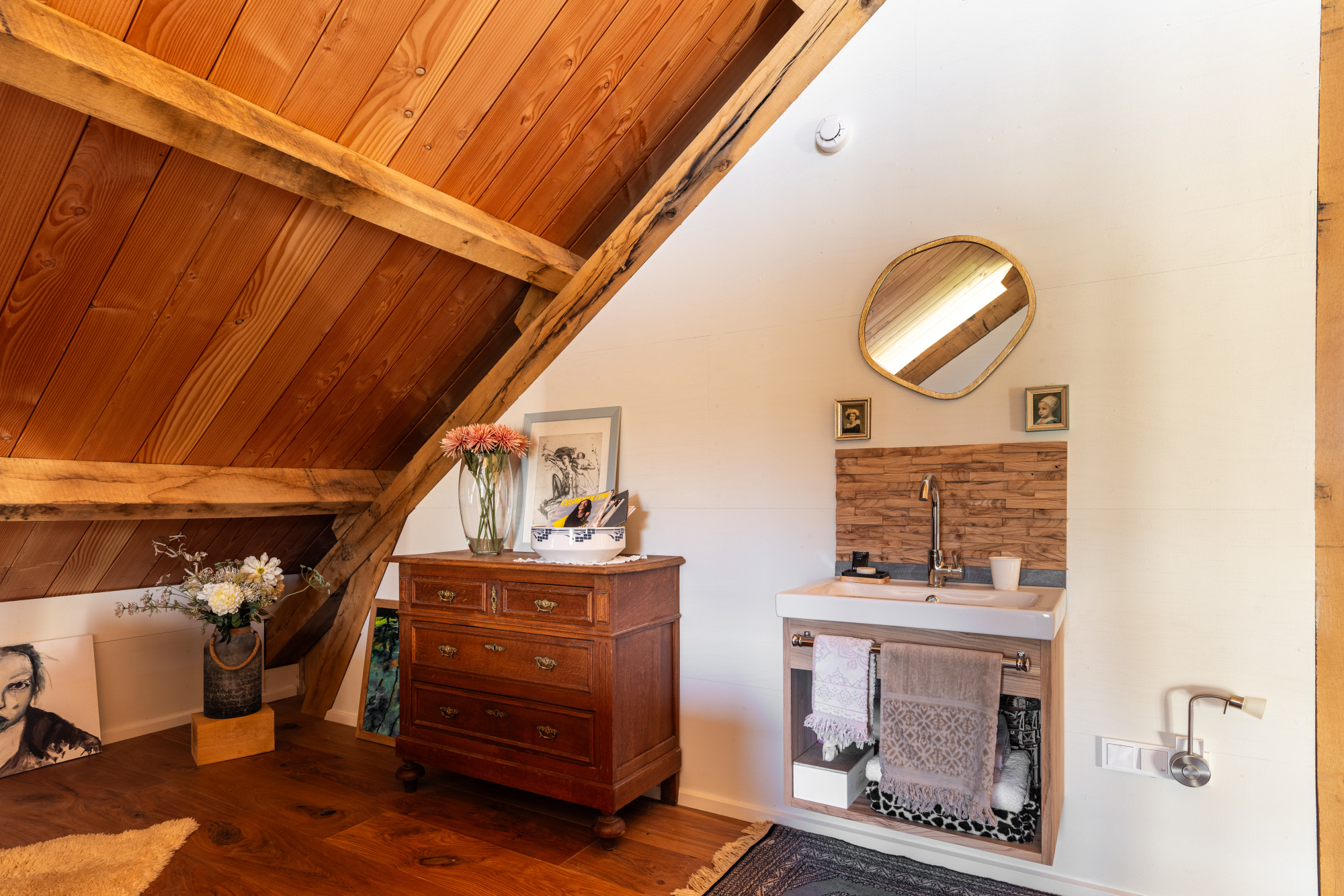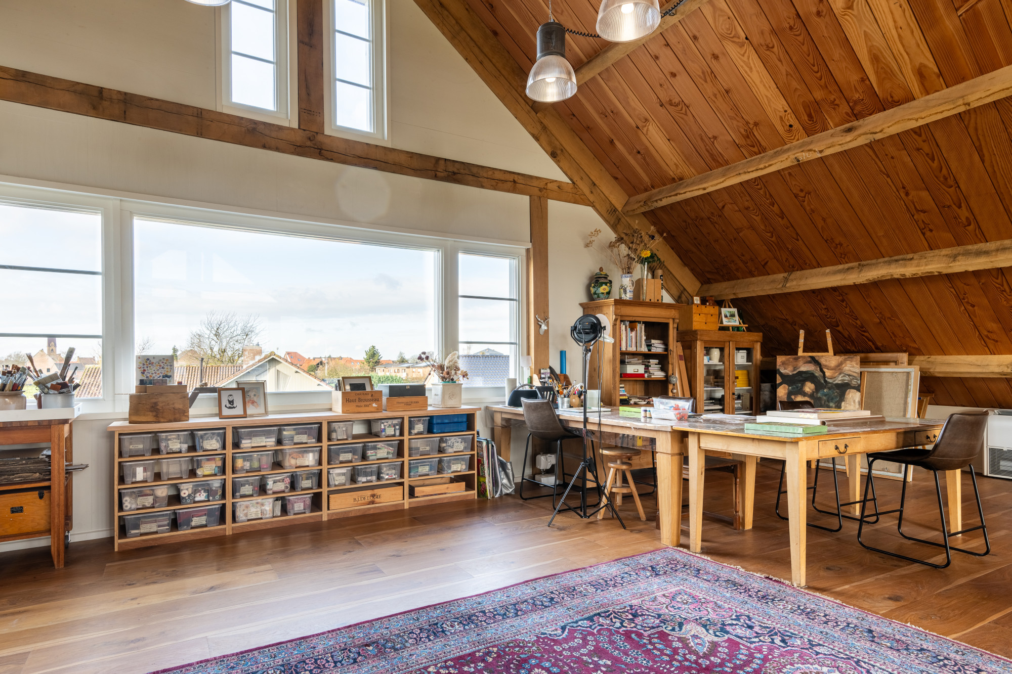 Ruime overloop (8.74 x 7.15 m) voorzien van prachtige massieve eikenvloer en met vide. Deze ruimte wordt nu als atelier gebruikt maar leent zich perfect voor eventuele extra kamers te realiseren indien gewenst.