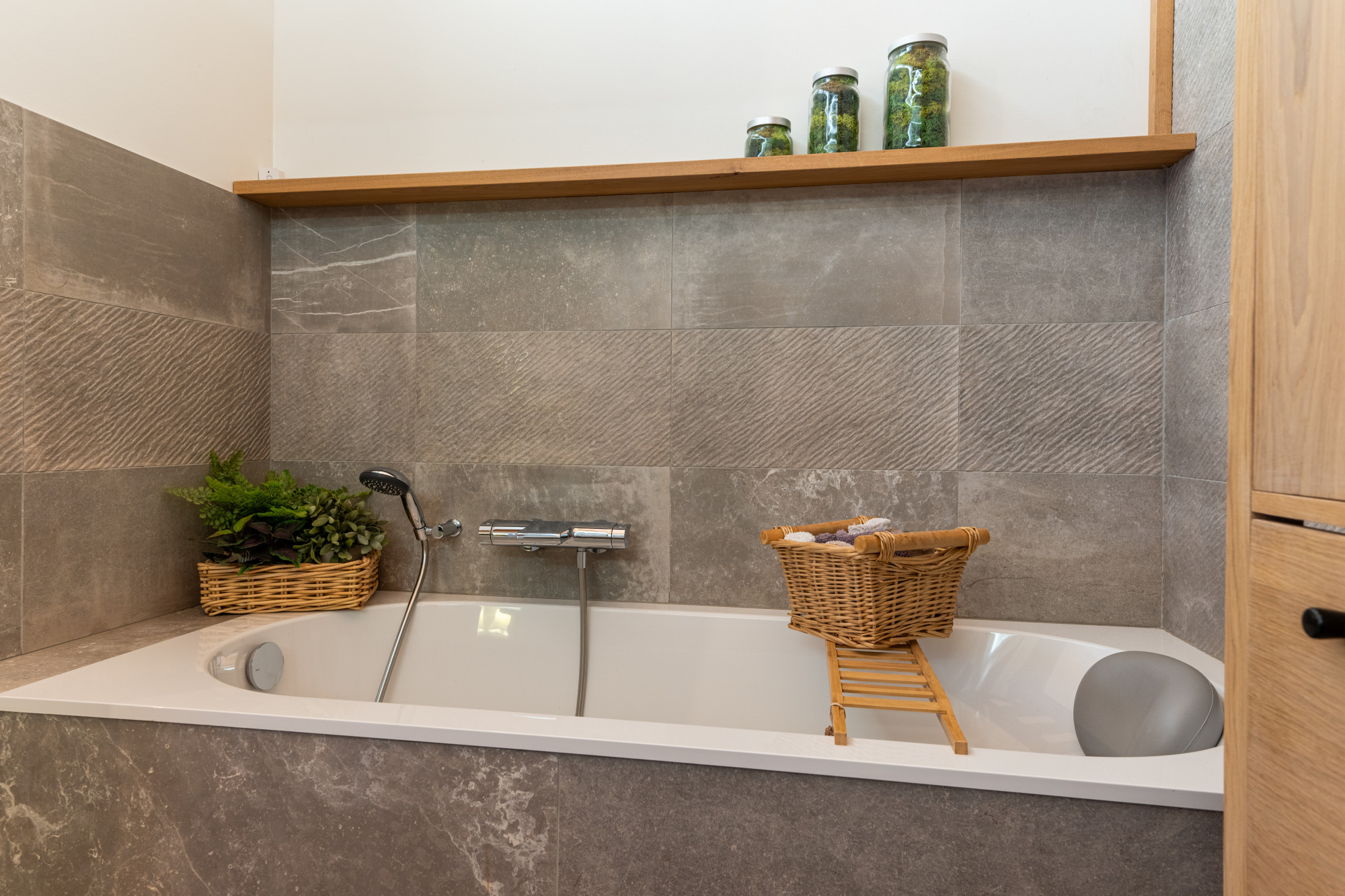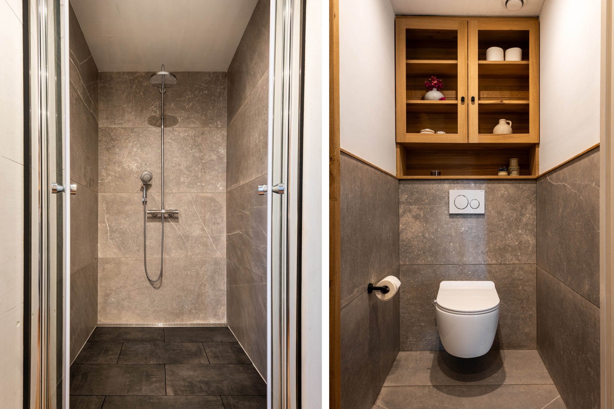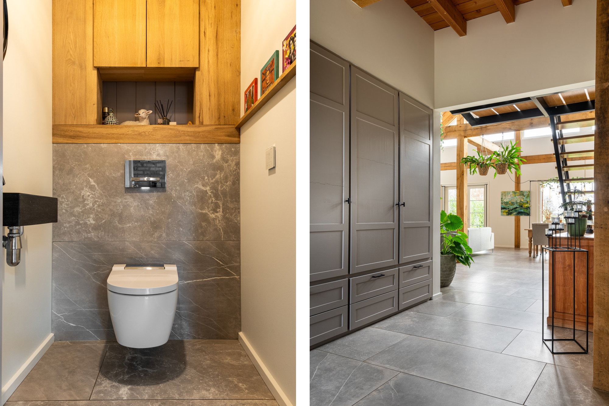Modern afgewerkte toiletruimte met luxe Geberit douchetoilet en fonteintje.