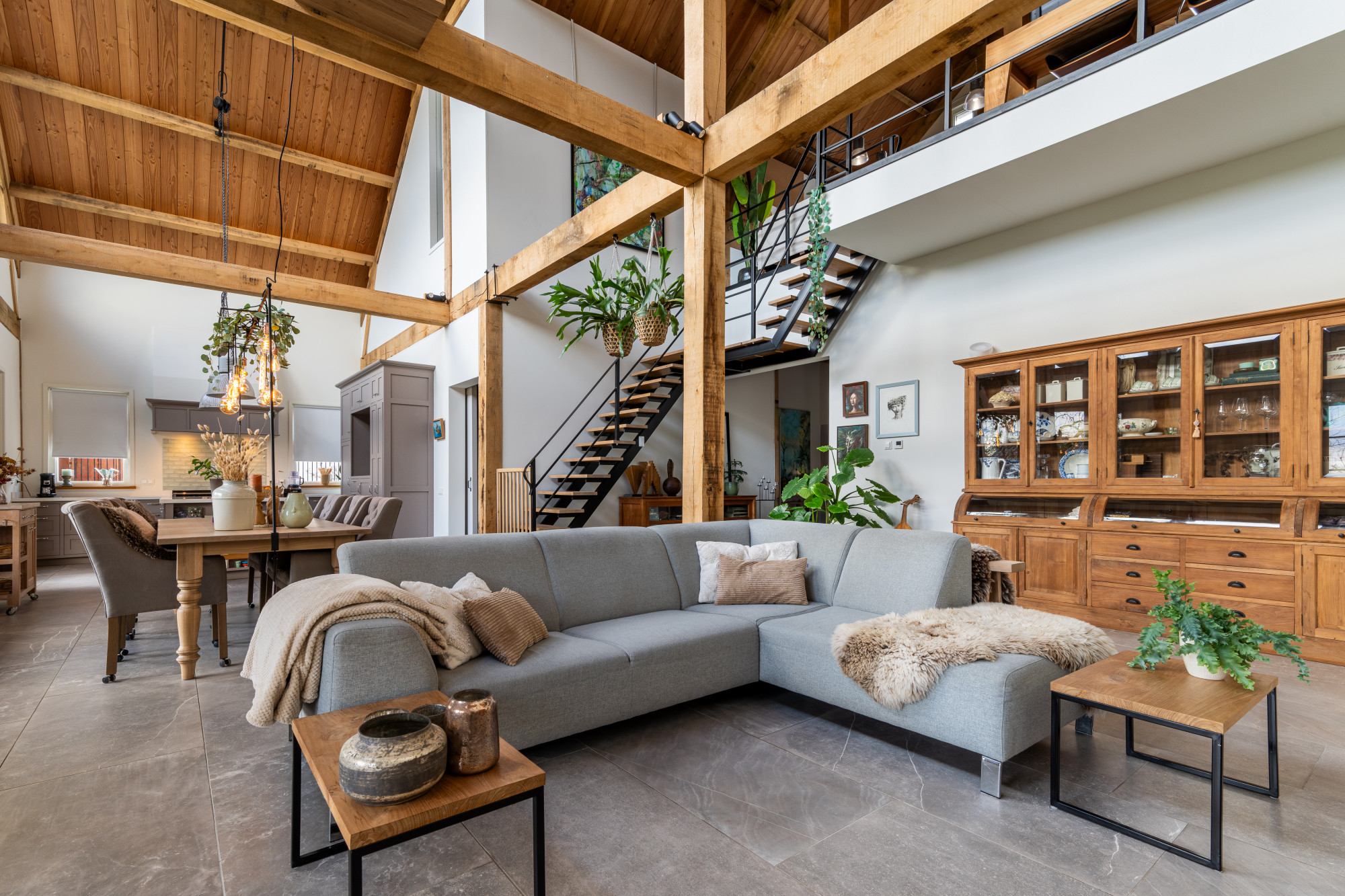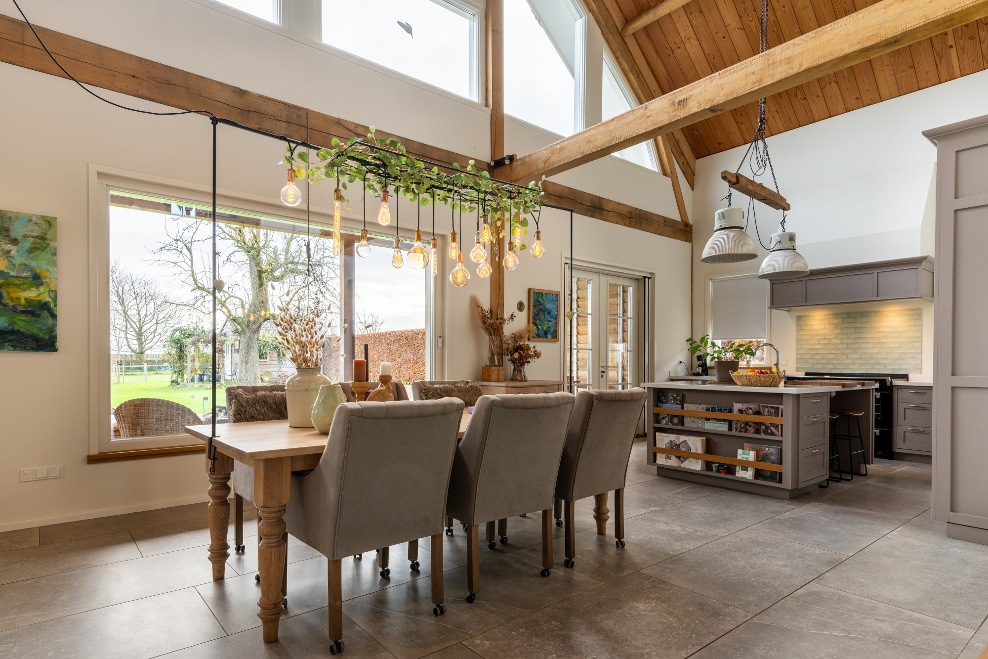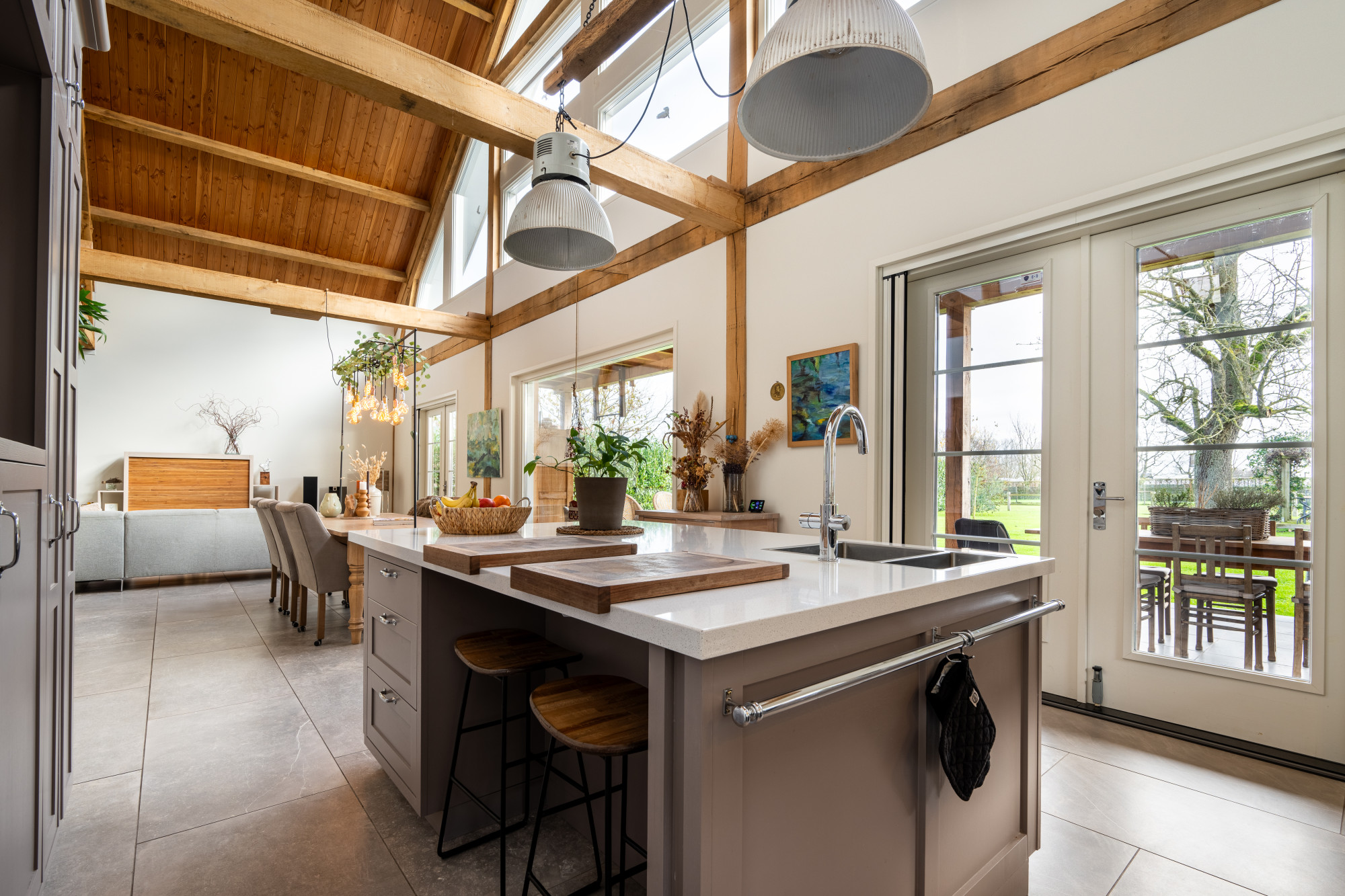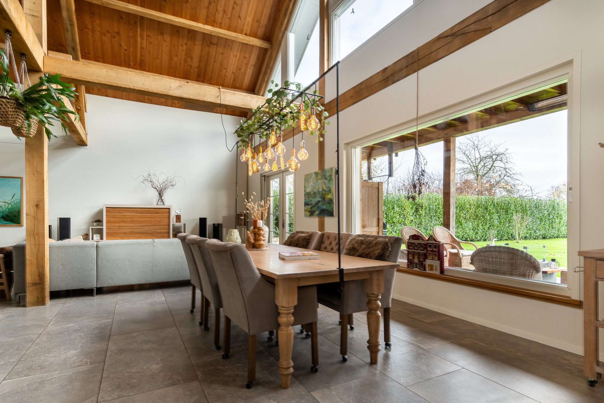 Riante L-vormige living met eetkamer en open keuken (13.27/7.17 x 7.55/4.30 m) voorzien van een prachtige keramische tegelvloer in grootformaat met vloerverwarming, openslaande deuren naar het terras en heel veel lichtinval met als gevolg een heel ruimtelijk effect, waarbij de houten spanten een prachtig accent geven.