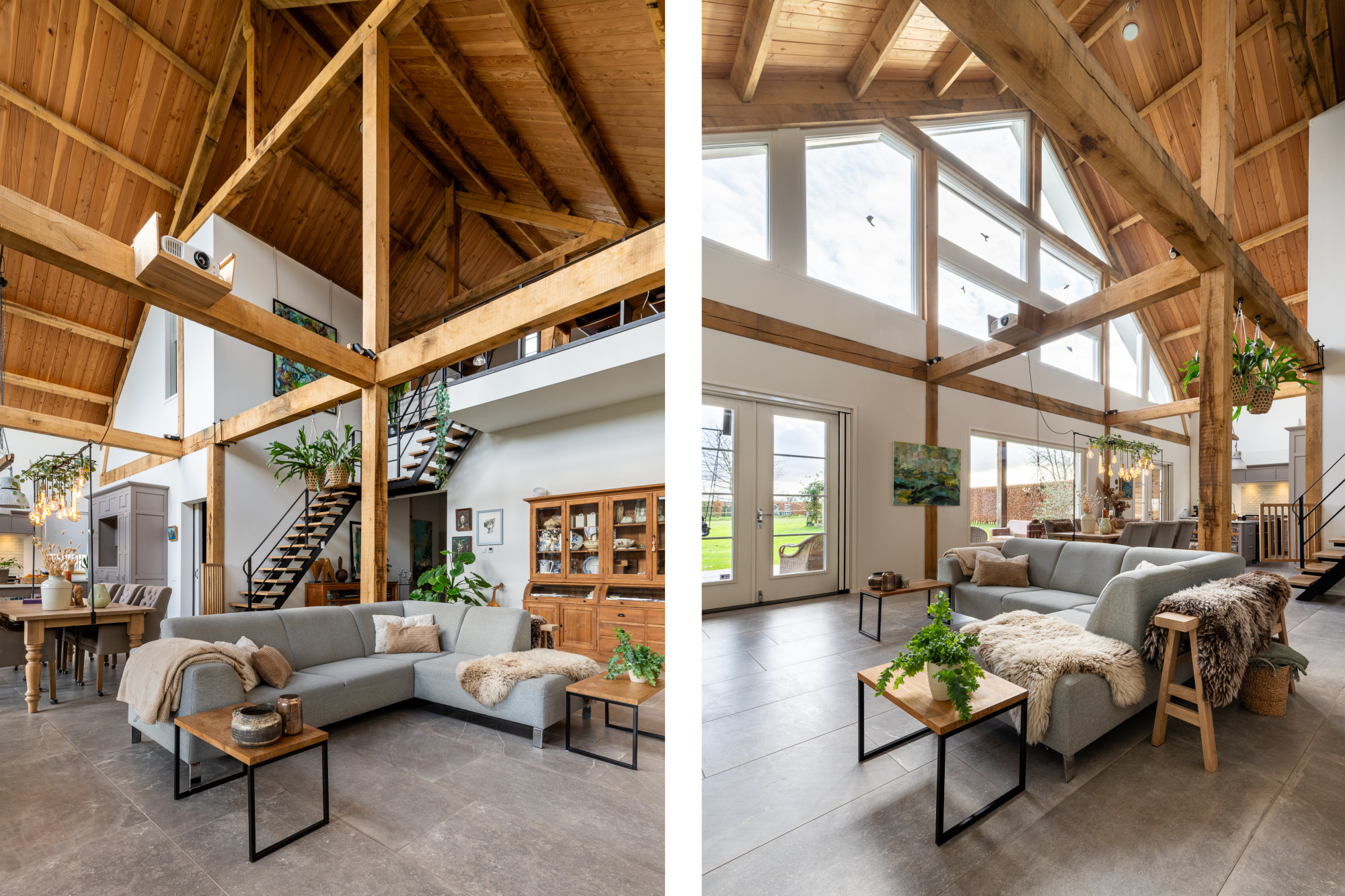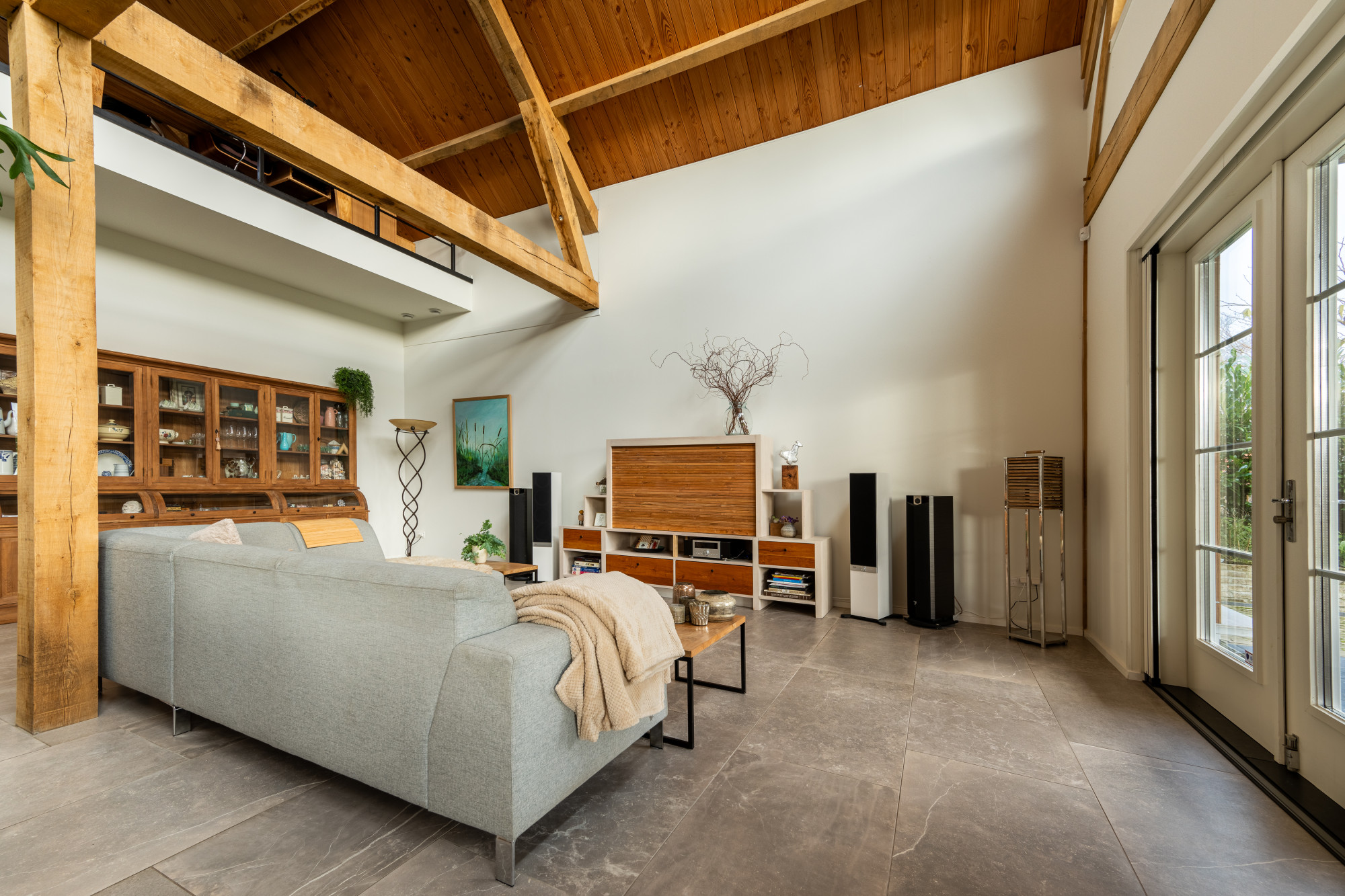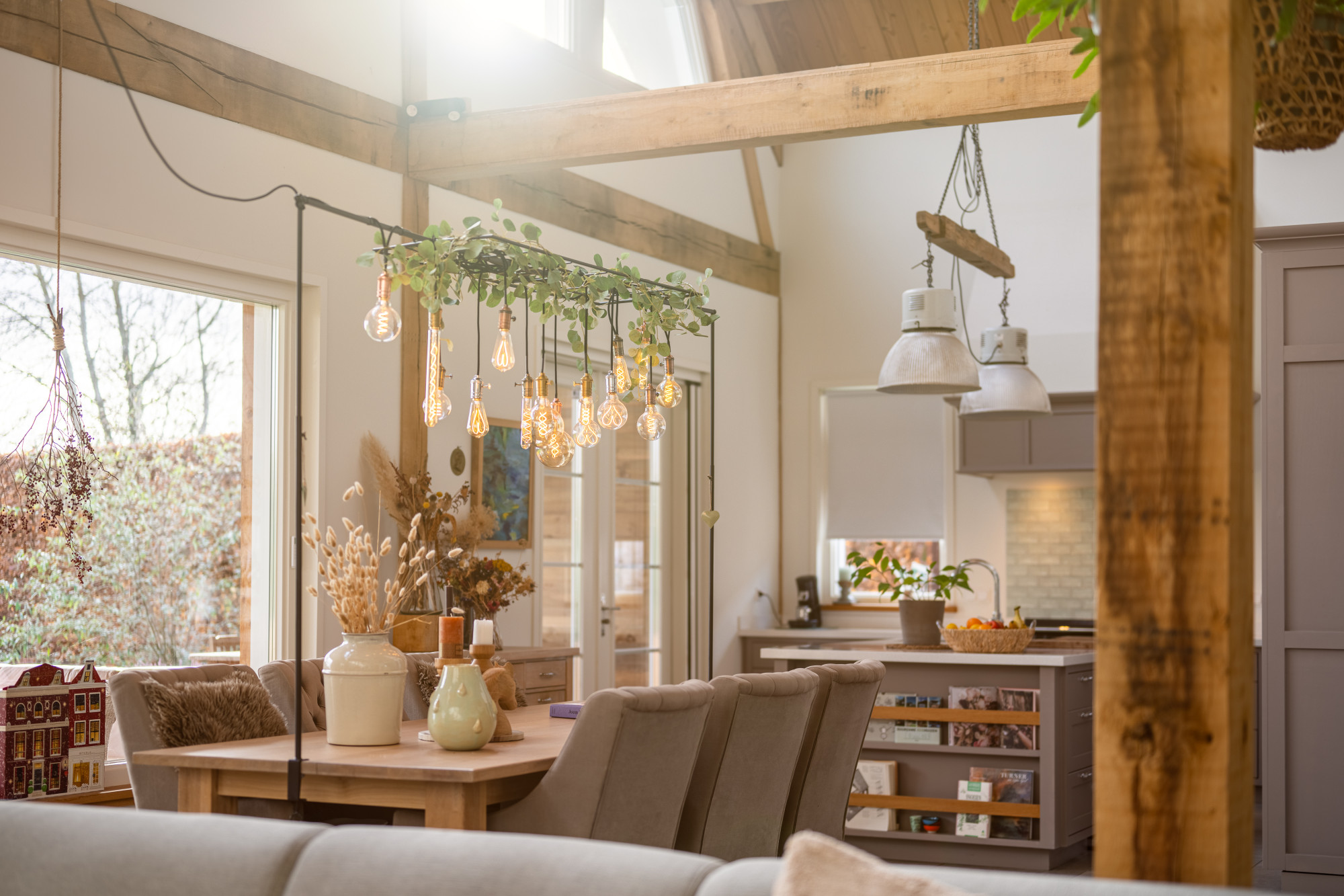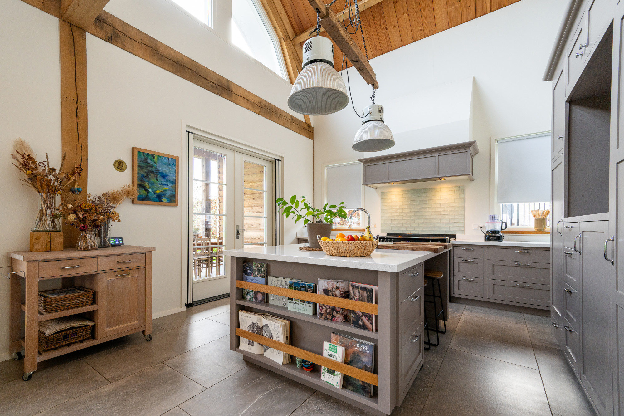 Riante L-vormige living met eetkamer en open keuken (13.27/7.17 x 7.55/4.30 m) voorzien van een prachtige keramische tegelvloer in grootformaat met vloerverwarming, openslaande deuren naar het terras en heel veel lichtinval met als gevolg een heel ruimtelijk effect, waarbij de houten spanten een prachtig accent geven.