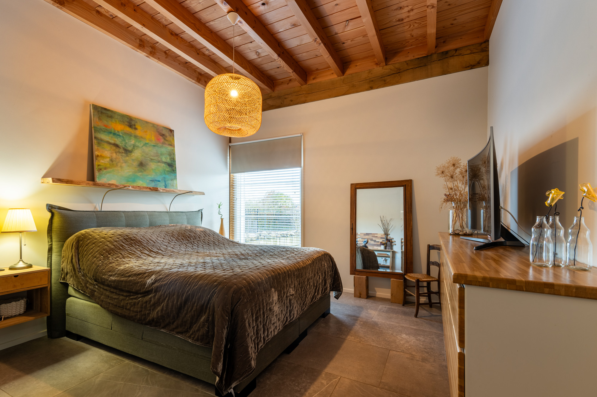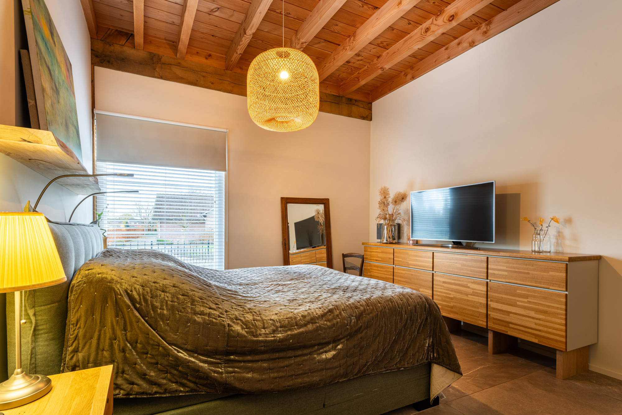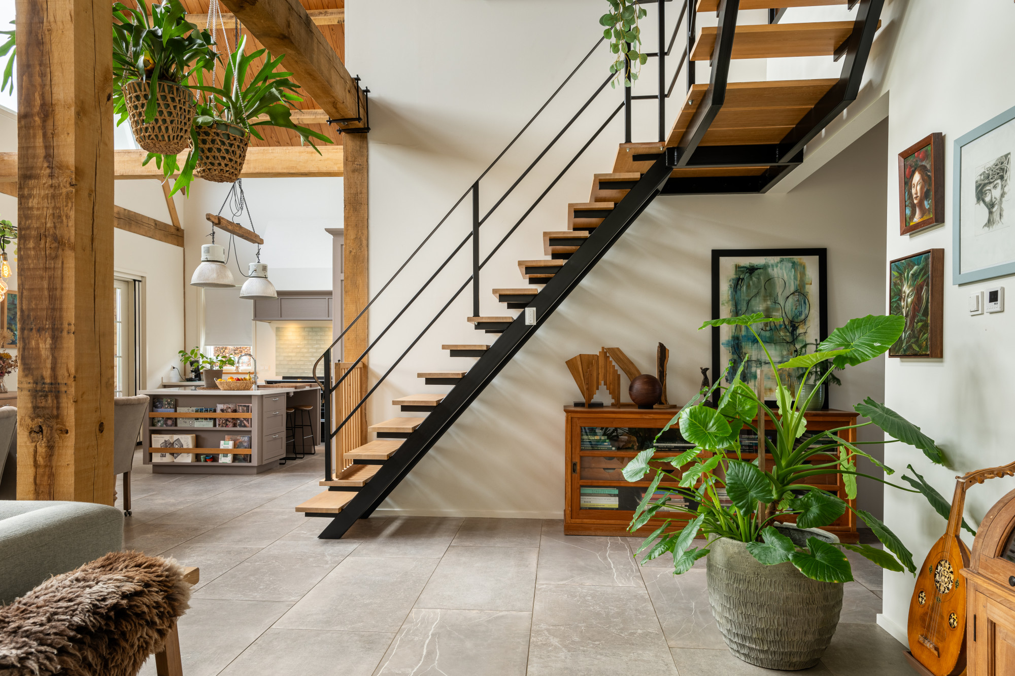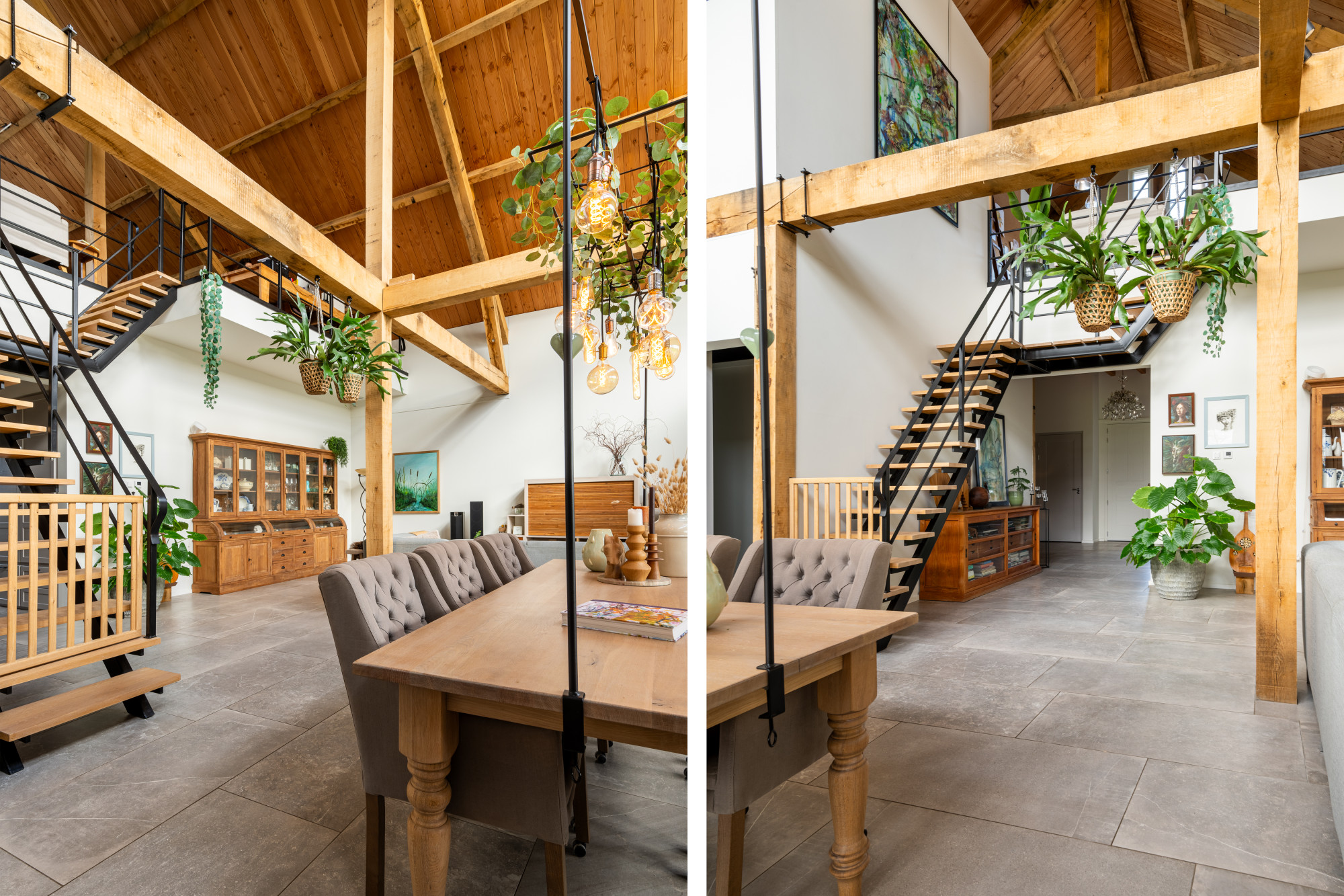 Riante L-vormige living met eetkamer en open keuken (13.27/7.17 x 7.55/4.30 m) voorzien van een prachtige keramische tegelvloer in grootformaat met vloerverwarming, openslaande deuren naar het terras en heel veel lichtinval met als gevolg een heel ruimtelijk effect, waarbij de houten spanten een prachtig accent geven.