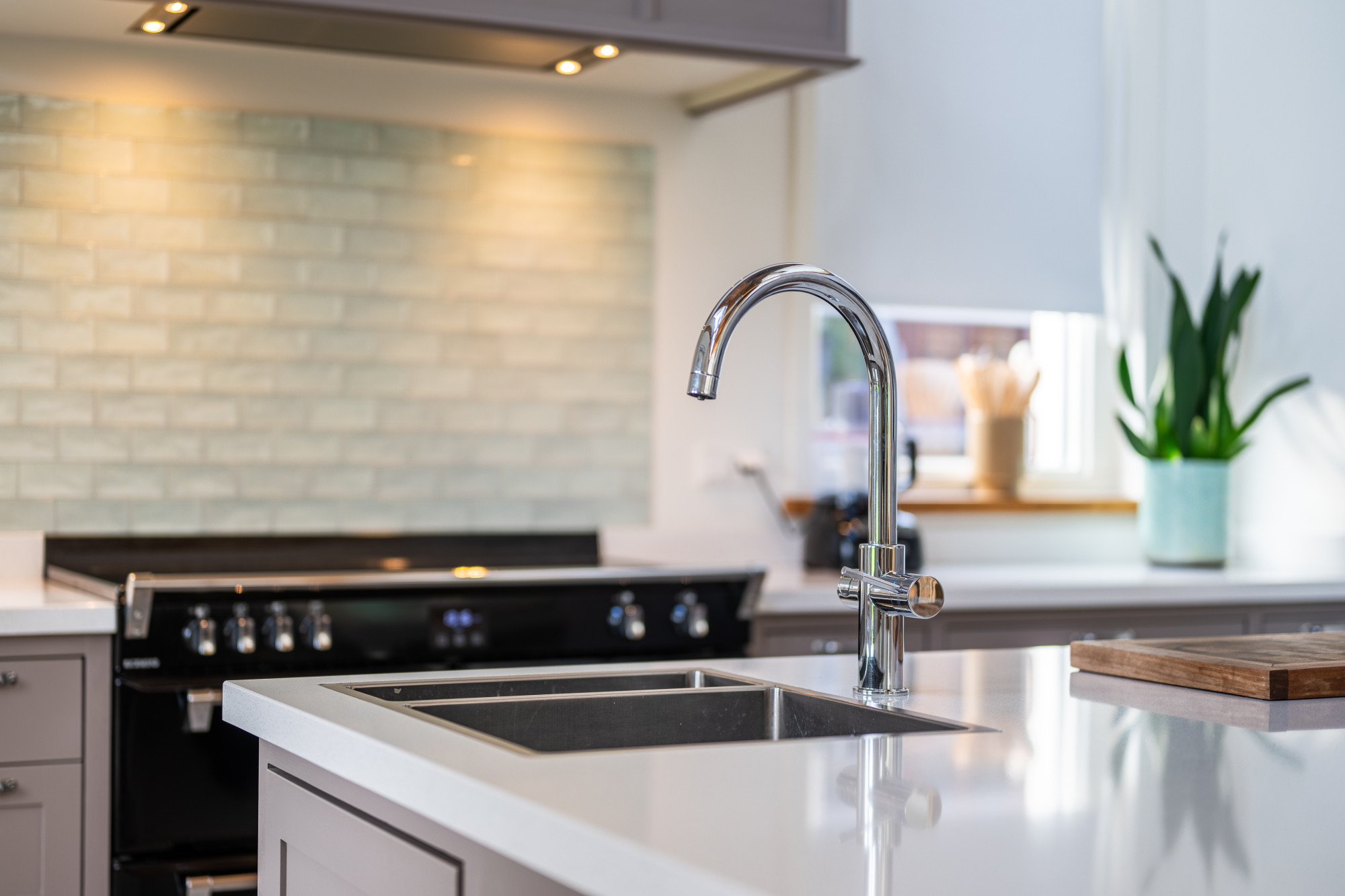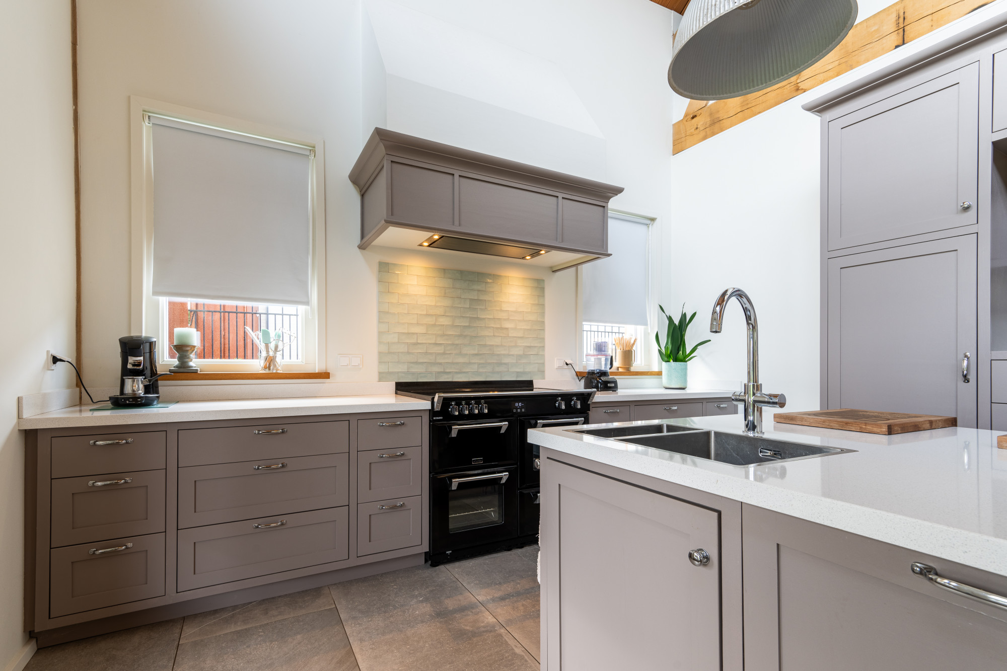Open keuken voorzien van werkeiland en ruime keuken inrichting in massieve uitvoering, composiet werkblad, fraaie kraan met close-inn boiler voor direct warm water en met diverse handige onder- en wandkasten, dubbele apothekerskasten en alle inbouwapparatuur te weten: Richmond stove met 3 ovens, inductiekookplaat, Itho afzuigkap, koelkast en diepvries,