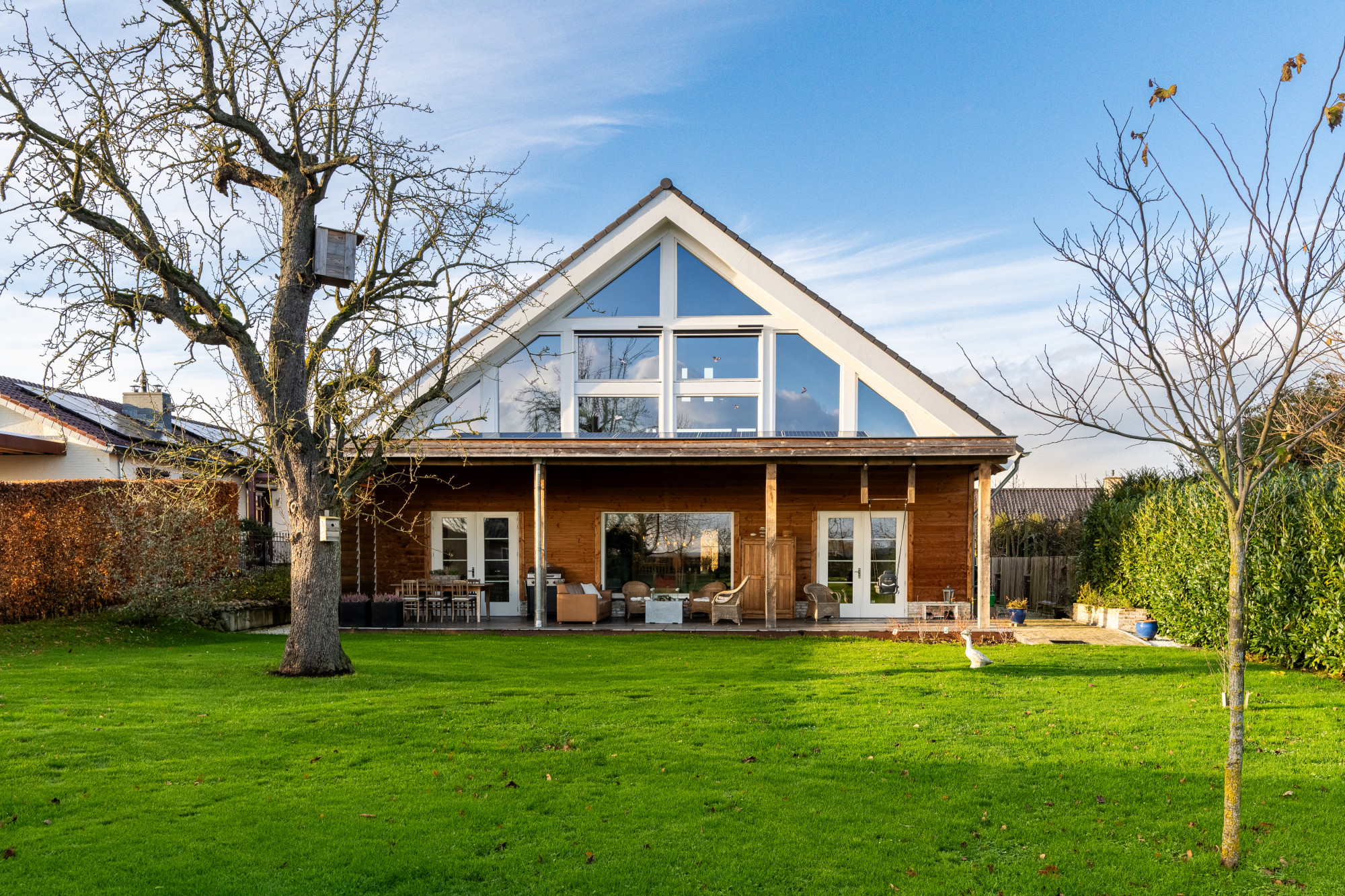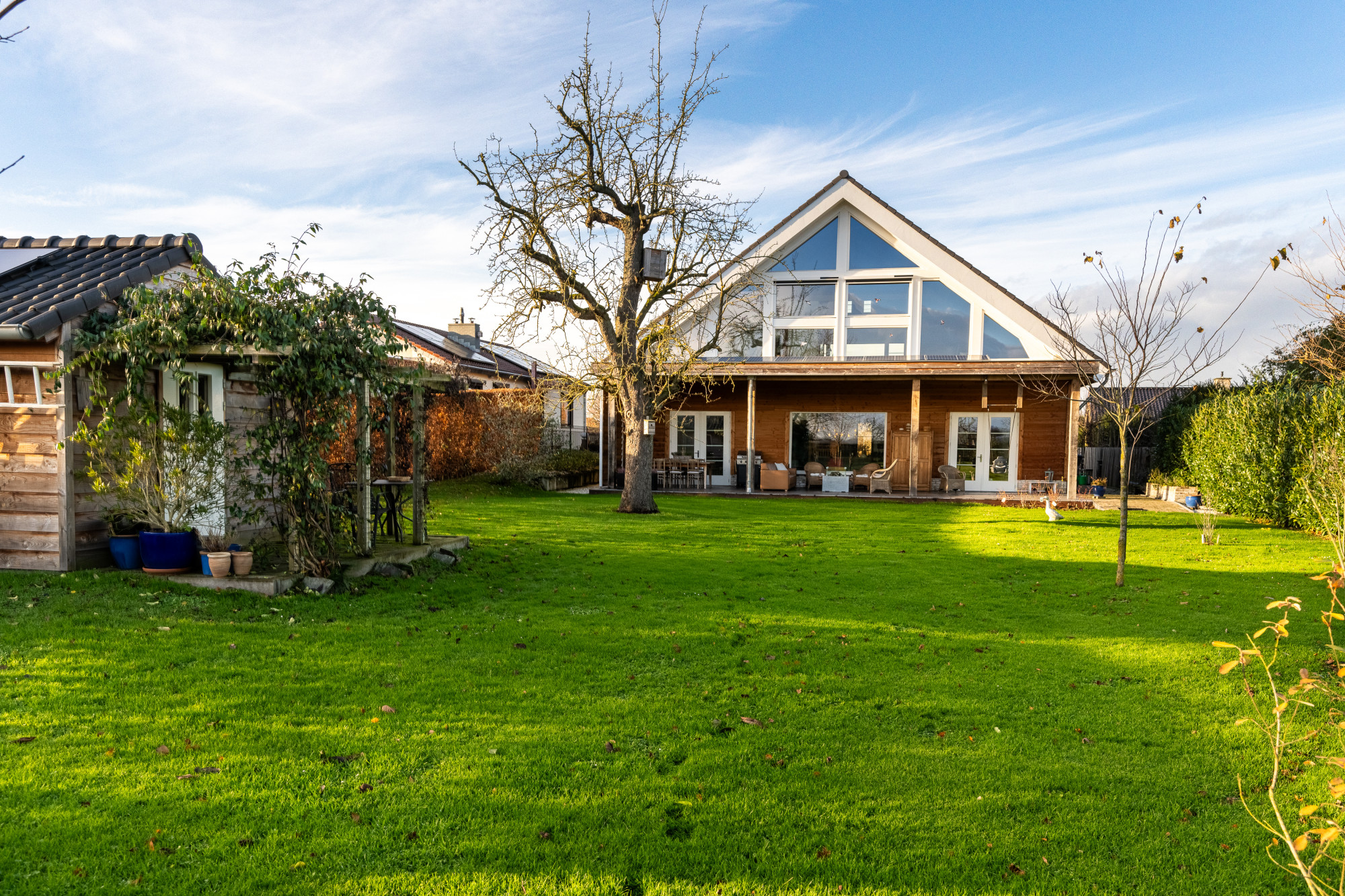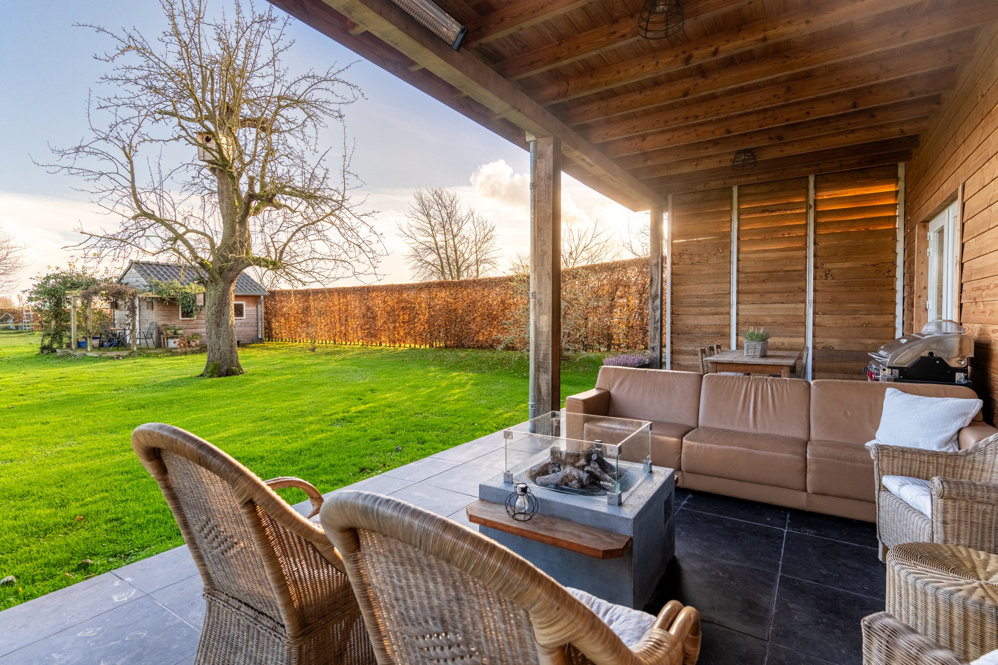De over de gehele breedte van het huis overdekte terras met een Cocoon open haard en infrarood straler zorgt ervoor dat men ook in de koelere dagen optimaal kan blijven genieten.