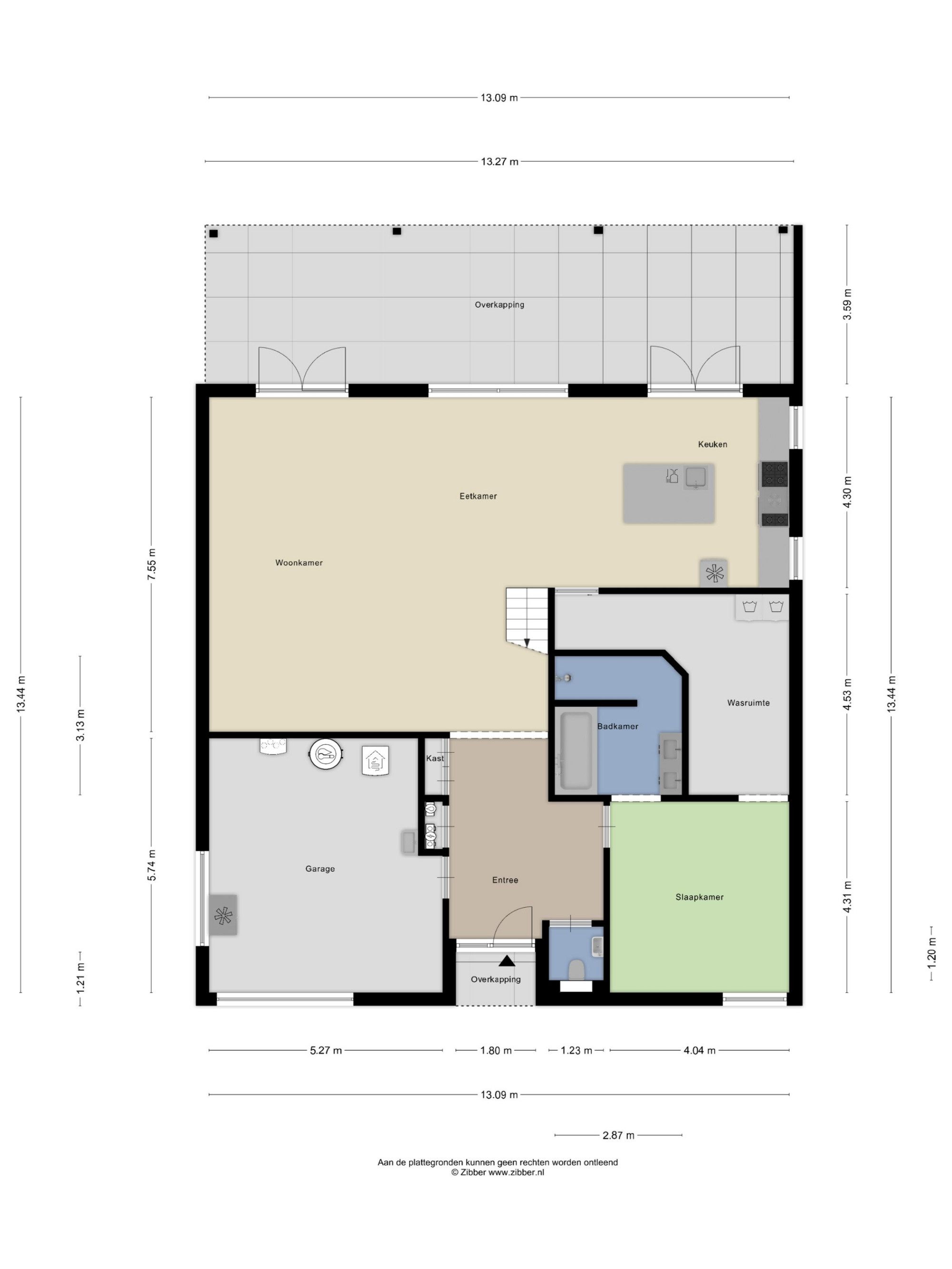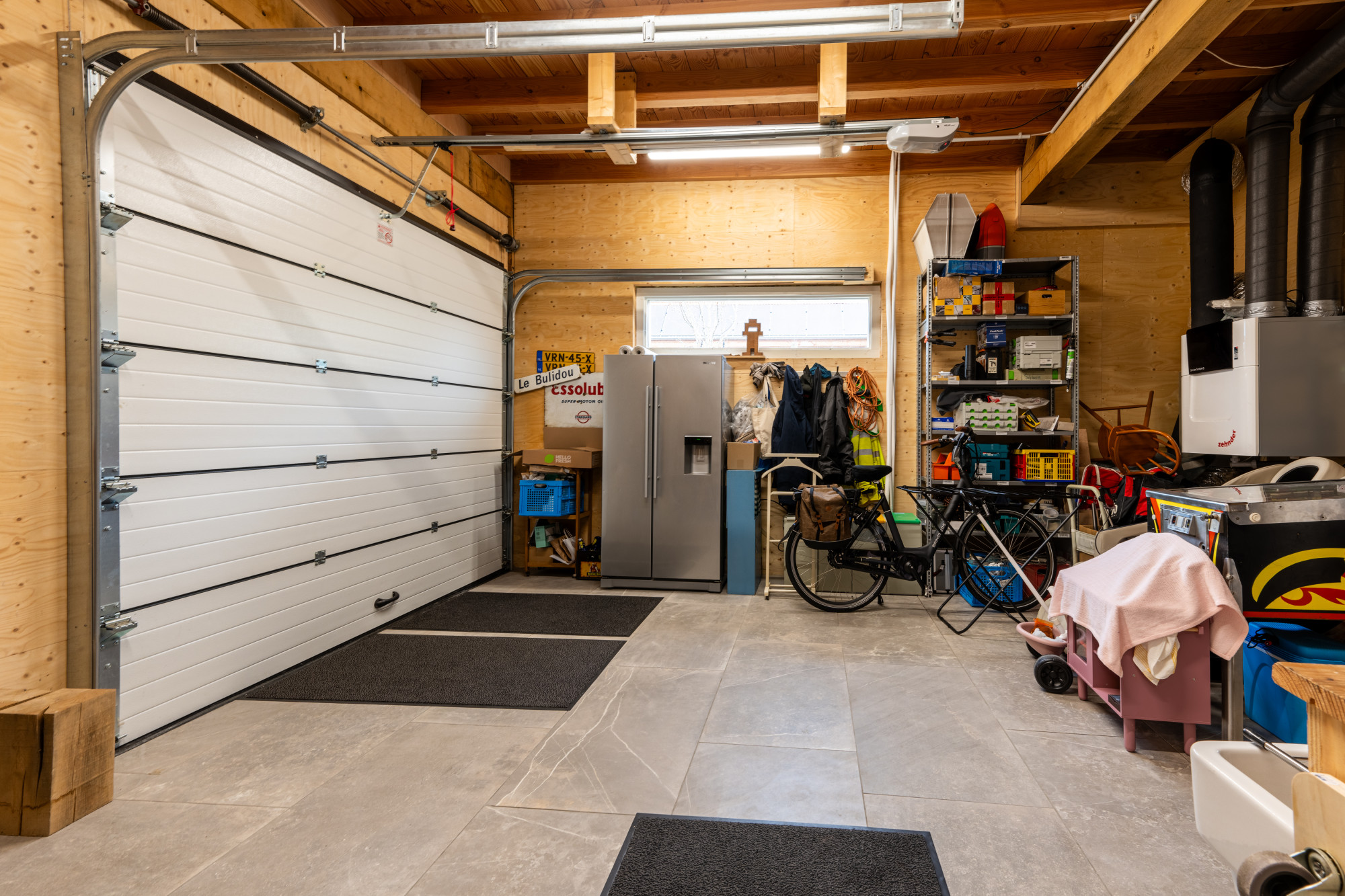 Inpandig bereikbare brede garage (5.74 x 5.27 m) voorzien van elektrisch bedienbare (geïsoleerde) sectionaalpoort, warmtepomp, boiler, WTW installatie, grijswaterpomp en omvormer t.b.v. de zonnepanelen.