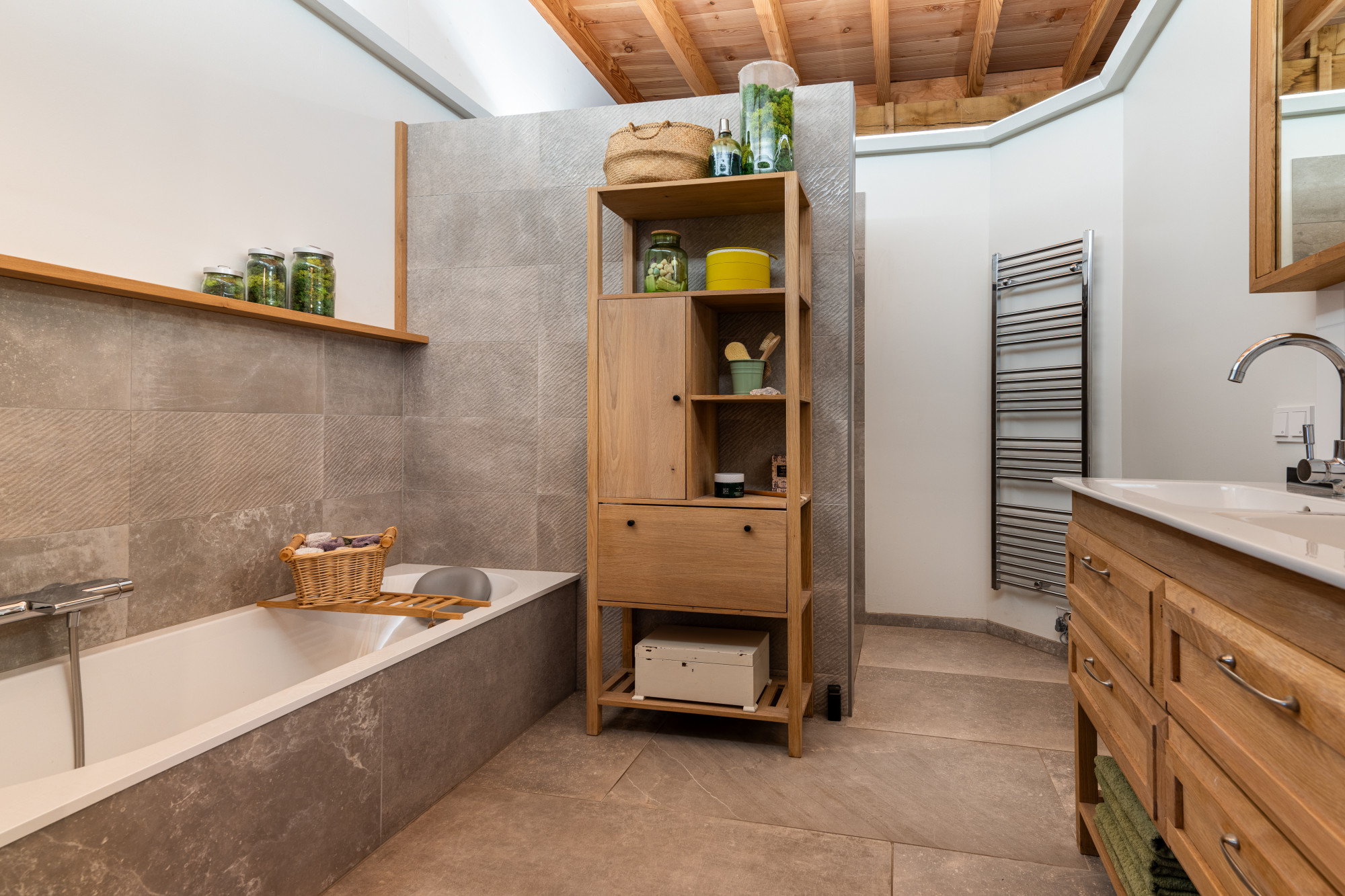 Badkamer 1 bereikbaar vanuit de slaapkamer voorzien van ligbad, dubbele wastafel in badkamermeubelen een ruime inloopdouche met regen/stort douche functie.