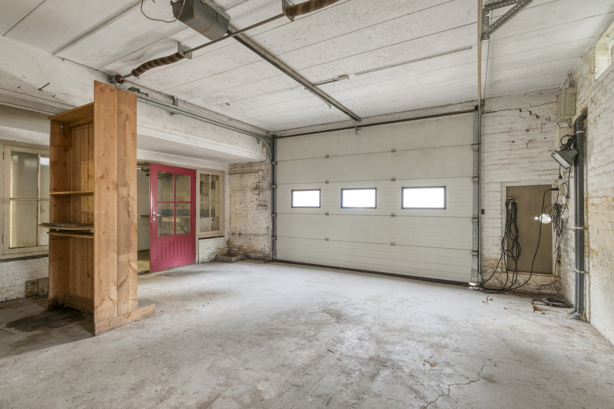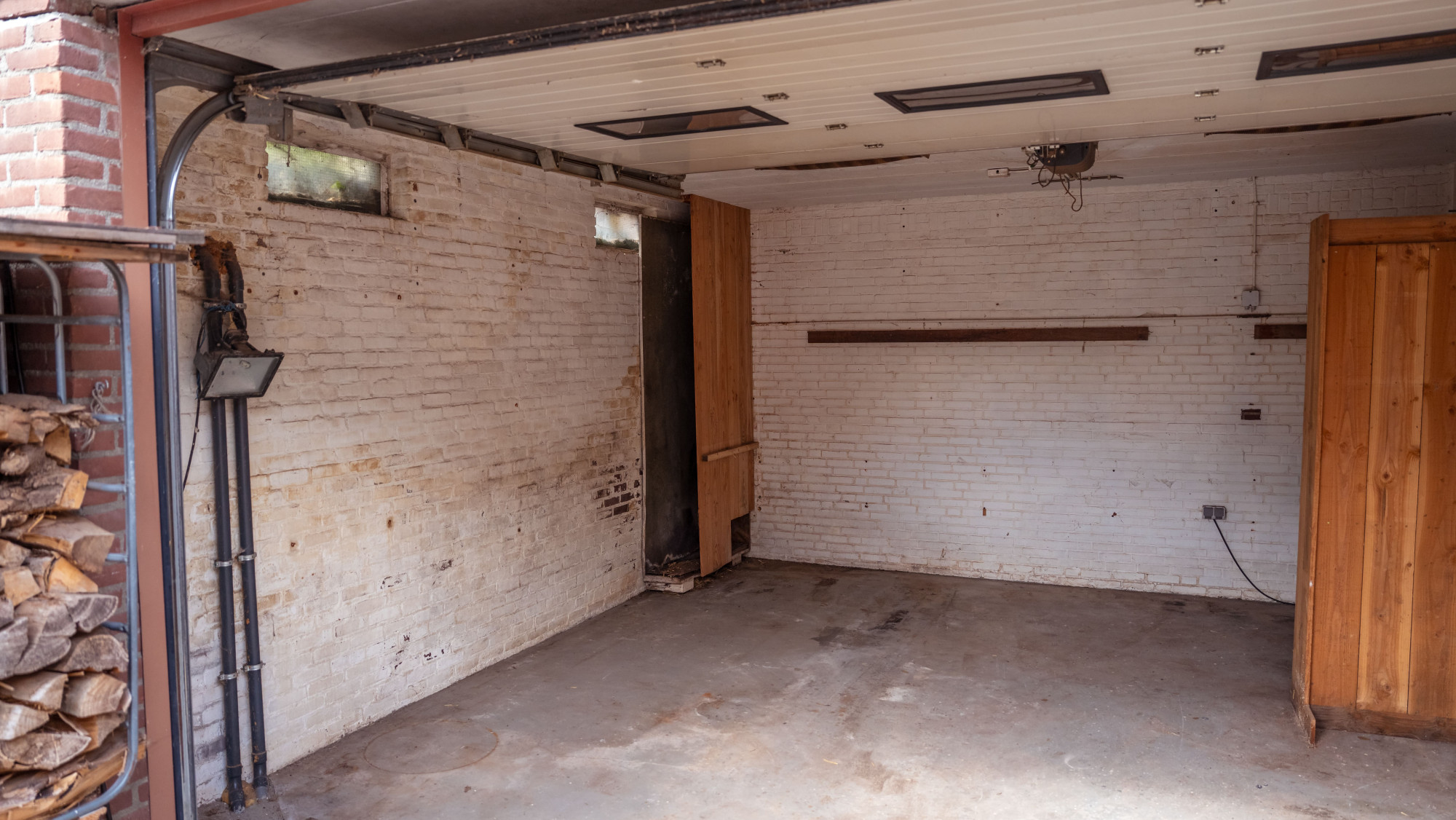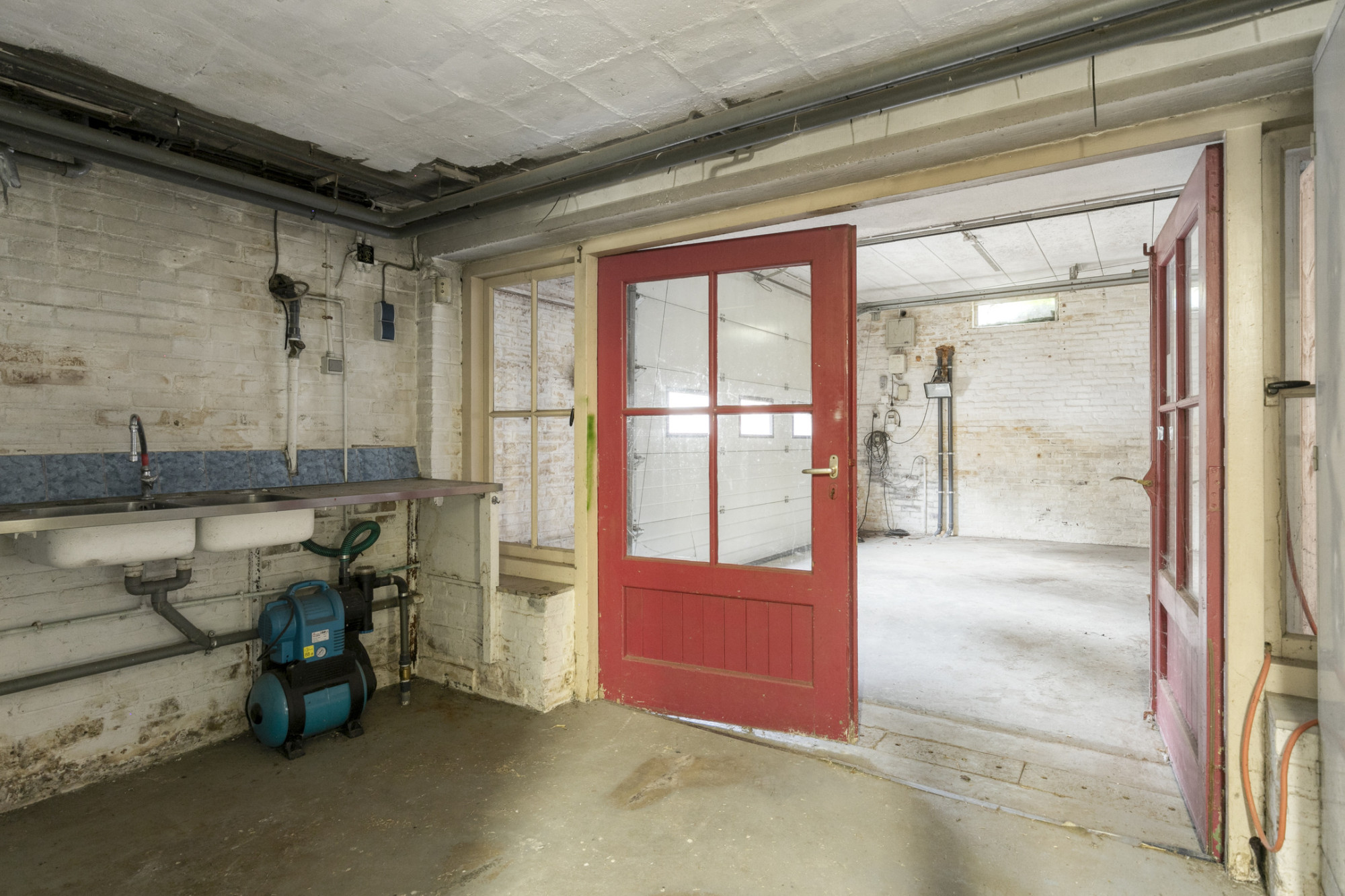 Het hoofdhuis heeft een praktische indeling met een L-vormige woonkamer (ca. 43 m²), een eetkeuken (16 m²), een bijkeuken (15 m²) en vier slaapkamers van respectievelijk 19, 16, 15 en 13 m². Onder het hele huis ligt een kelder met inpandige garage. De tuin rondom biedt veel privacy en groen.