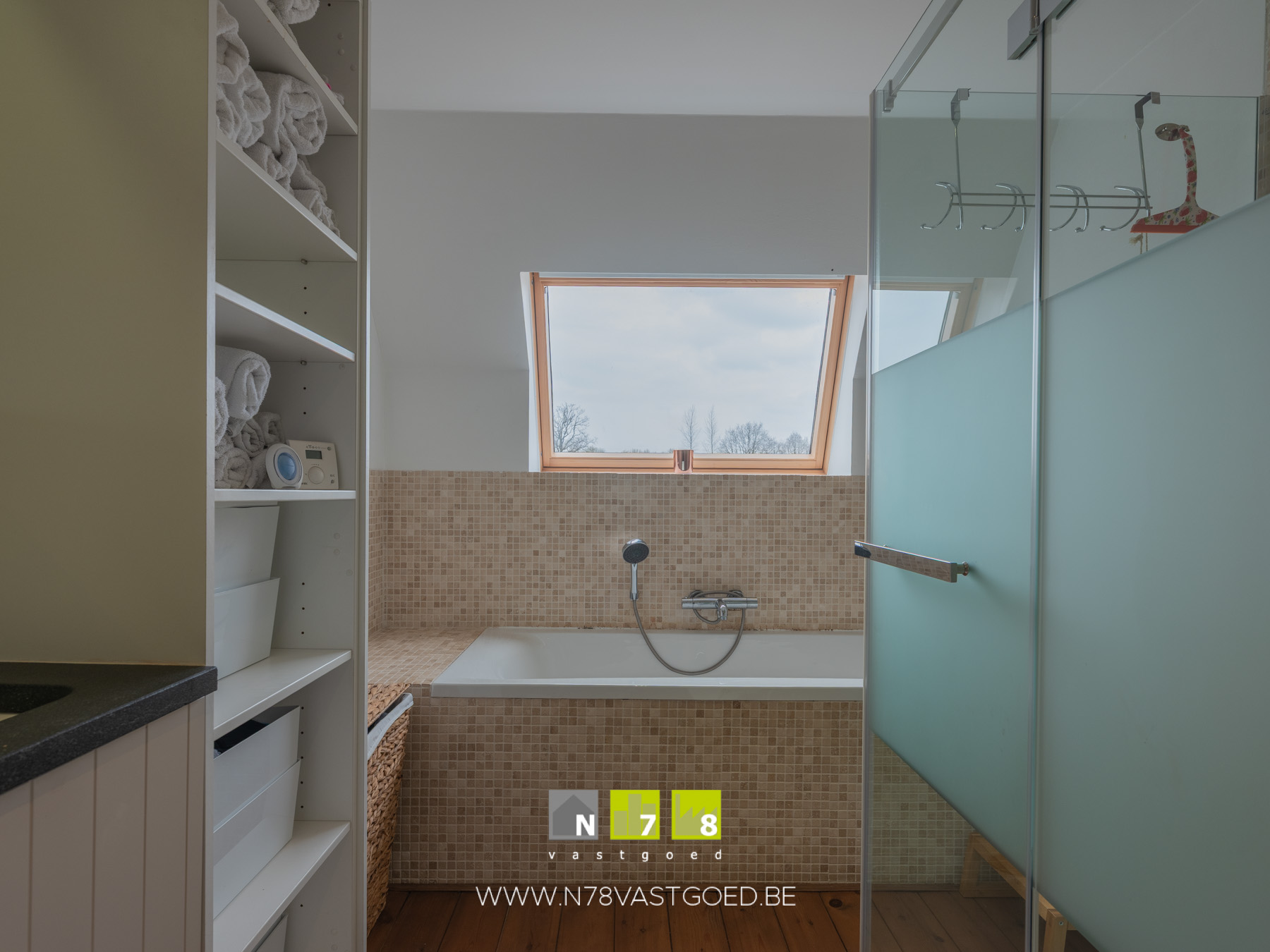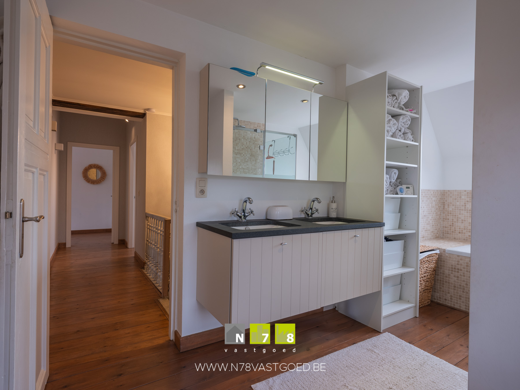 - Badkamer (2,50m x 4,40m = 11,00m²): badkamermeubel (dubbele lavabo, spiegel- & onderkasten), ligbad, douche, zittoilet, Velux dakraam, houten vloer.