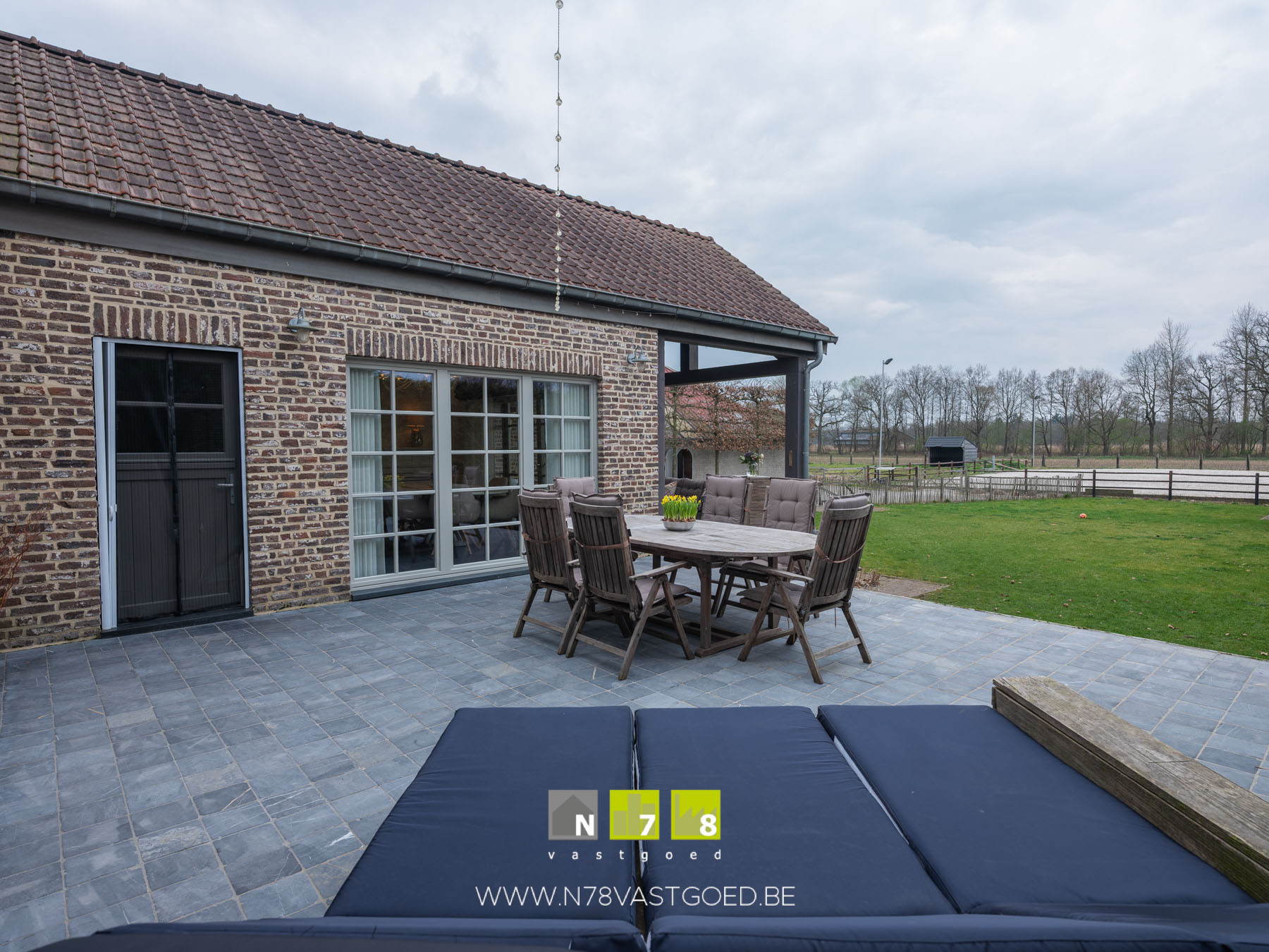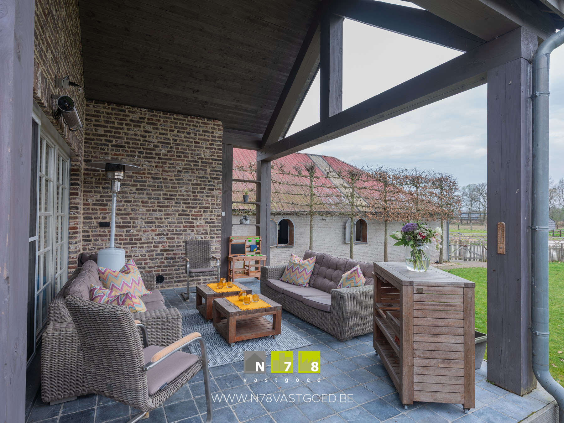 - Overdekt terras (4,70 m x 3,50m =16,45m²): grenzend aan keuken, natuurstenen vloer.