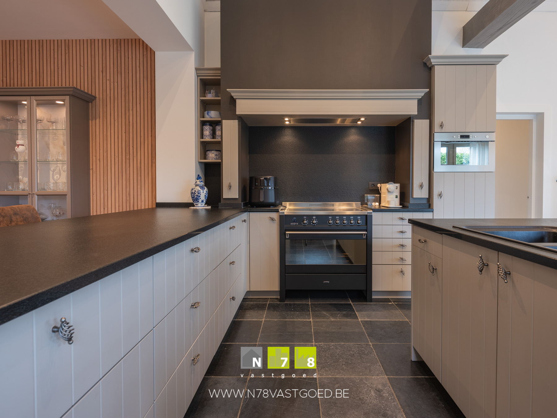 - Leefkeuken (4,70m x 6,00 = 28,20m²): voorzien van onder- en bovenkasten, eiland met dubbele spoelbak en vaatwasser, microgolf, oven, inductiekookplaat, dampkap, koelkast, natuurstenen werkblad. Veel lichtinval (dubbele, glazen deuren naar terras, ruimtelijk en gezellig gevoel, natuurstenen vloer.