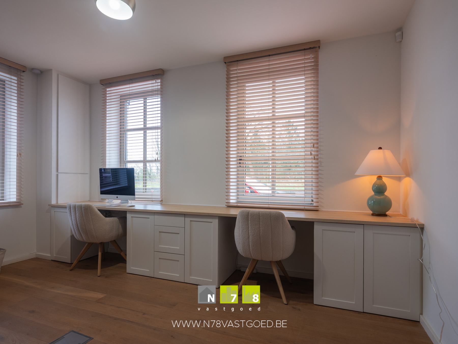 - Slaapkamer 1/bureau (4,66m x 4,59m = 21,38m²): parketvloer.