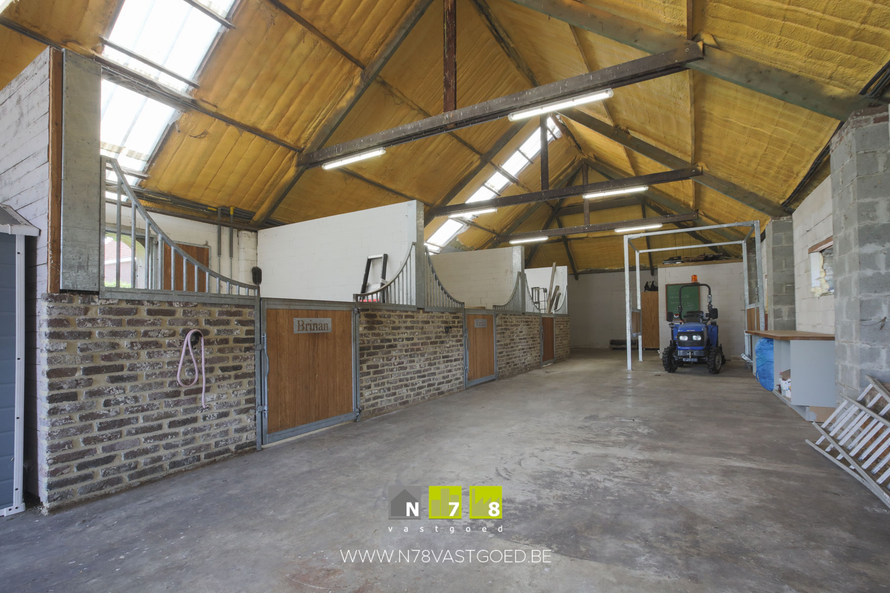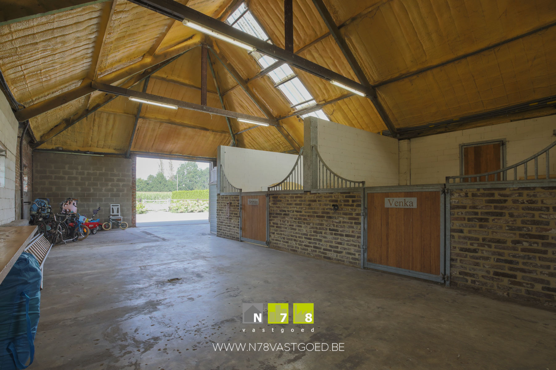 - Stal (21,90m x 9,50m = 208,05m²): voorzien van 3 paardenboxen, berging (regen -en grondwaterpomp), zadelkamer, wasruimte (paarden), anti-vriessyteem voor het drinkwater van de paarden, hoogte onder spanten 3,8m, zadeldak (Steeldeck, geïsoleerd met PUR), poort (3,50m breed, 3,00m hoog).