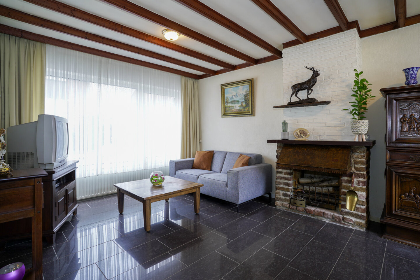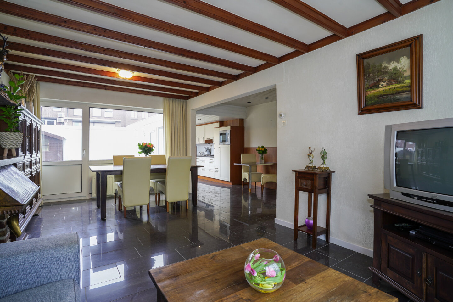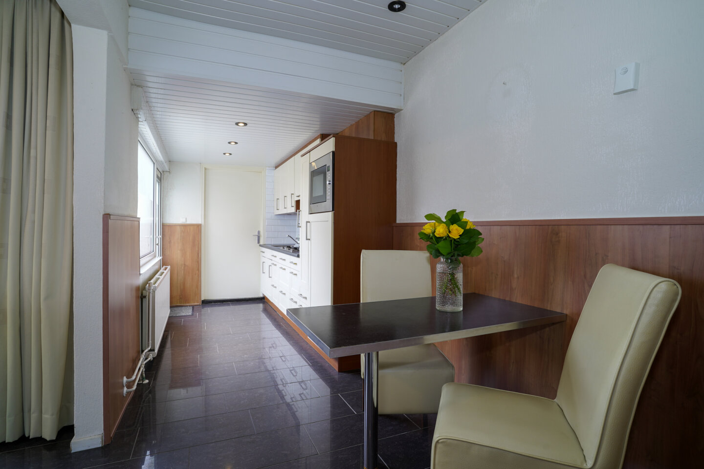 Woonkamer met een halfopen keuken voorzien van gaskookplaat, oven, afzuigkap en ruime bijkeuken.