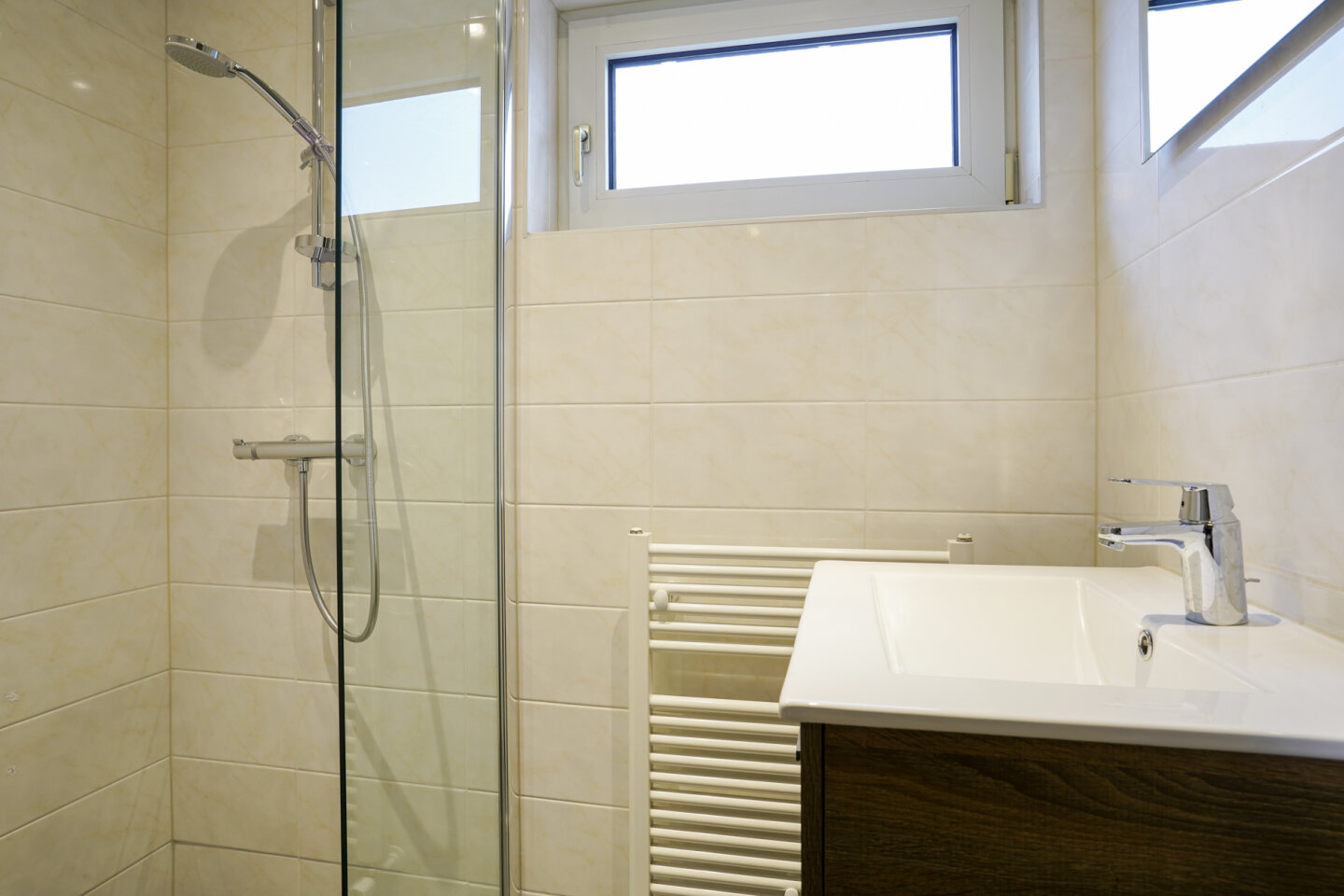 Badkamer met tegelvloer voorzien van douche en wasbak.