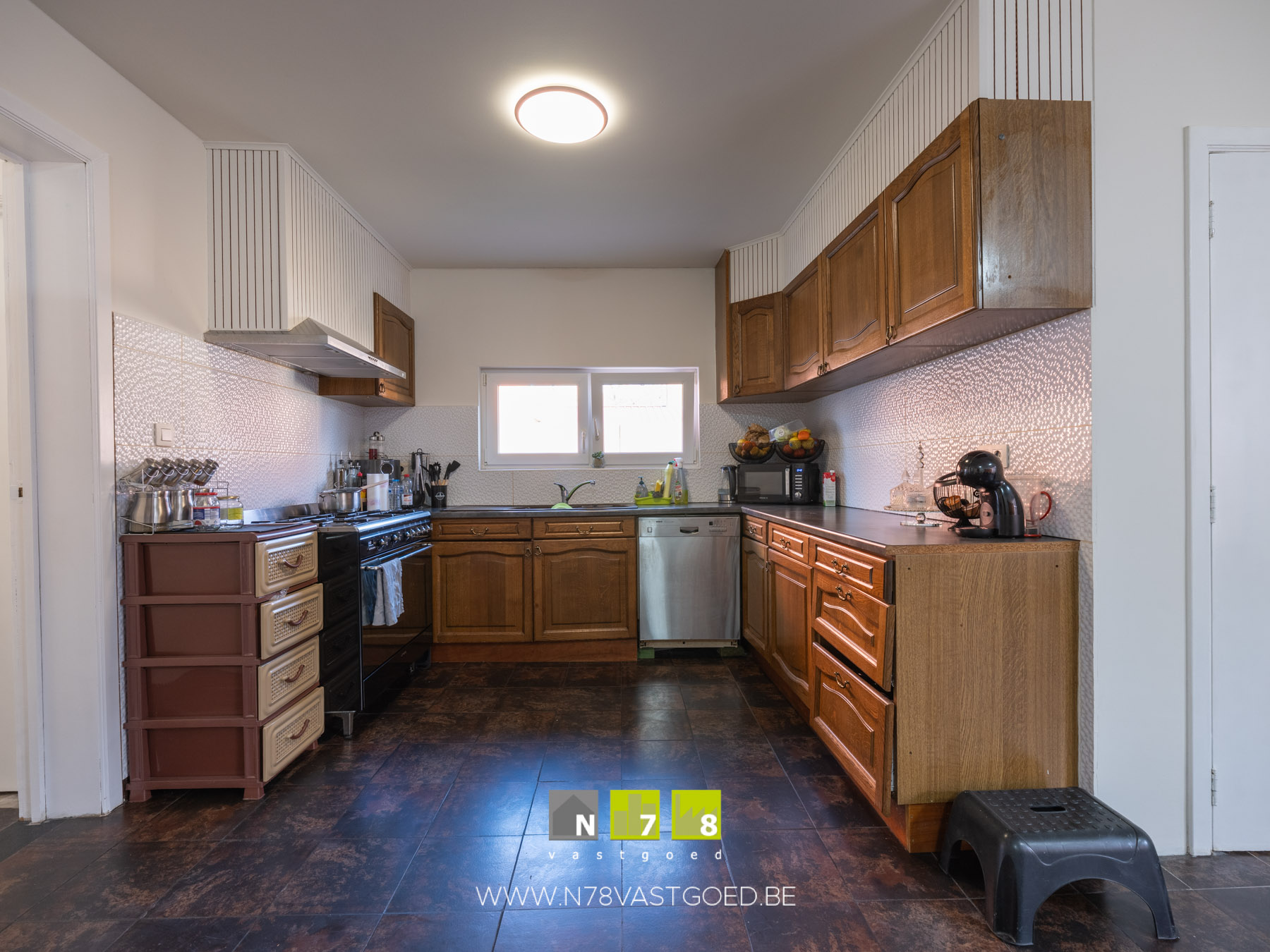 - Keuken ((3,01m x 2,41m) + (4,70m x 5,42m) = 32,72m²): onder- en bovenkasten, lades, gasvuur, dampkap, oven, vaatwasser, aansluiting wasmachine, tegelvloer.