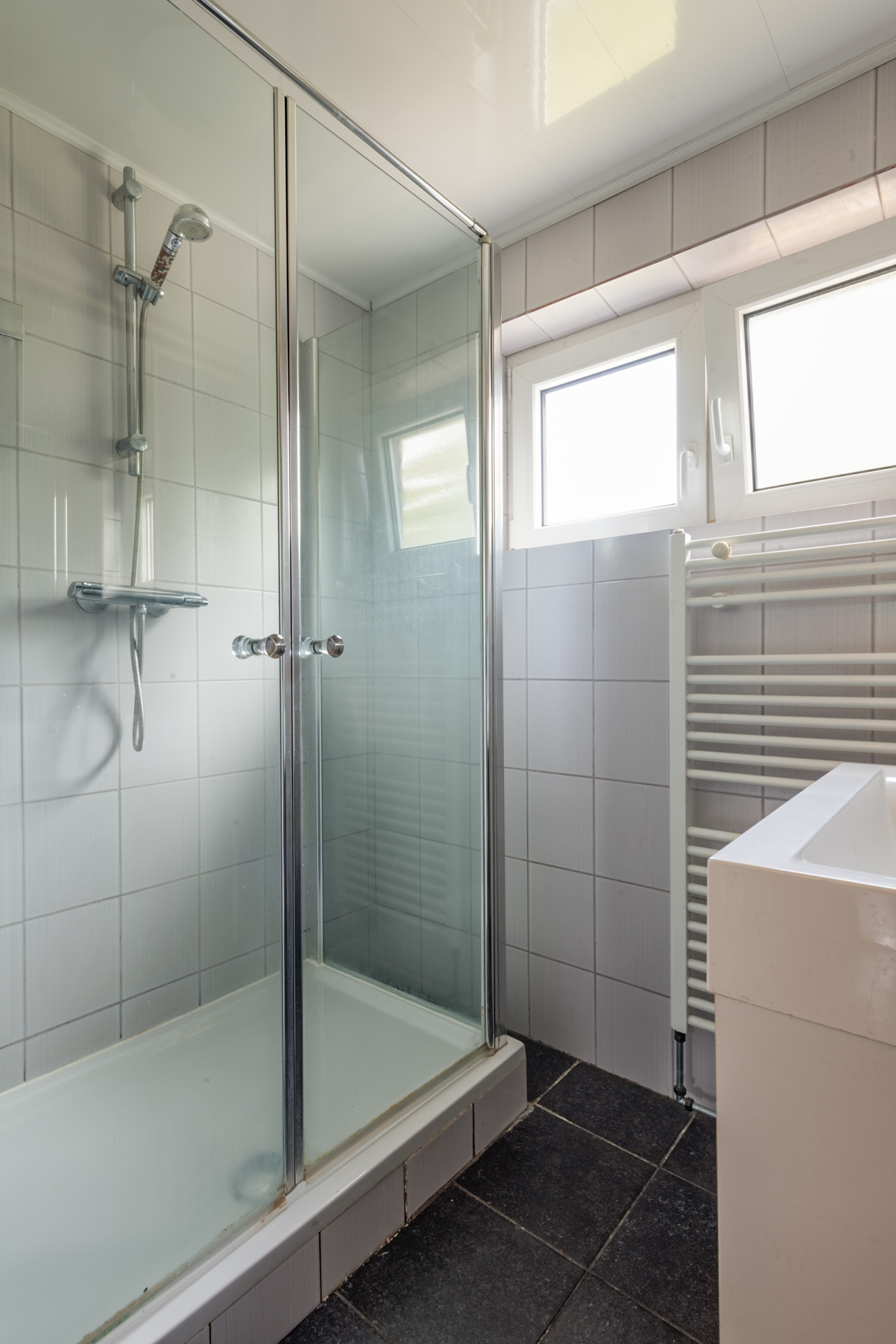 Overloop met toegang naar de 2 slaapkamers, werkkamer badkamer. De grootste slaapkamer (449 x 346 cm) is aan de achterzijde gesitueerd. Hier direct naast bevindt zich de werkkamer (348 x 246 cm). Aan de voorzijde vinden we de 2e slaapkamer (341 x 283 cm) en de badkamer (193 x 146 cm). Deze is uitgerust met een ruime douche en enkele wastafel met meubel. Tijdloos tegelwerk op vloer en wanden zorgen voor een onderhoudsvrije ruimte.