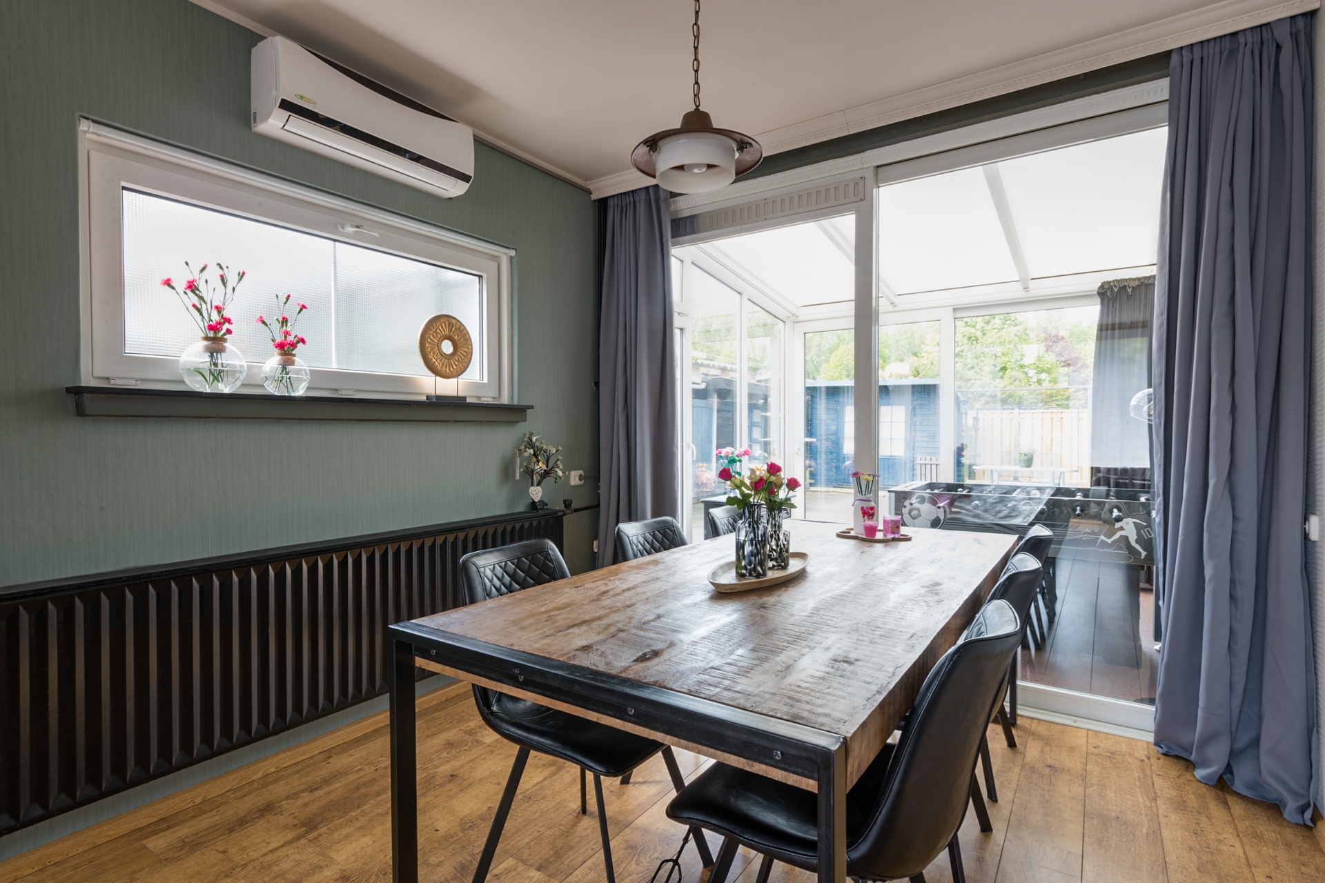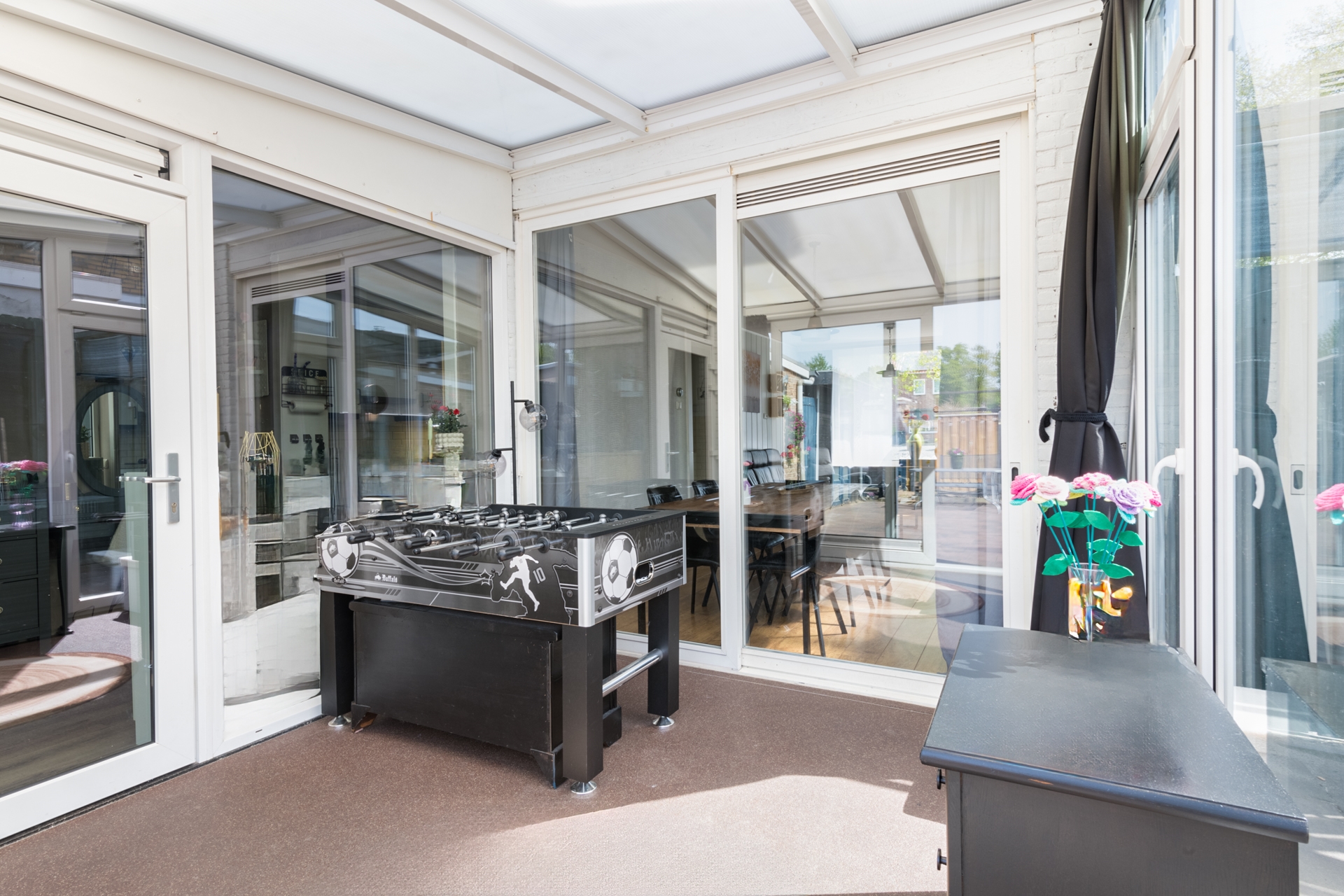 Achter de keuken zijn 2 ruimtes aangebouwd. Hier is de voorste uitgevoerd als verlenging van de keuken. Je kunt ook via deze ruimte de serre in. Helemaal achterin is de feitelijke bijkeuken met wasvoorzieningen.