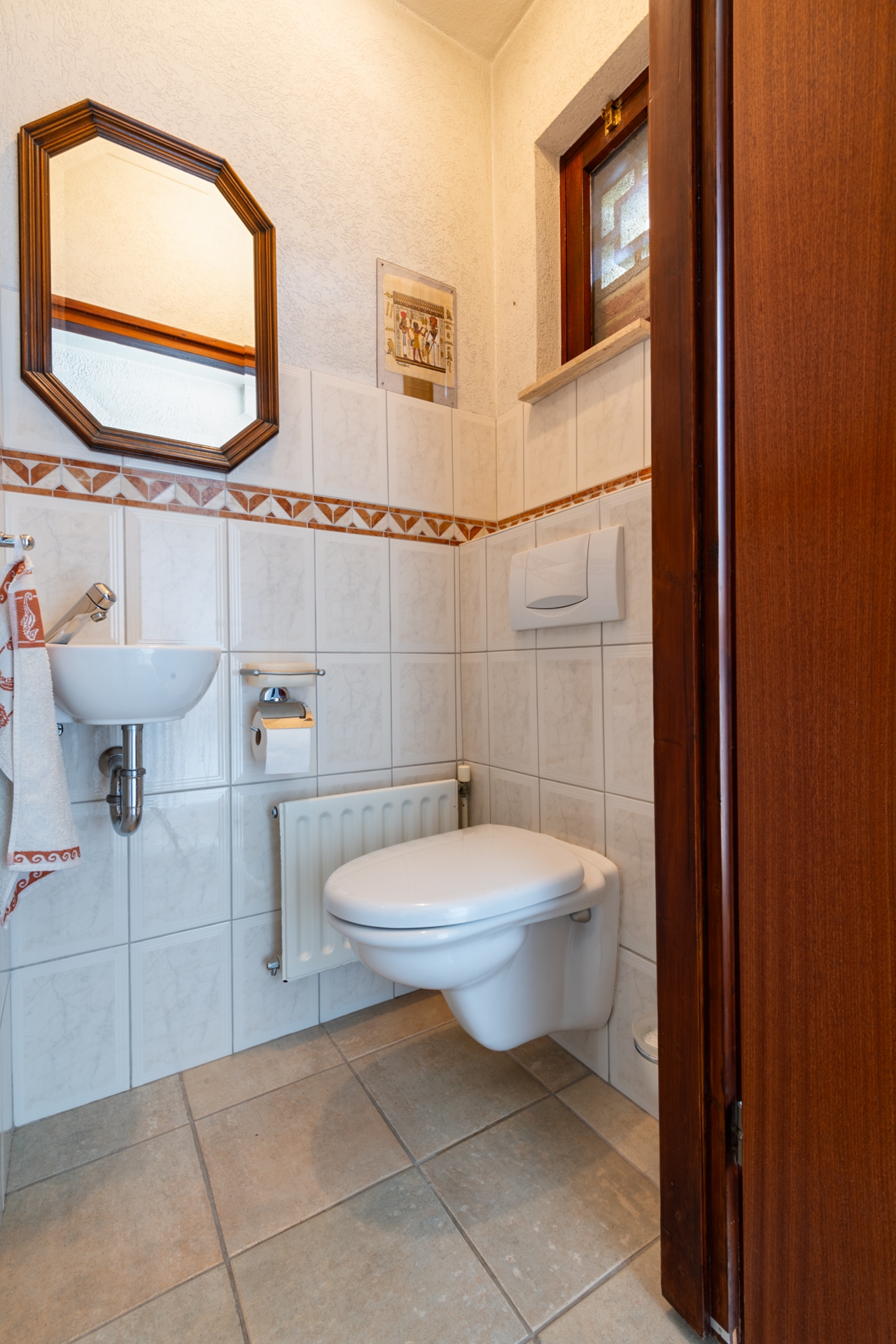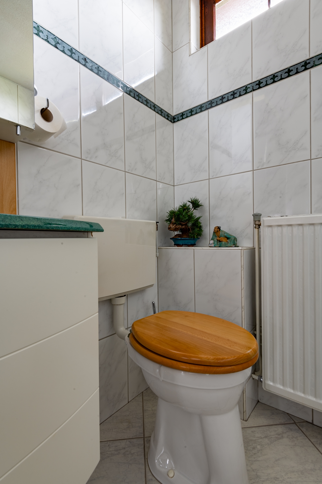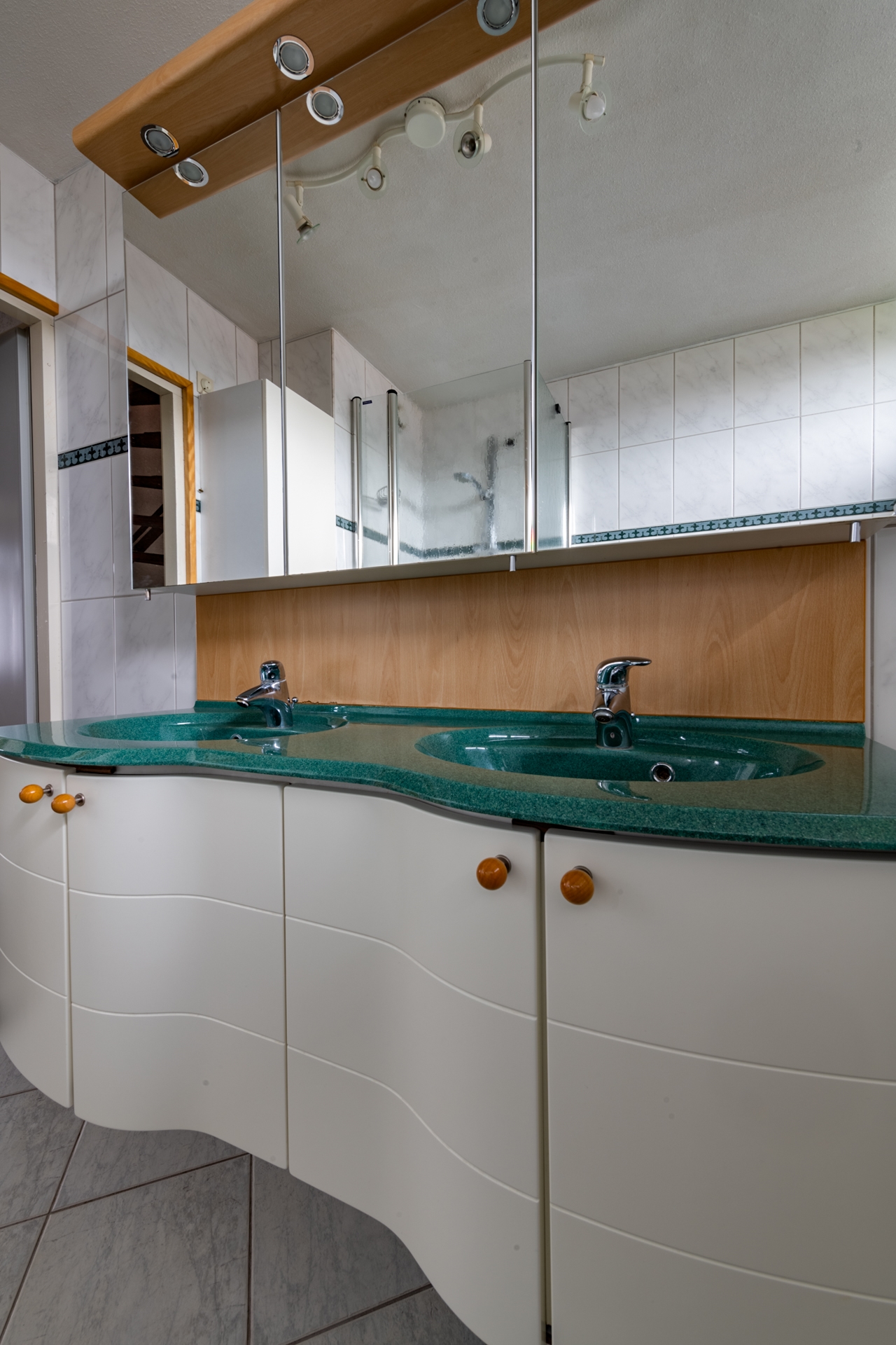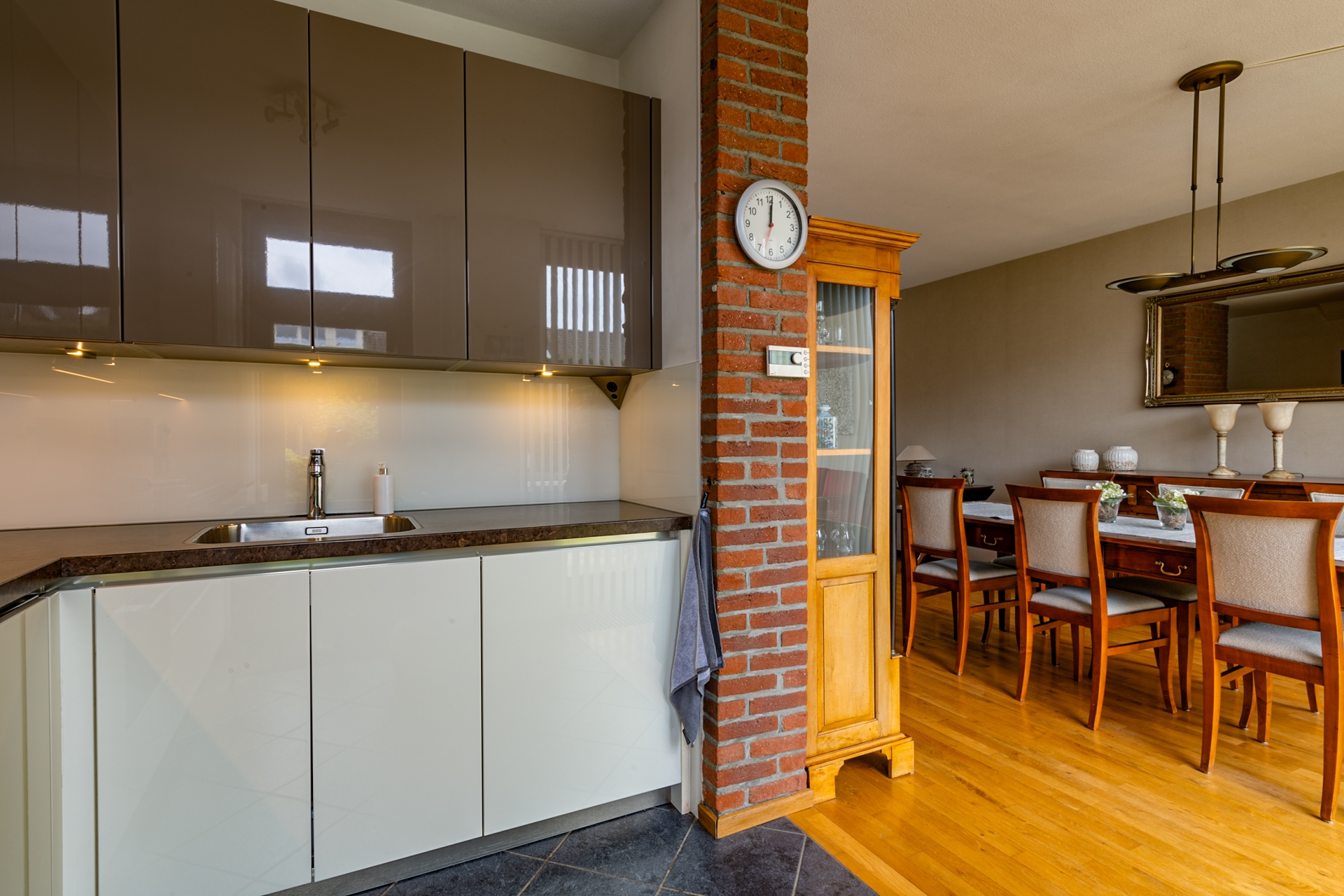 Op de vloer ligt een tegelvloer en de achterwand op het werkblad is van glas. Niet alleen fraai, maar ook zeer onderhoudsvrij.