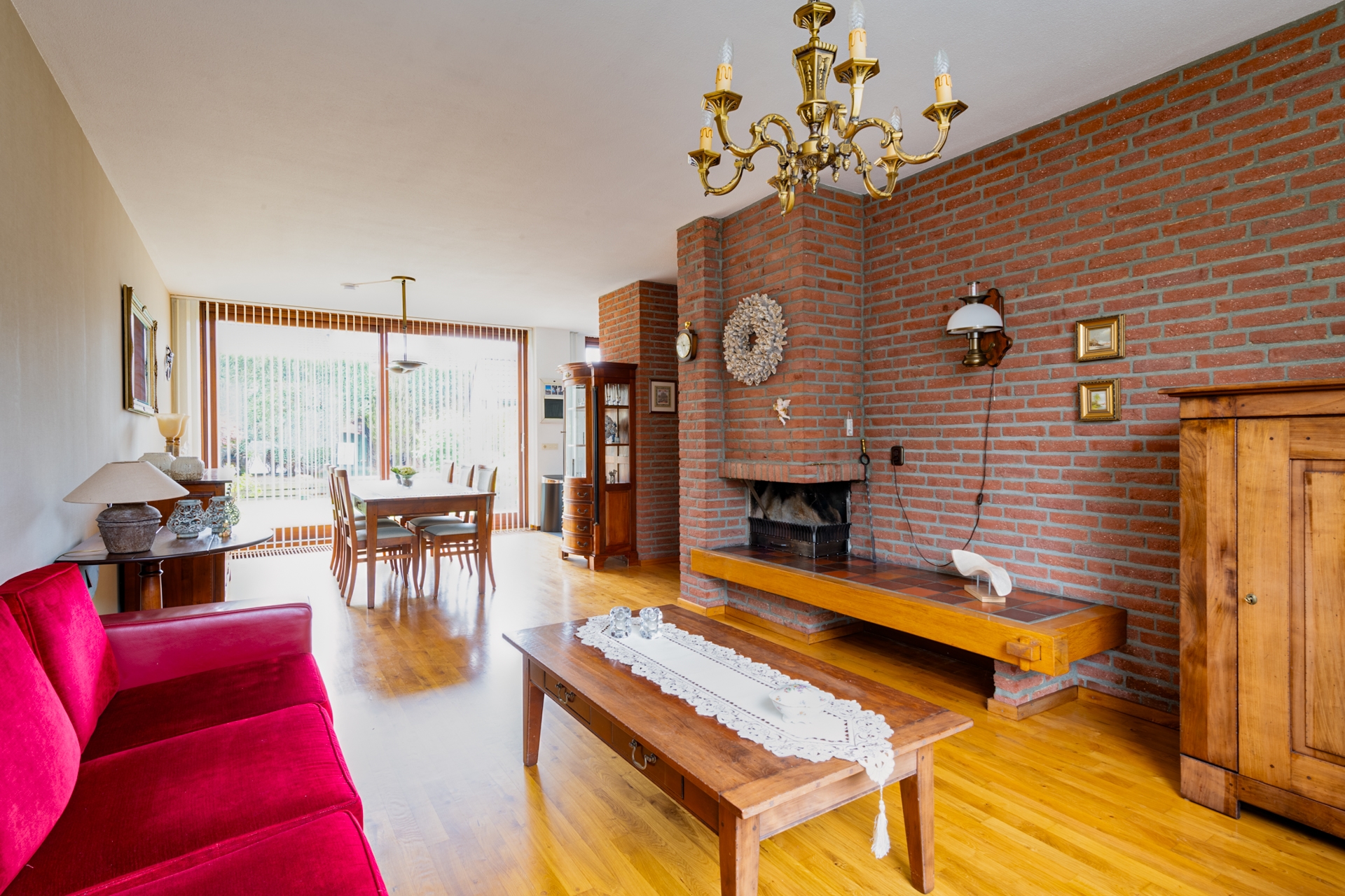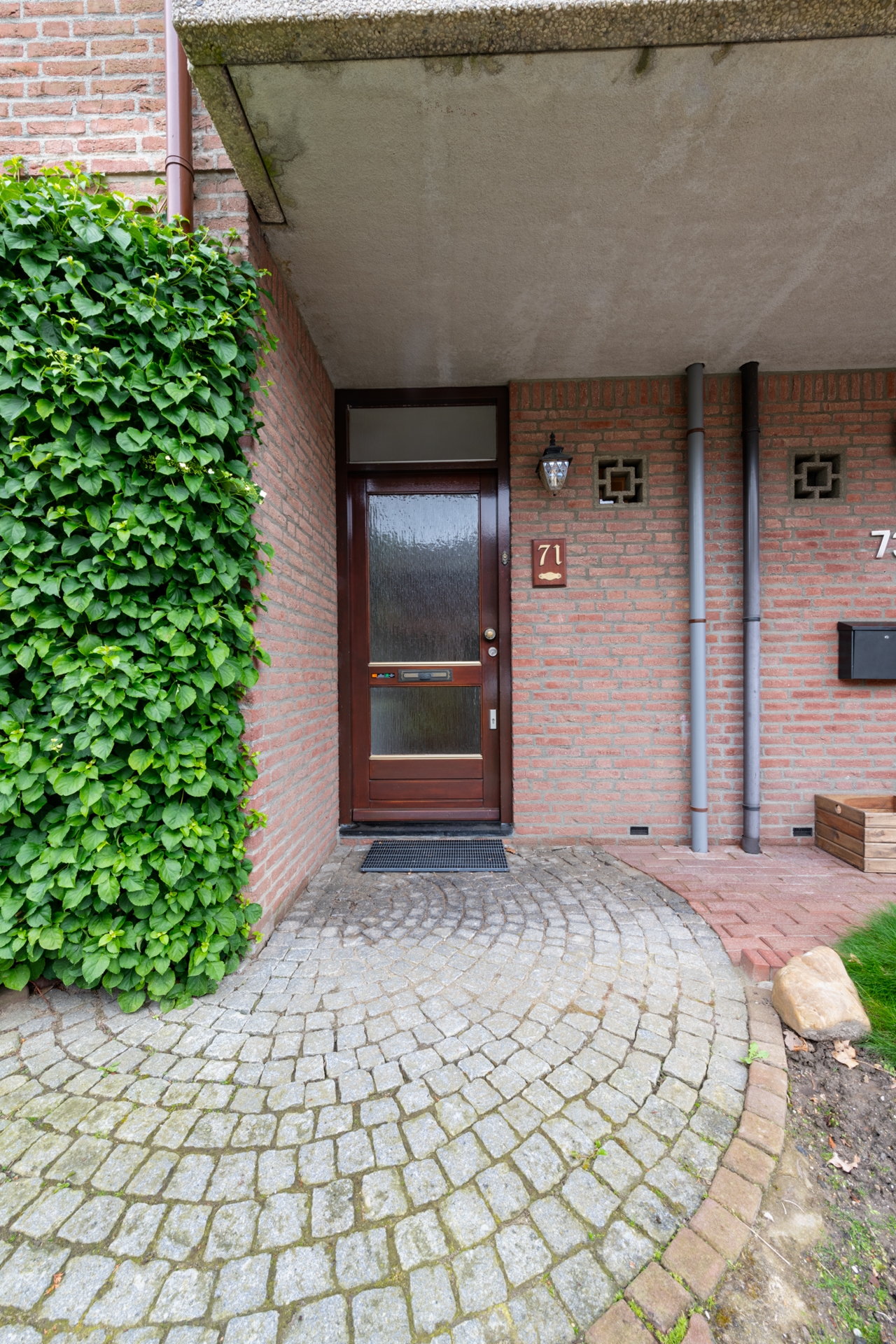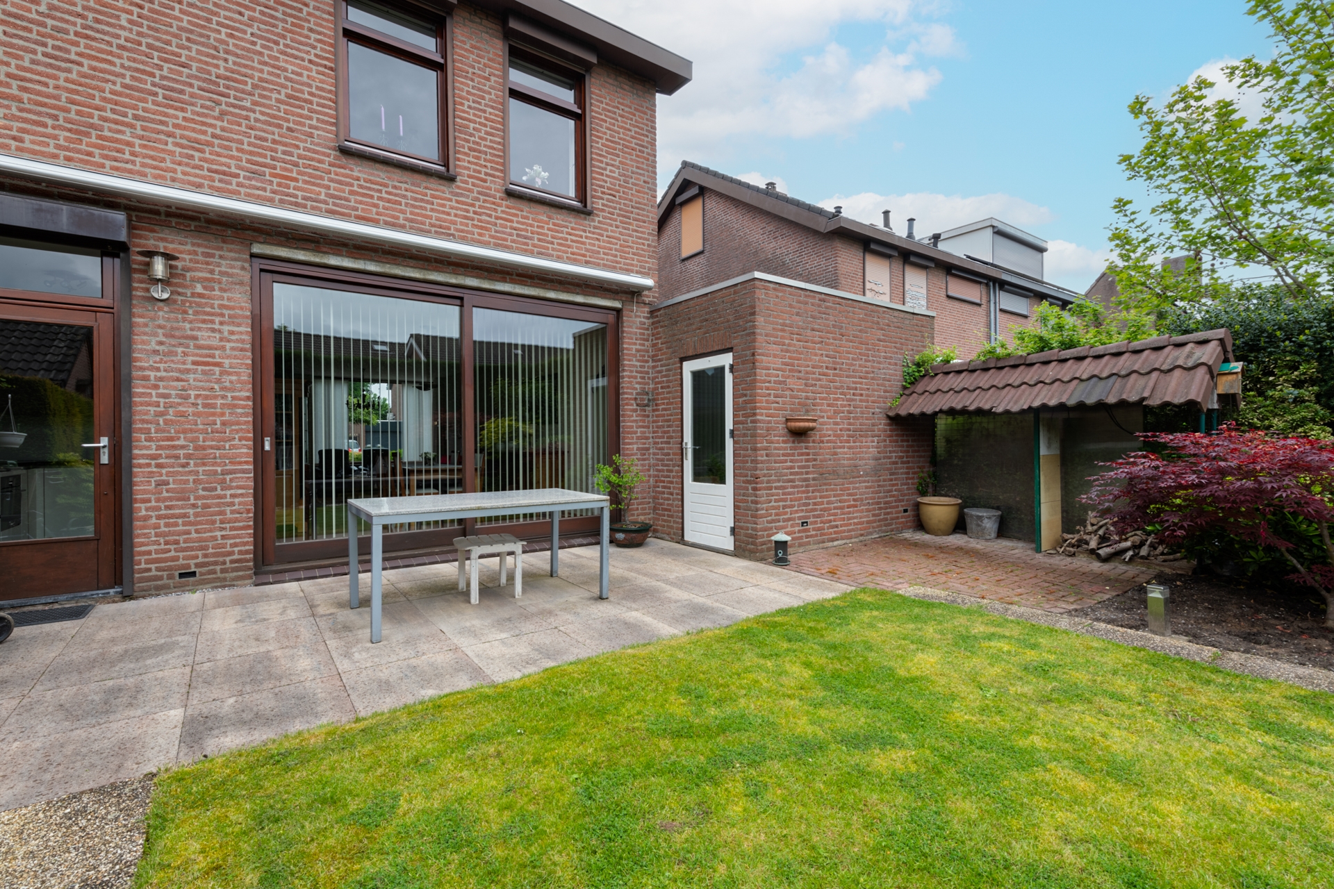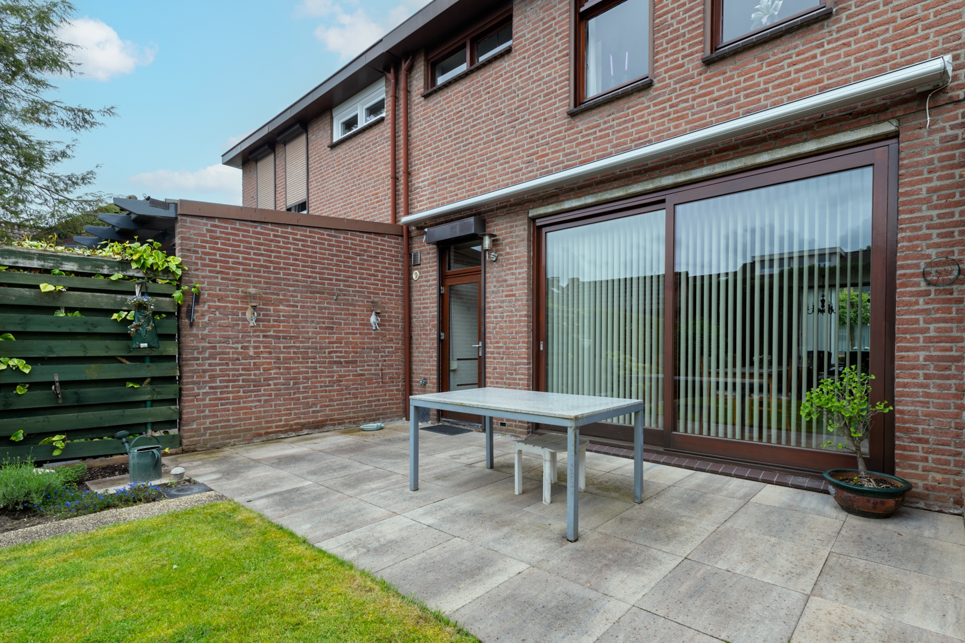 Op het aangelegde terras is het in de zomermaanden heerlijk vertoeven. Een grote tafel en/of tuinbank vinden hier gemakkelijk een plaats. En met de zonwering houden we het wat langer uit in de schaduw. Via de loopdeur in de keuken, maar ook door de schuifpui in de woonkamer lopen we in en uit.