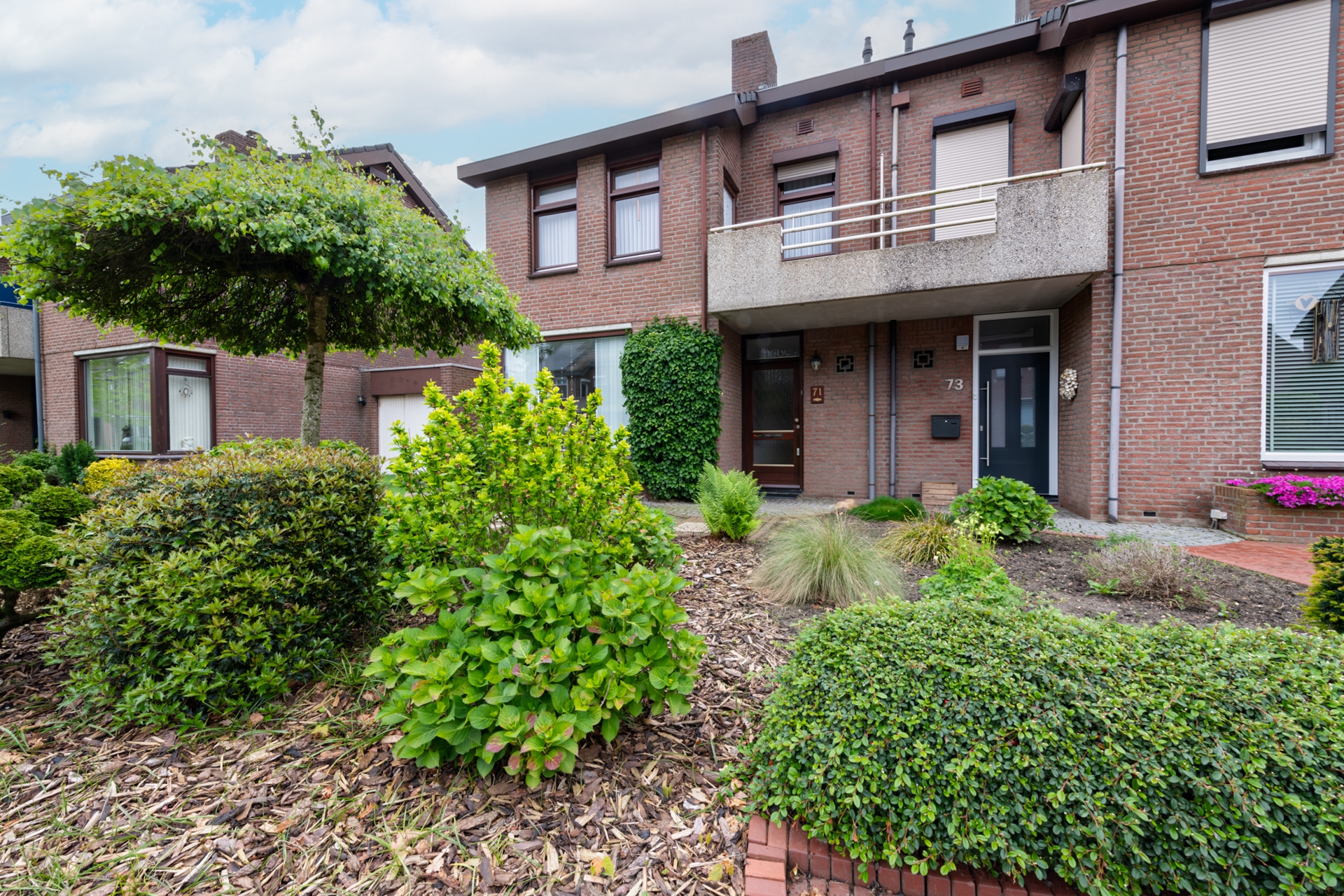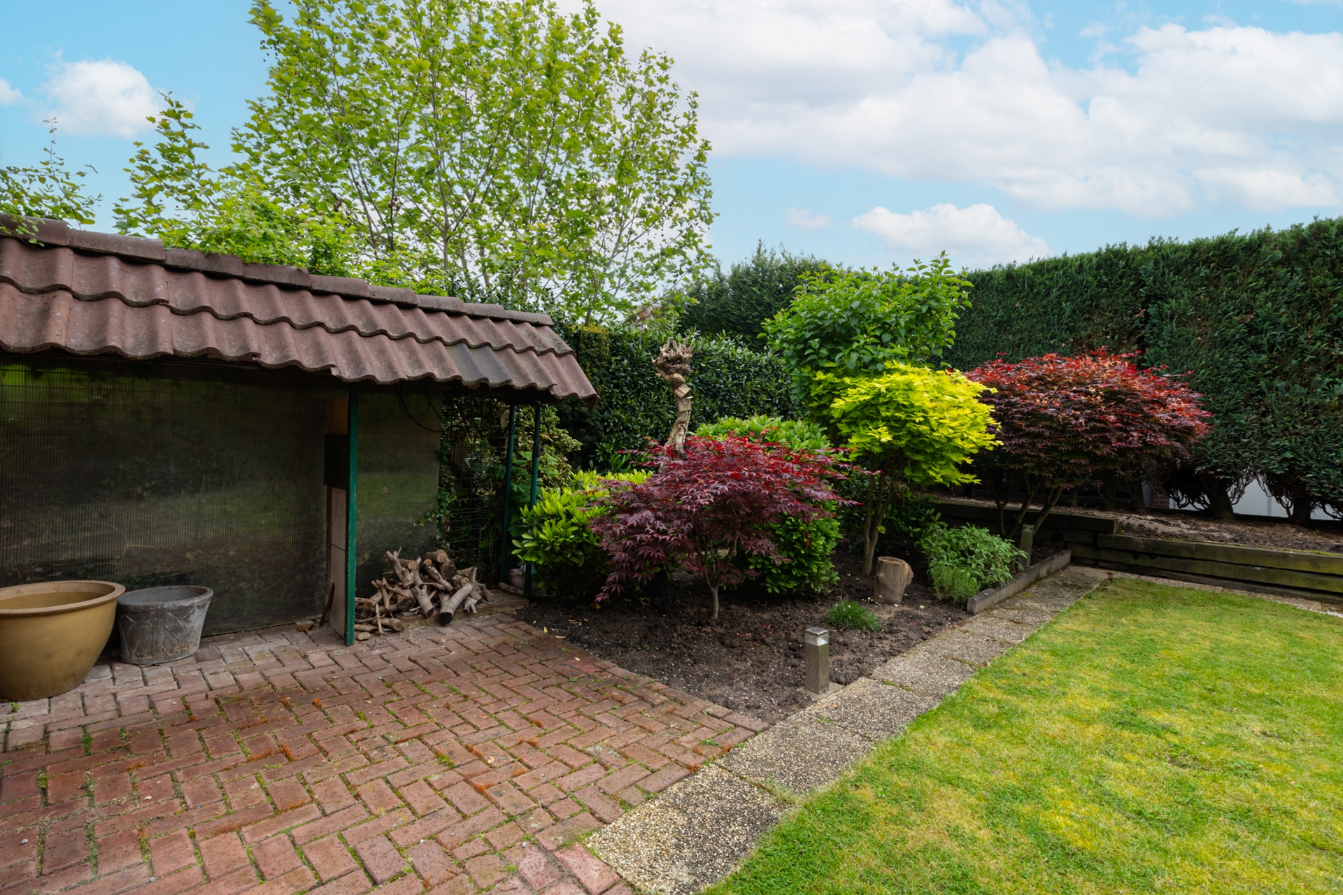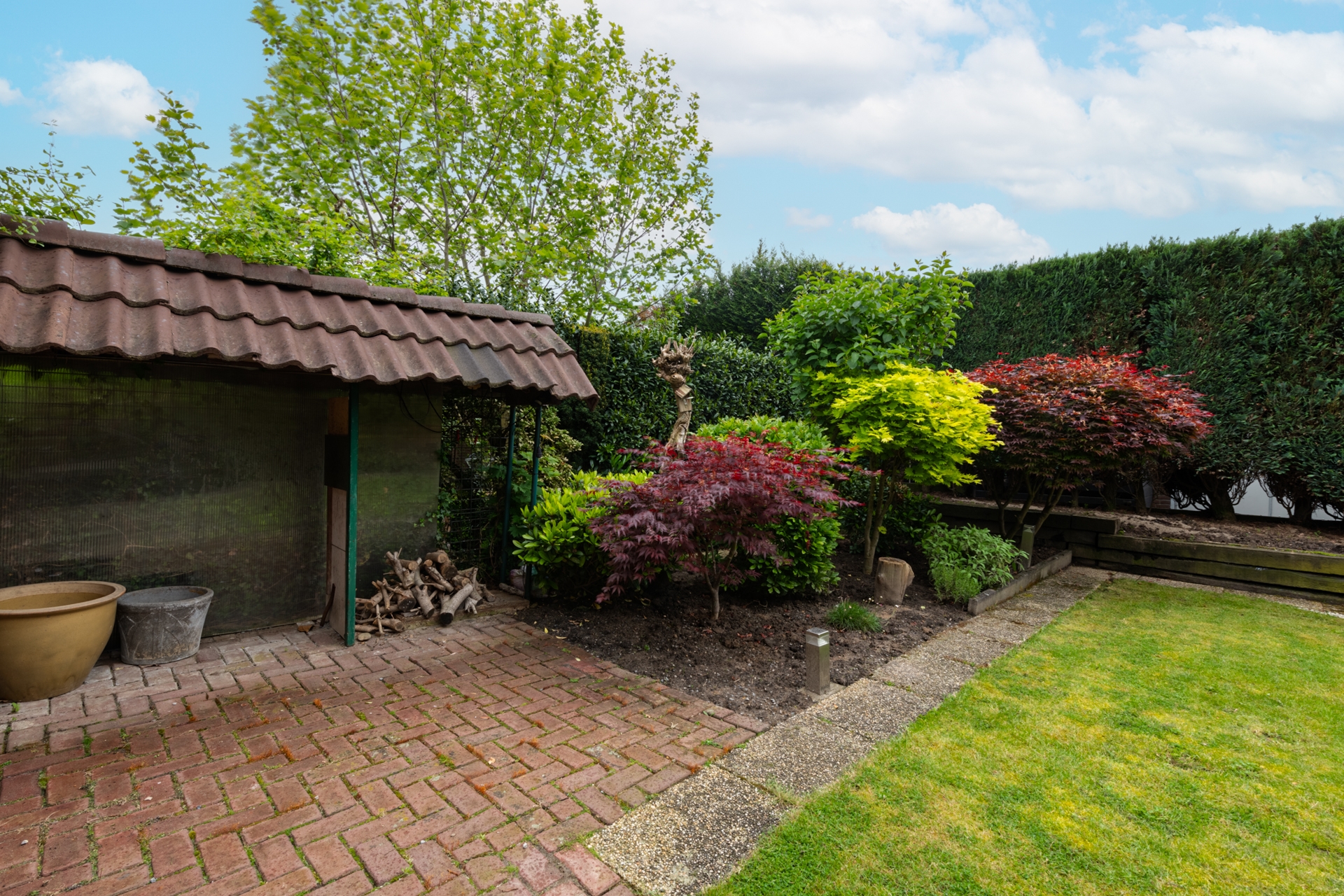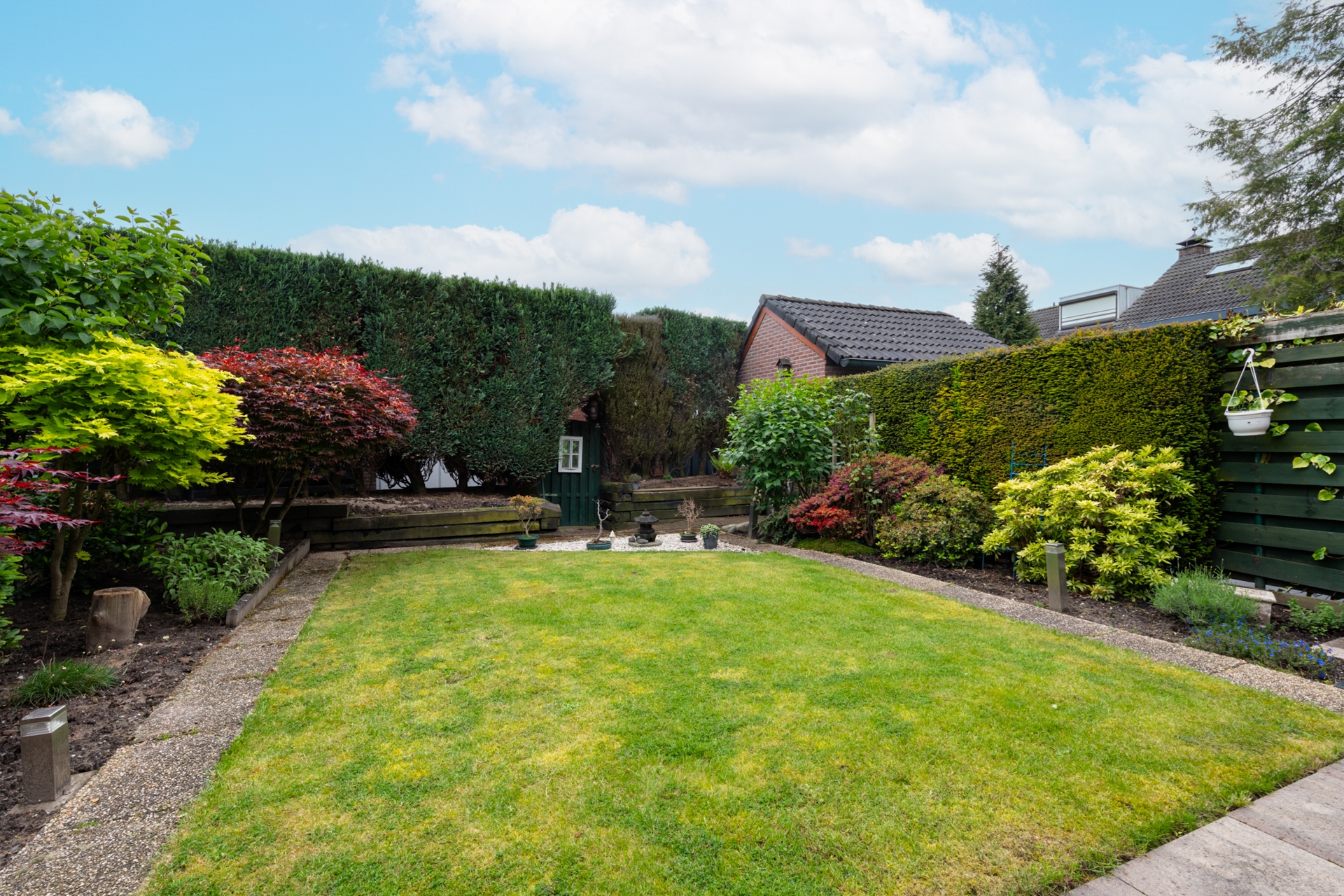 De zonnige achtertuin op het zuiden is mooi aangelegd. Wat overigens ook geldt voor de voortuin.