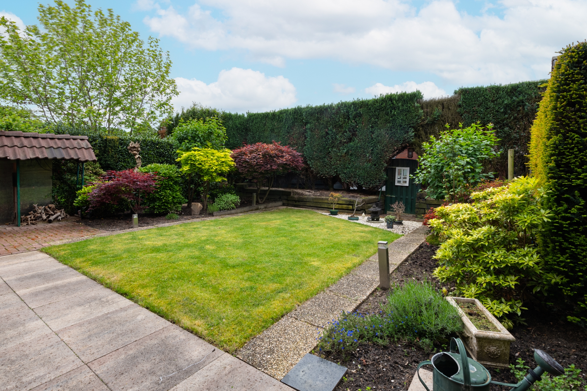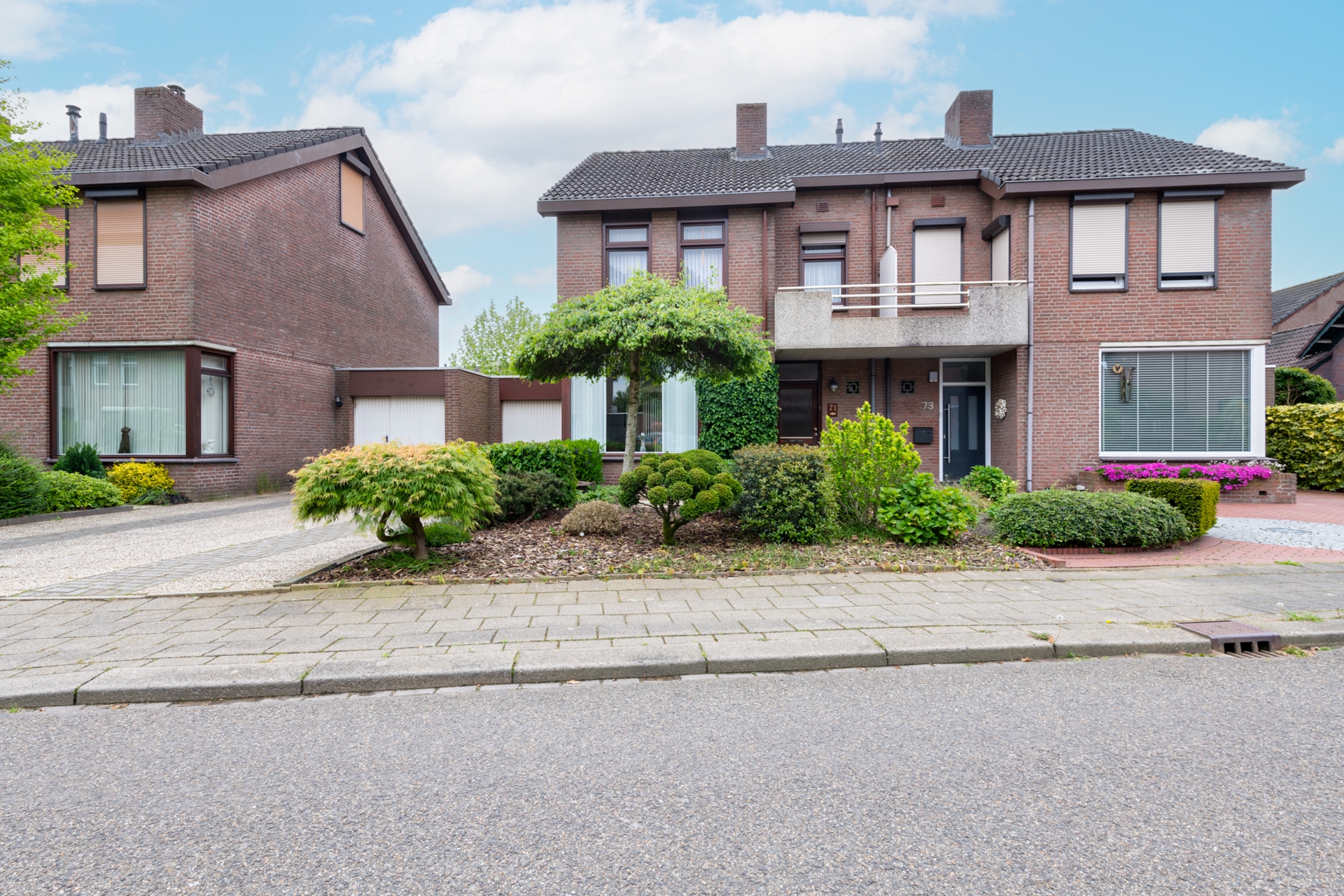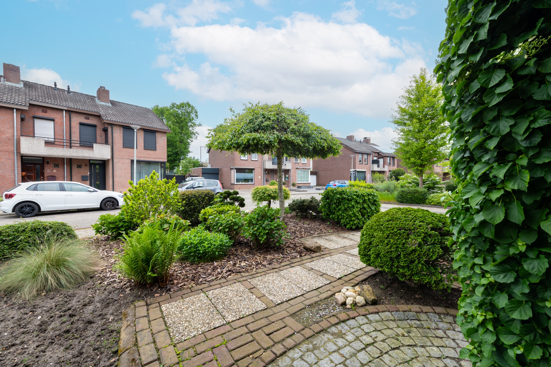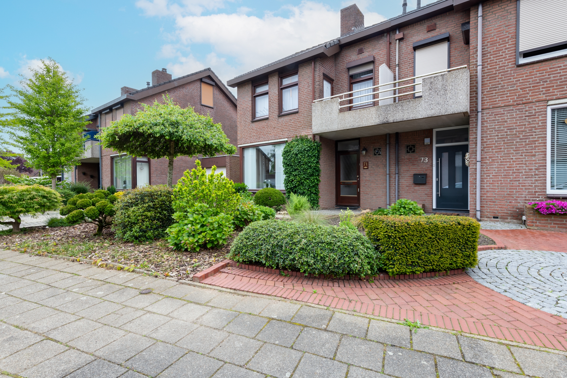De zonnige achtertuin op het zuiden is mooi aangelegd. Wat overigens ook geldt voor de voortuin.