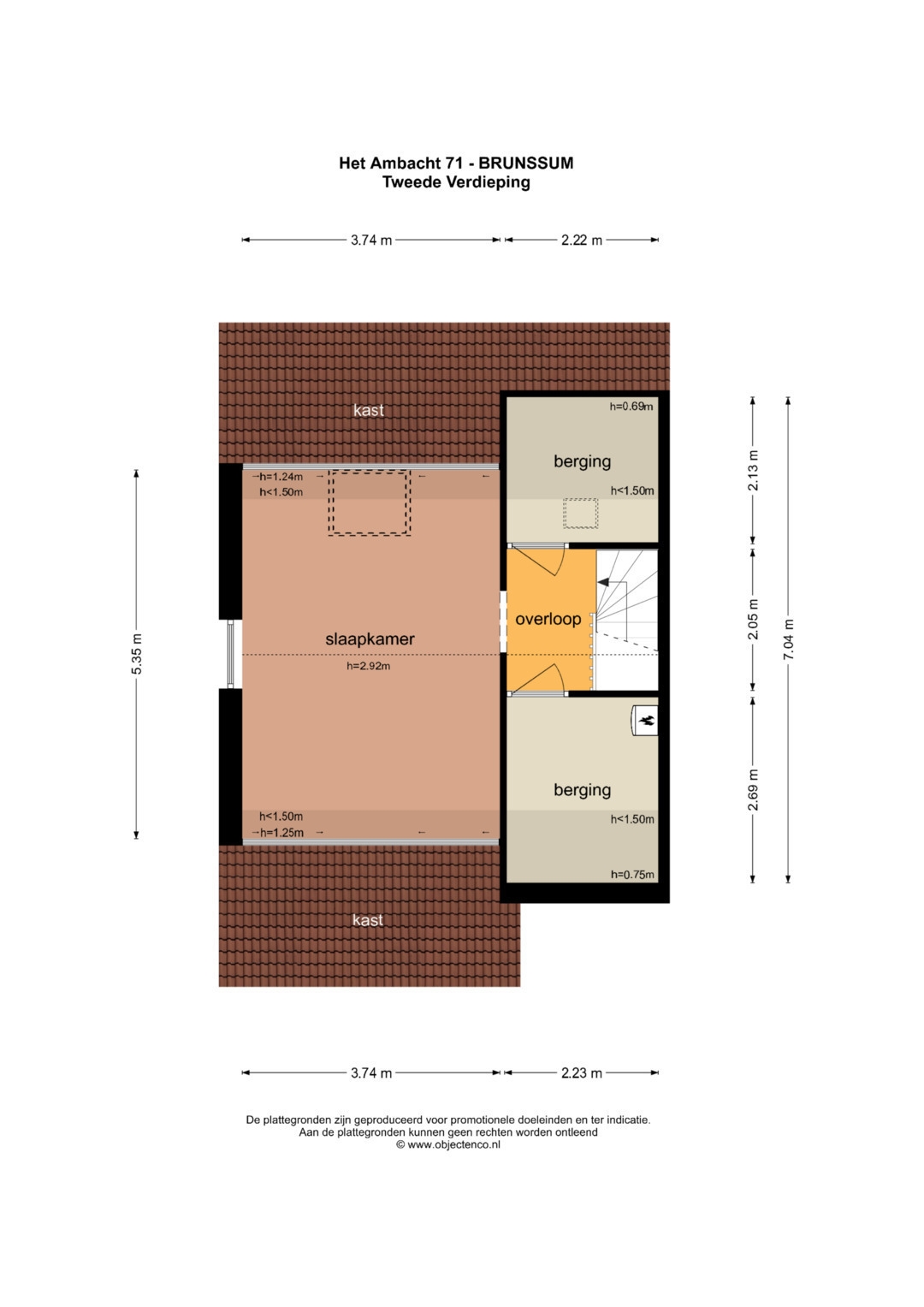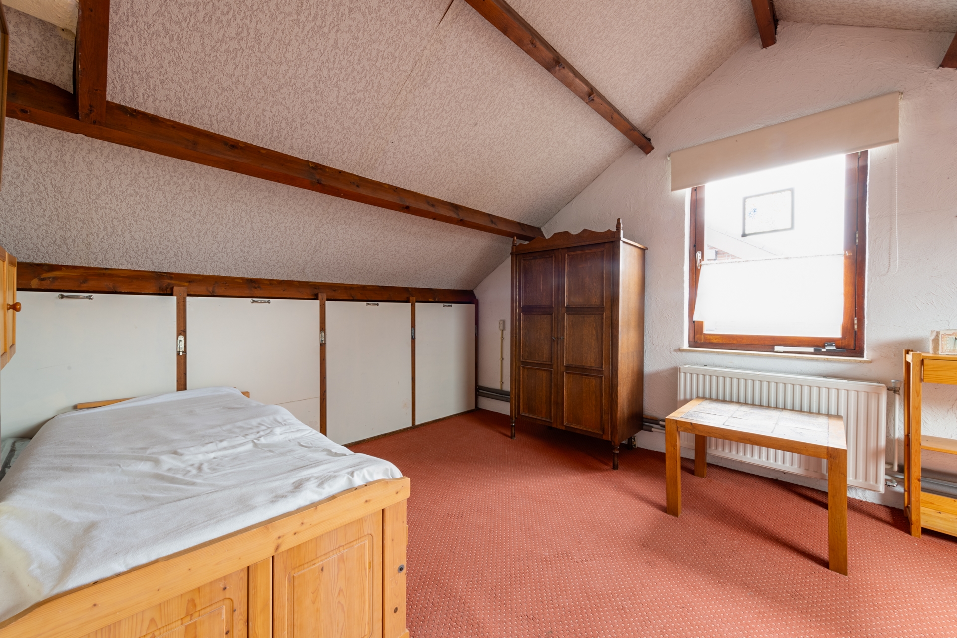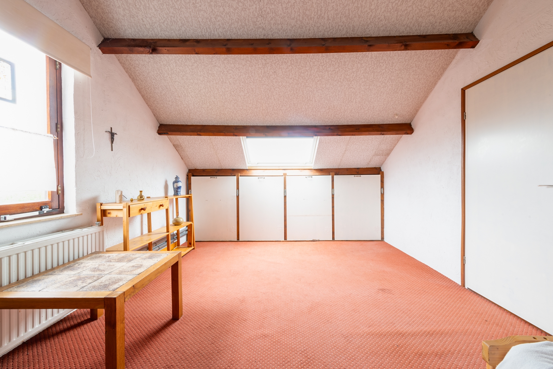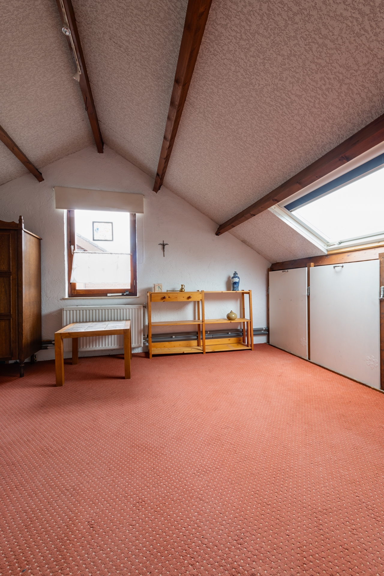 Met de vaste trap komen we op de zolderruimte (535 x 374 cm) . Onder de schuine kap bevinden zich nog 2 extra opbergruimtes (CV ruimte en wasruimte)