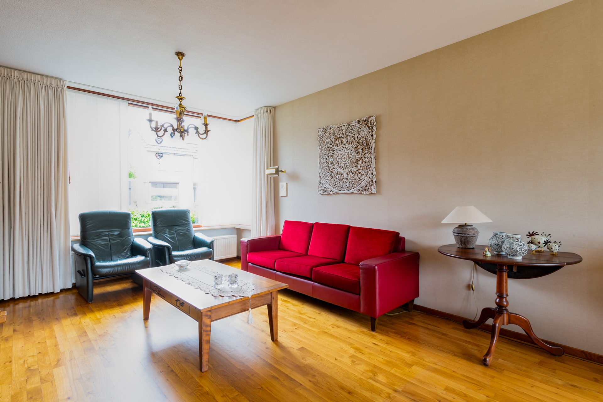 De woning is voorzien van een ruime woonkamer voor zithoek met gezellige open haard en eetgelegenheid, een half open keuken, 3 slaapkamers, of 2 slaapkamers en 1 werkkamer, een nette badkamer met aparte douche en ligbad en een ruime zolder met grote zolderkamer en 2 bergruimtes.