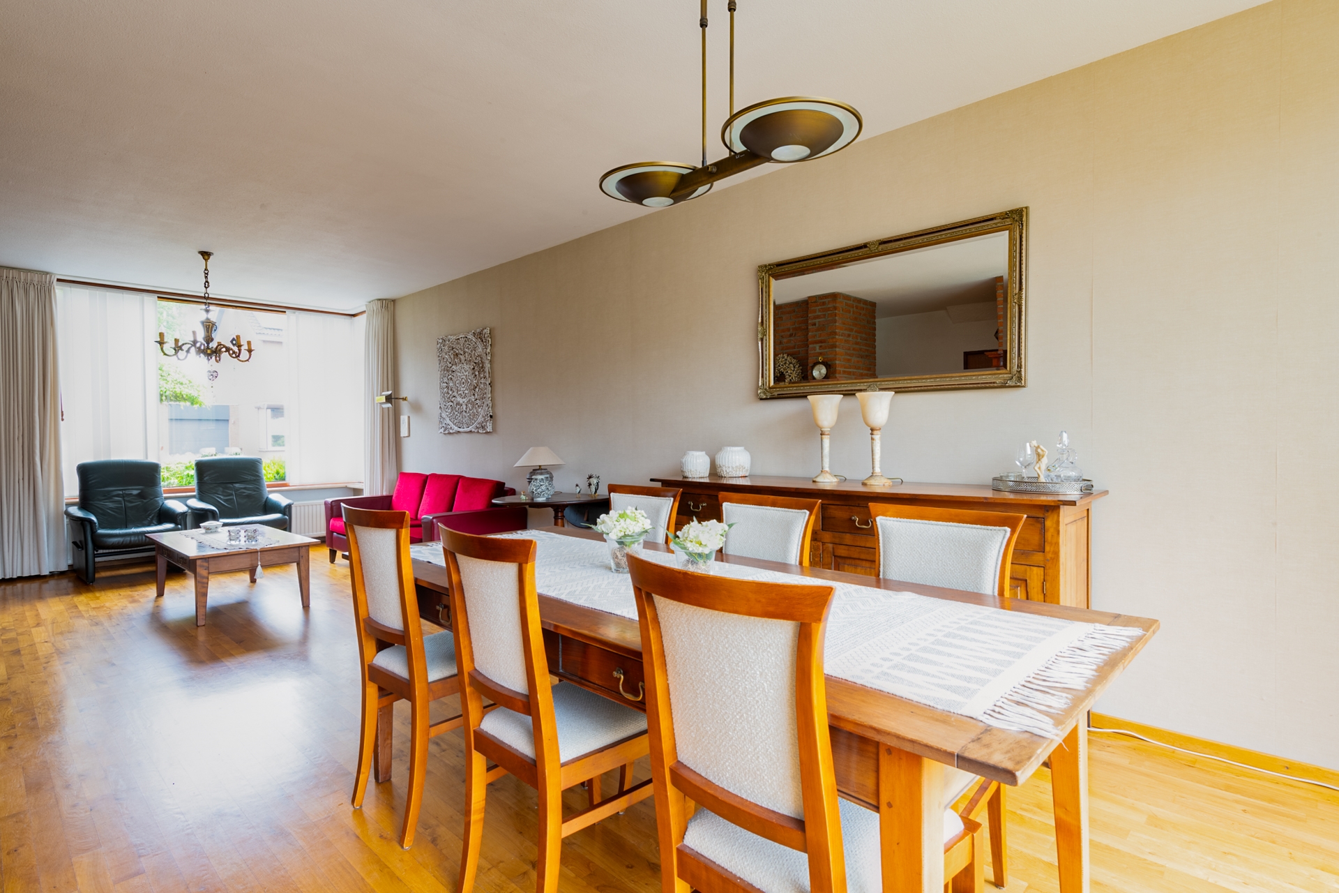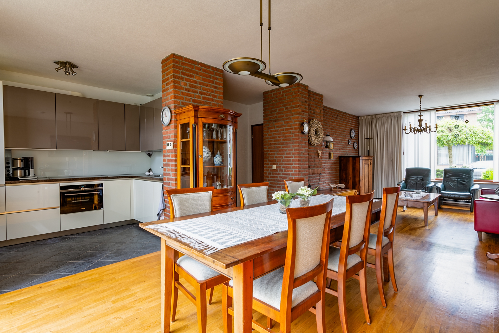 Ontvangsthal met garderobe, toilet (hangend toilet met wasbakje) en trapopgang naar de 1e verdieping, toegang tot de woonkamer (904 x 378cm). De prachtige woonkamer is voorzien van een kwalitatief hoogwaardig parket. De wanden zijn behangen, in echt en degelijk schoonmetselwerk en granol. Vanuit de woonkamer is de half open keuken (299 x 208cm) bereikbaar. De keuken is voorzien van een luxe hoekopstelling in hoogglans met composiet werkblad, spoelbak en kraan, en (inbouw-)apparatuur: vaatwasmachine, oven, 4-inductiekookplaat, combi-stoomoven, koeler en afzuigkap met rechtstreekse afvoer van de luchtjes naar buiten. Een keuken voor echte kookliefhebbers of je wordt het hier vanzelf.