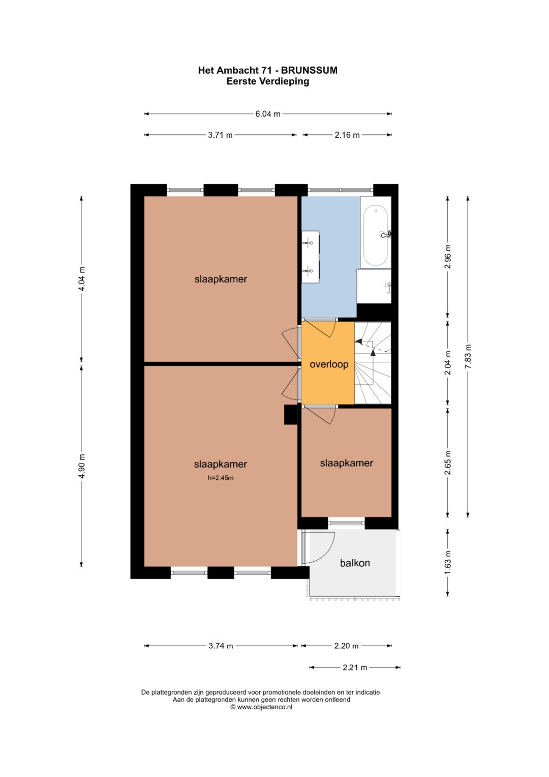 Overloop met toegang naar de 3 slaapkamers en badkamer. De kamers aan de voorzijde van deze woning meten 265 x 220cm en 490 x 374cm. Vanaf hier is ook toegang tot het balkon. Aan de achterzijde bevinden zich de 1 na grootste slaapkamer (404 x 371cm) en de badkamer (296 x 216 cm). De aparte douche met glazen wand en deur en het ligbad met whirlpool zijn daarnaast zeer goed onderhouden. Zowel op de vloer als tegen de wand is getegeld.