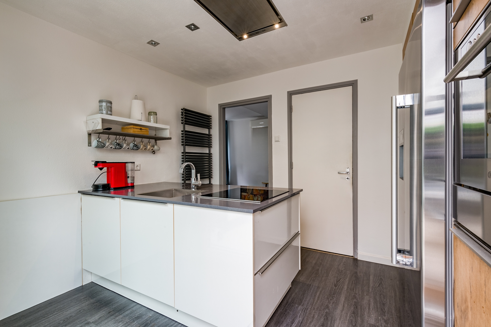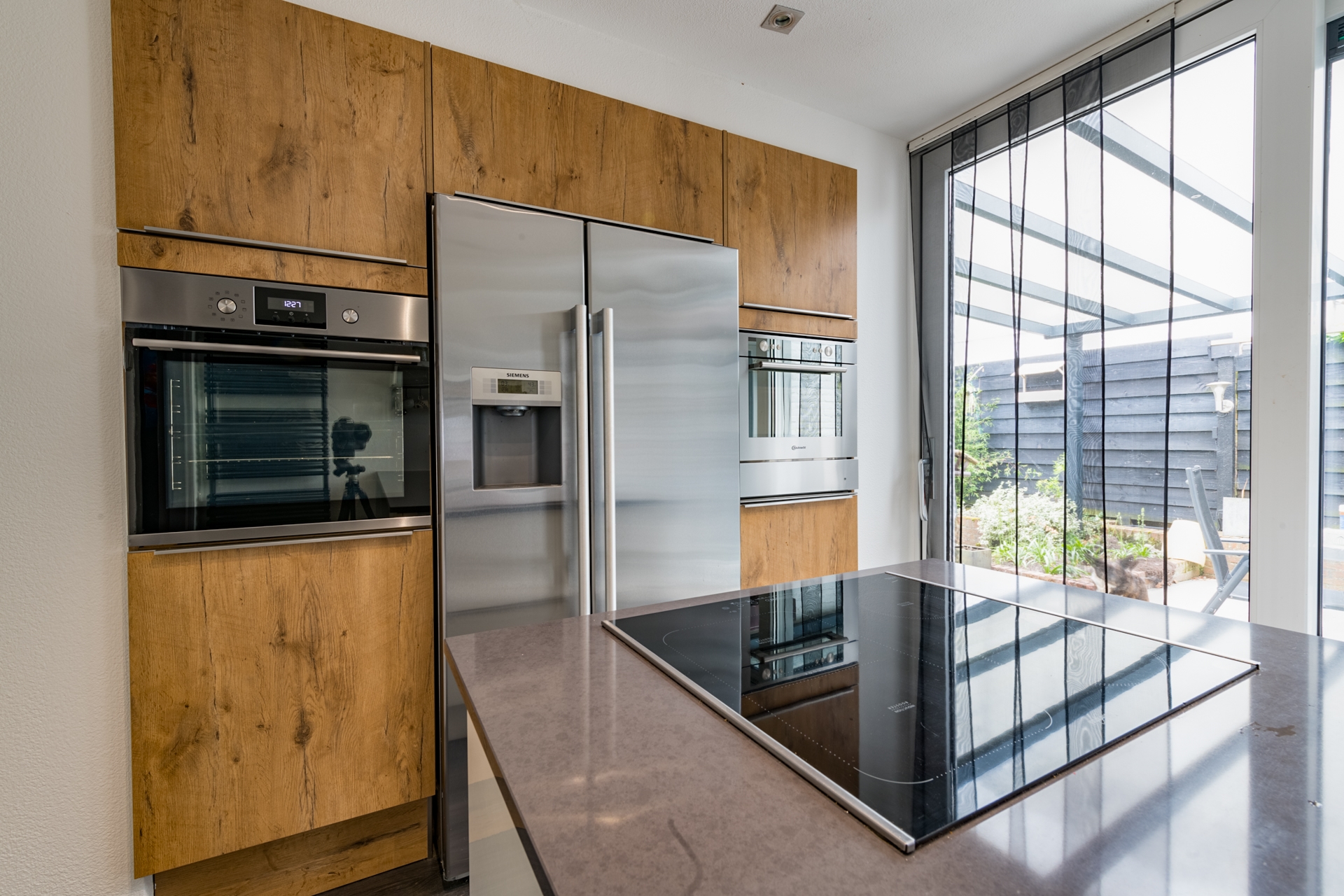 Ontvangsthal met garderobe, toilet (hangend toilet met wasbakje), toegang tot de woonkamer (781 x 495cm). De lichte woonkamer is voorzien van een kwalitatief hoogwaardig laminaat. De wanden zijn strak gestuct. Vanuit de hal is de ook de keuken (282 x335cm) bereikbaar. De keuken is voorzien van een eiland met vaatwasser, inductiekookplaat, afzuigkap en spoelbak met kraan. Het composiet werkblad geeft het eiland een mooi luxe uitstraling. De kastenwand in contrasterende houtkleur is voorzien van een oven, combi-magnetron, warmhoudlade voor borden en dubbeldeurskoelautomaat met vriezer en ijsblokjesmachine. Niet alleen een lust voor het oog, maar ook erg praktisch en ruim.