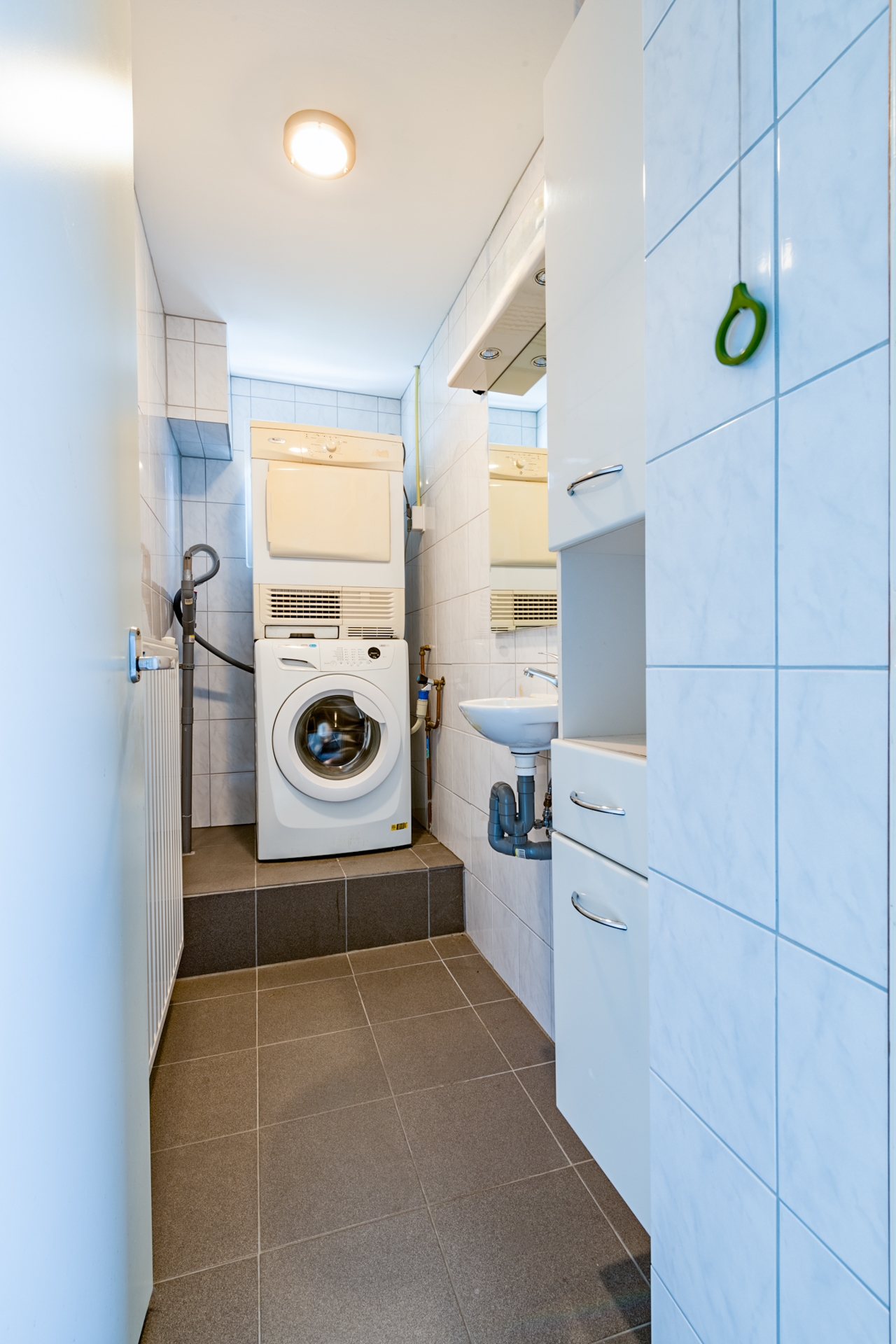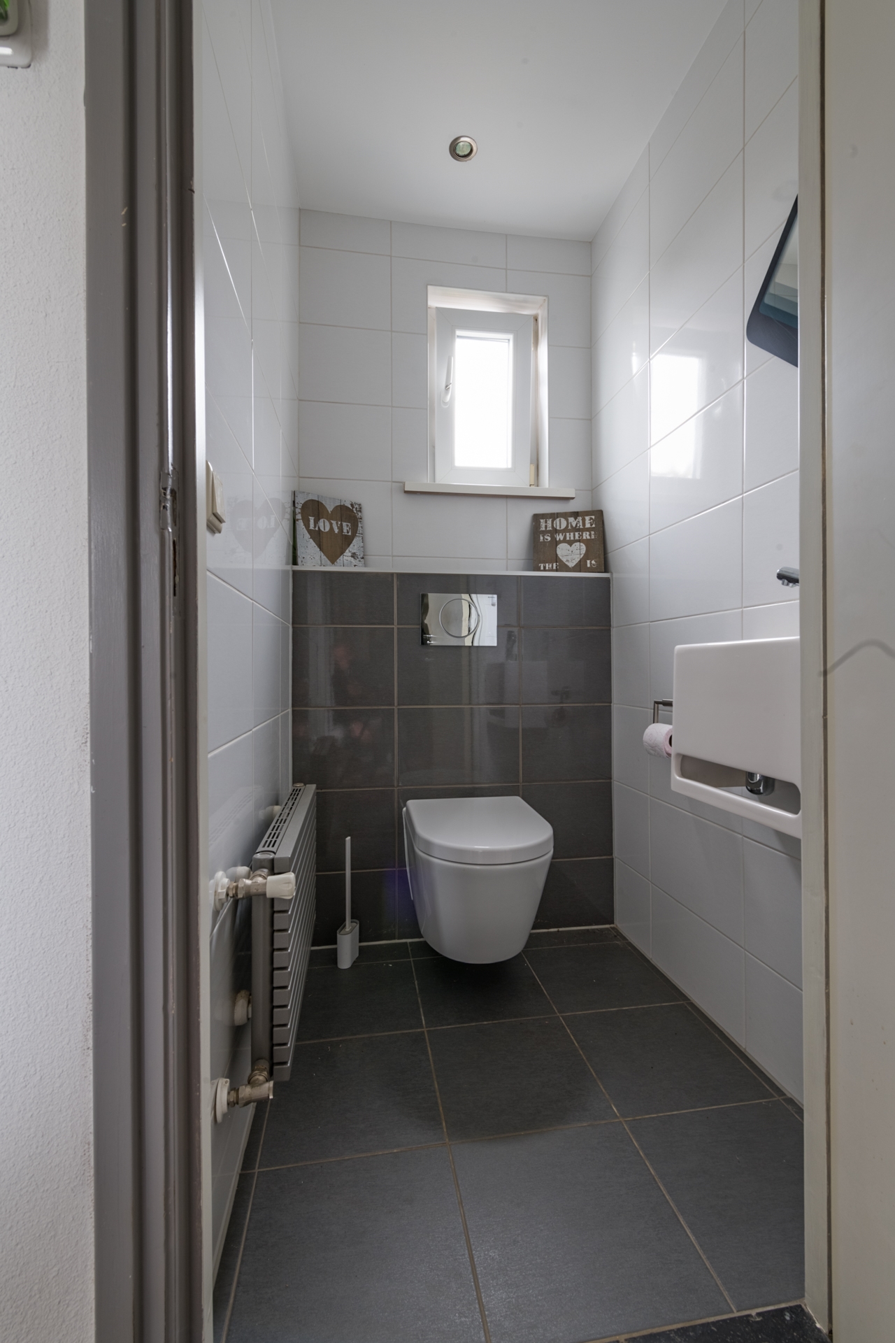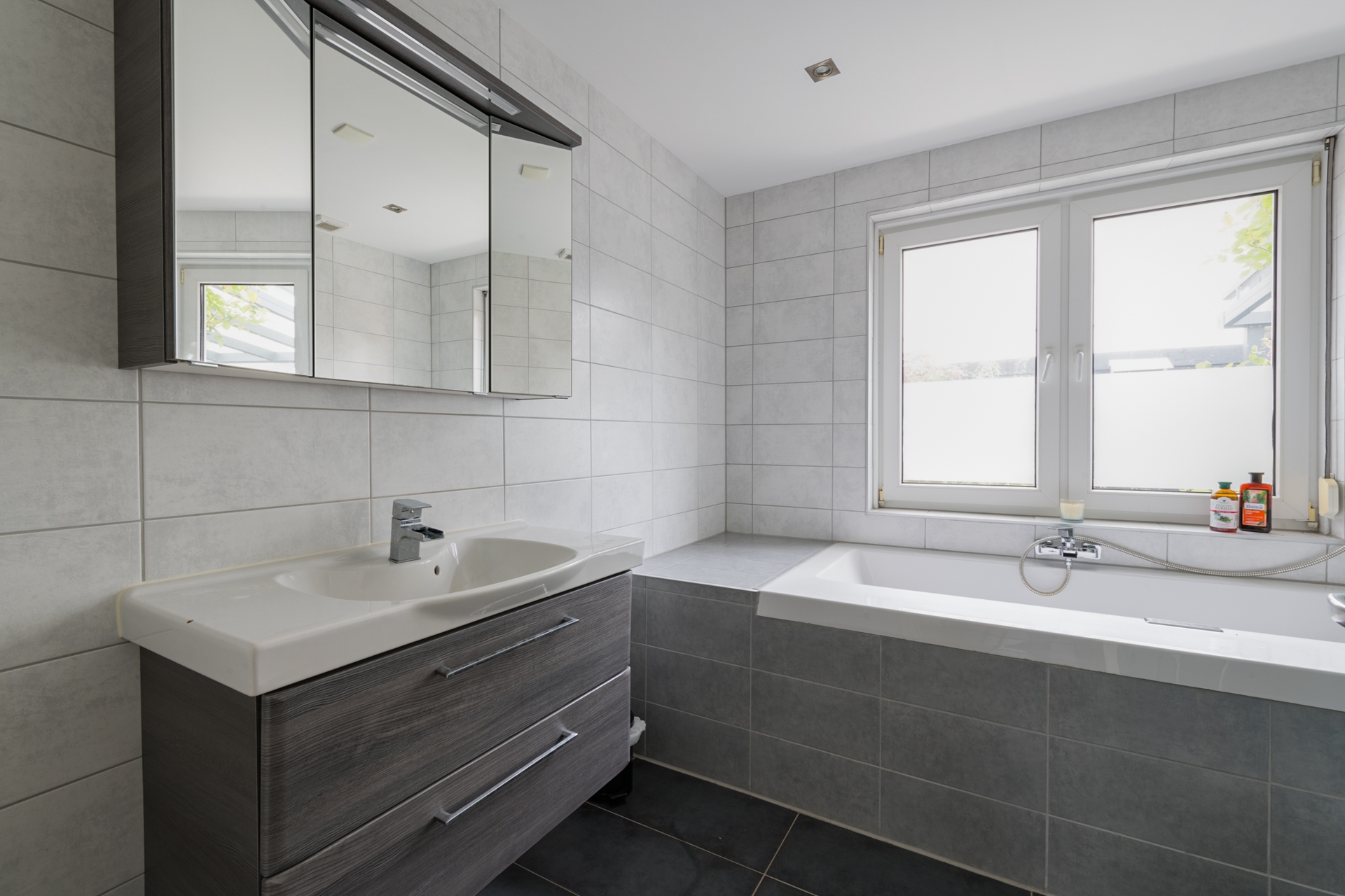 De ruime badkamer is voorzien van een ligbad, aparte douche en wastafel met meubelombouw. De vloer en wanden zijn geheel betegeld.