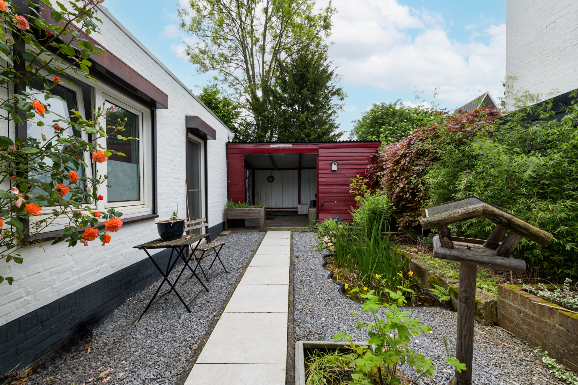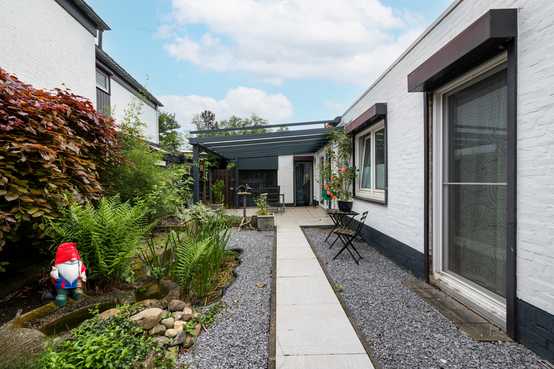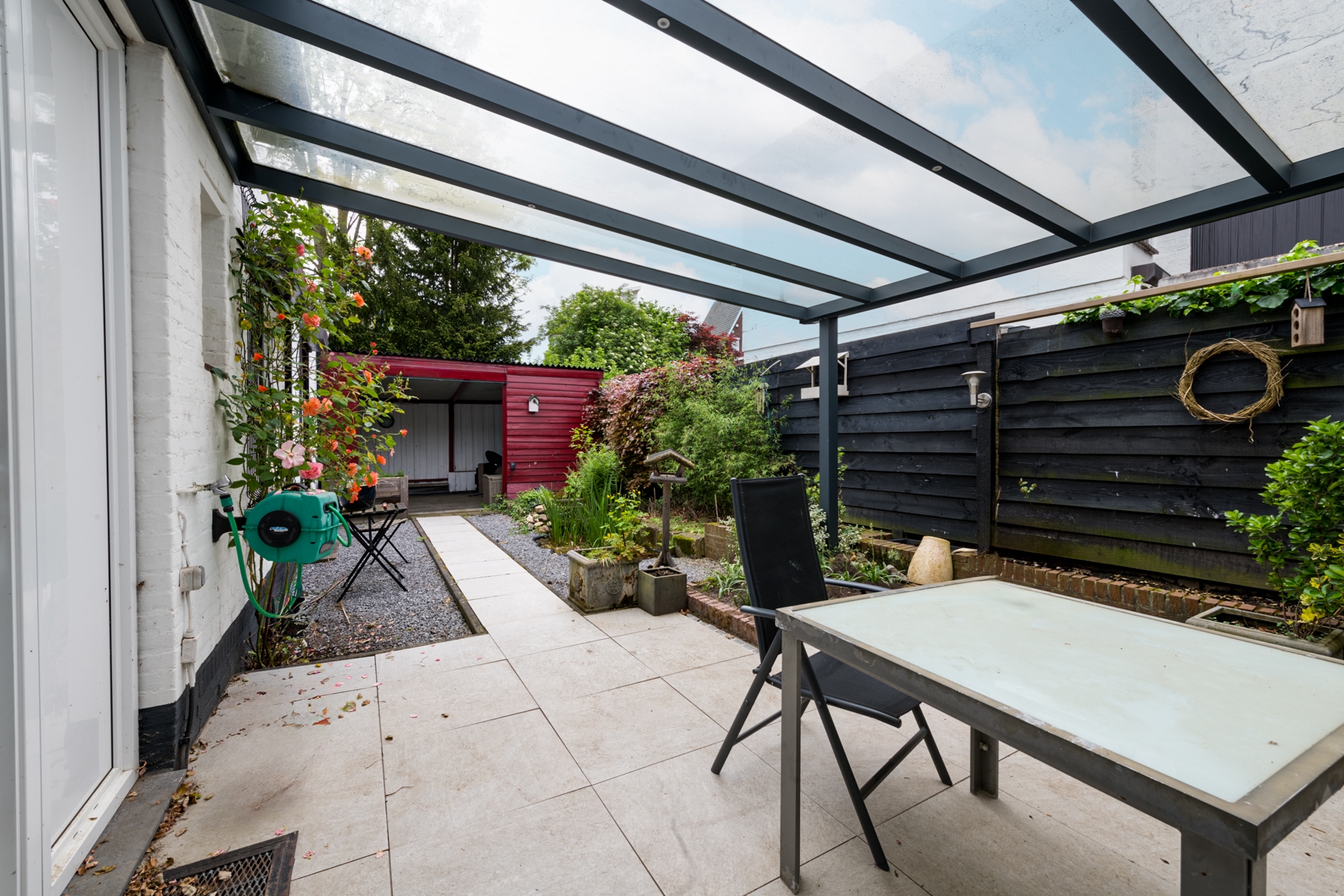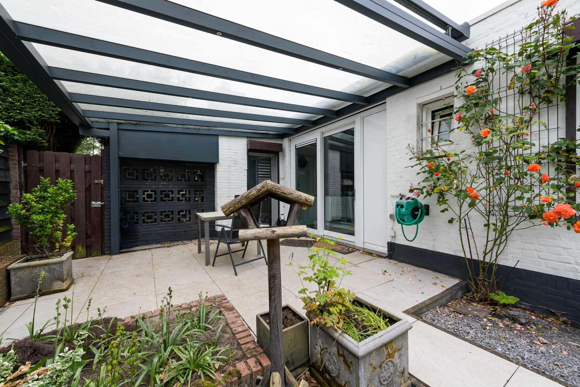 Door de schuifpui komen we op het overdekt terras en tuin.