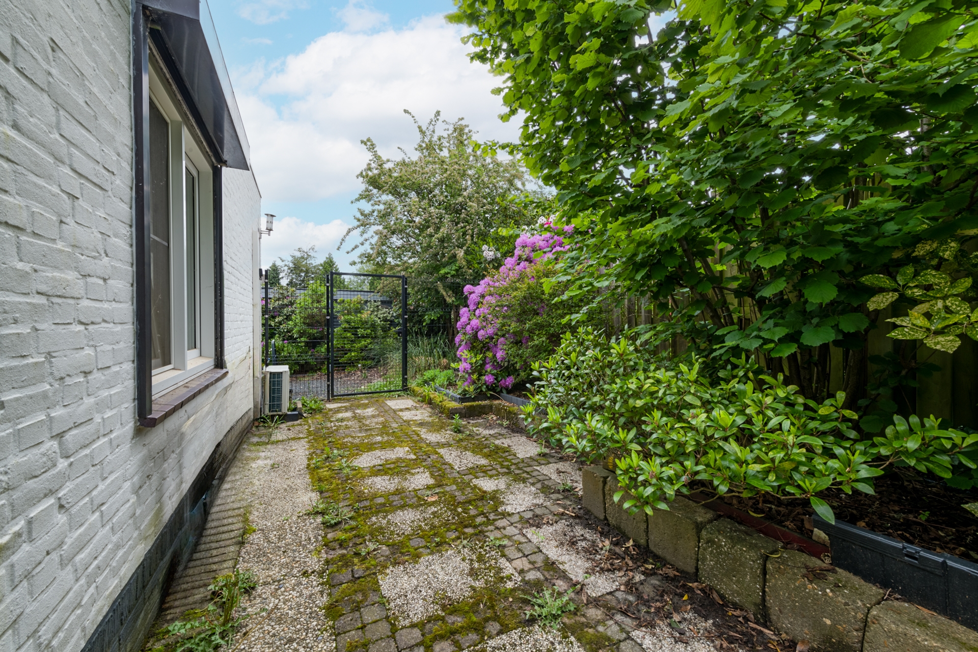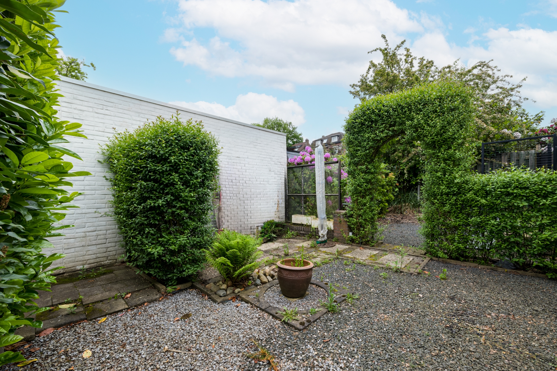 De tuin rondom het gehele pand is netjes onderhouden. De voortuin gelegen op het westen loopt omhoog en via de stenen trap komen we bij de voordeur. Aan de andere zijde van de woning is een gelijkmatige ophoging gemaakt en zo komen we achterom in de achtertuin en het overdekte terras.