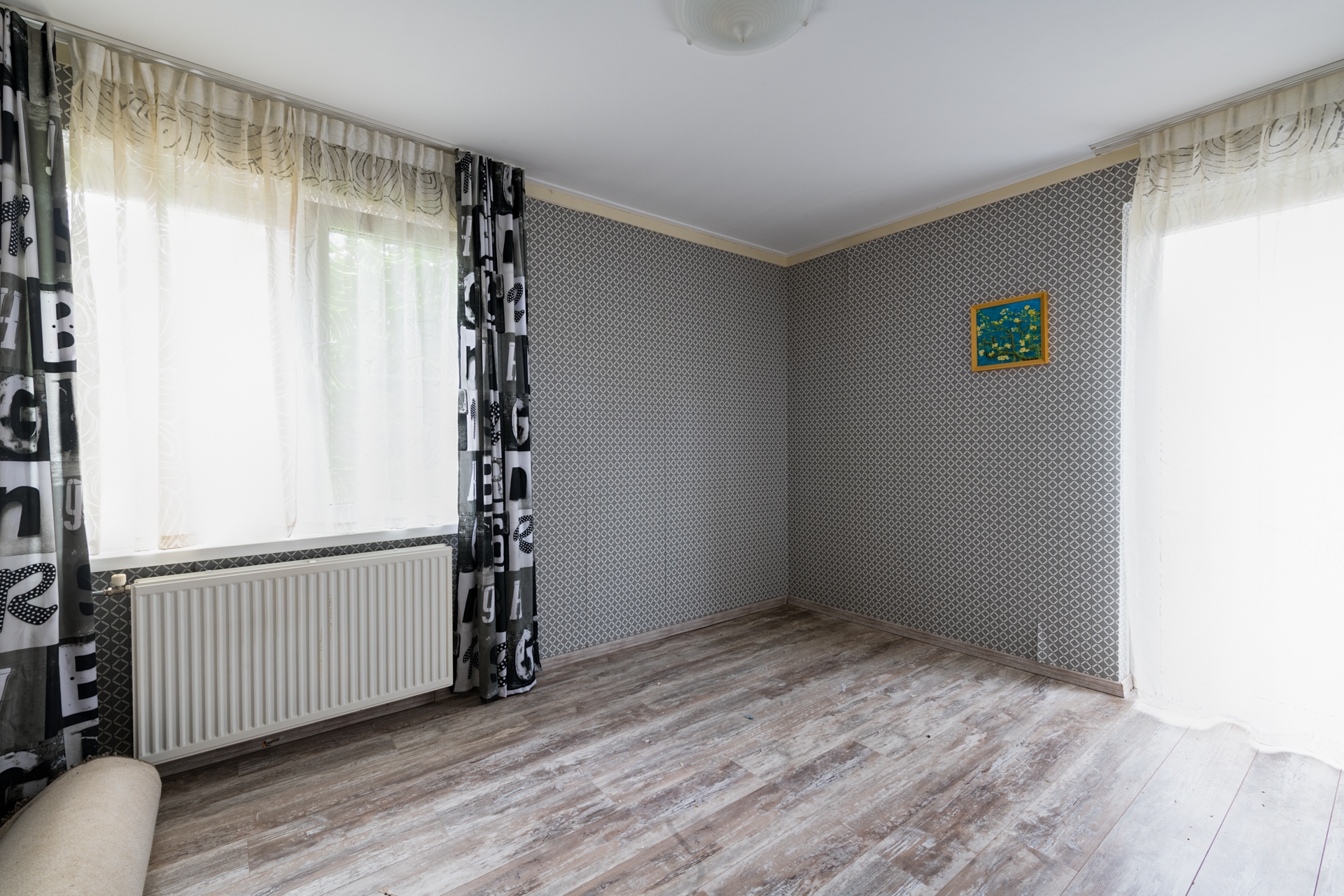 Op de vloer ligt hetzelfde laminaat als in de woonkamer en de wanden zijn ook hier strak gestuct.