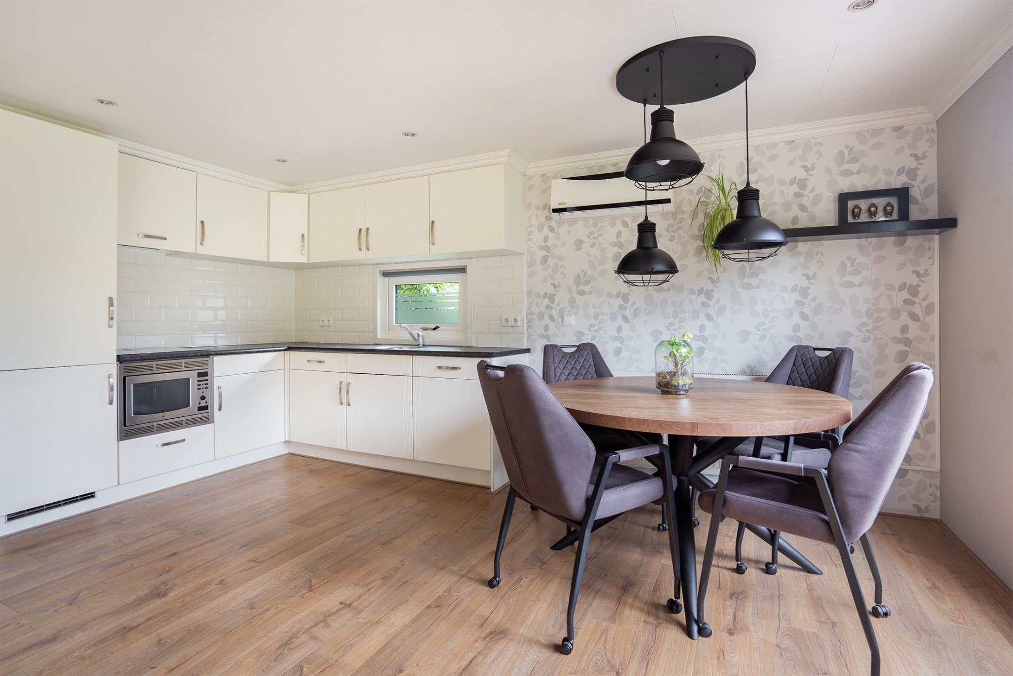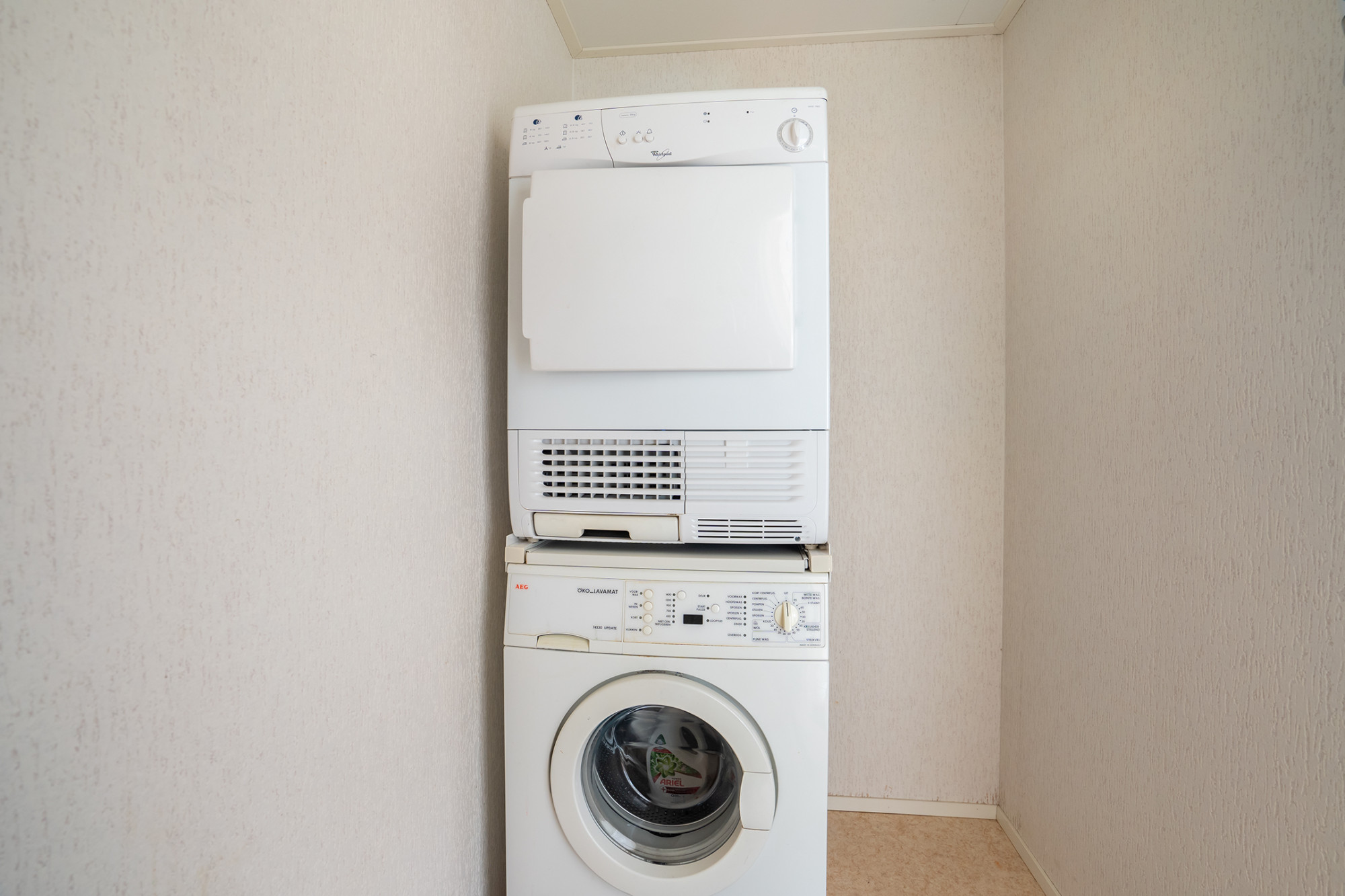 De naastgelegen keuken is in een lichte kleurstelling uitgevoerd en van vele gemakken voorzien. Zo zit er een gaskomfoor, afzuigkap, koelkast en apart vriesgedeelte met 3 laden, combi-oven en een afwasmachine. Daarnaast zit in de hal een kast met de CV -ketel en een ruime berging waar de wasmachine en droger staan.. In de hal naast de ingang is tevens een separaat gastentoilet met fonteintje.