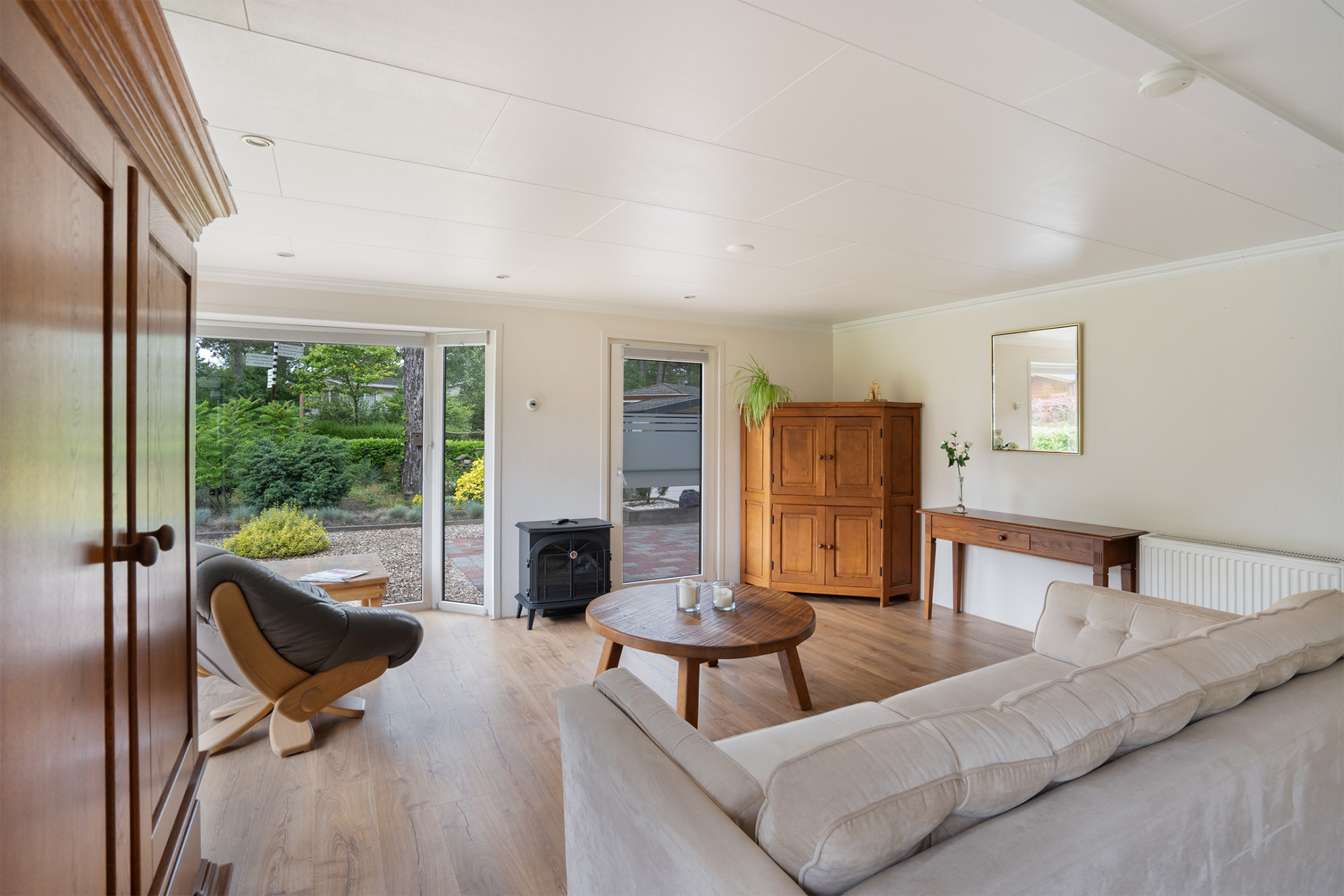 Bij aankomst bij de recreatiewoning kan er op eigen perceel worden geparkeerd. Via de deur aan de zijkant is de recreatiewoning te betreden. Aan de voorzijde is de royale woonkamer gelegen. Deze ruimte is heerlijk licht door de grote raampartijen. Door de dubbele openslaande deur is het terras direct te bereiken, maar loopt binnen en buiten ook aangenaam in elkaar over. In de woonkamer is er naast de gezellige zitgedeelte ook voldoende ruimte over gehouden voor een fijne eethoek.