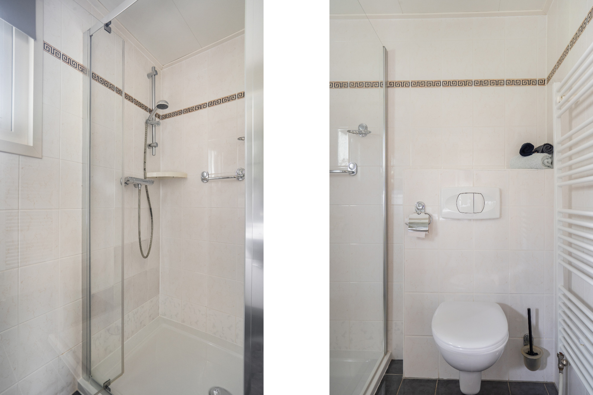De badkamer is geheel betegeld en voorzien van een inloopdouche, wastafel met wastafelmeubel, toilet en een designradiator. Ventilatie kan via de mechanische ventilatie en een raam voor natuurlijke ventilatie.