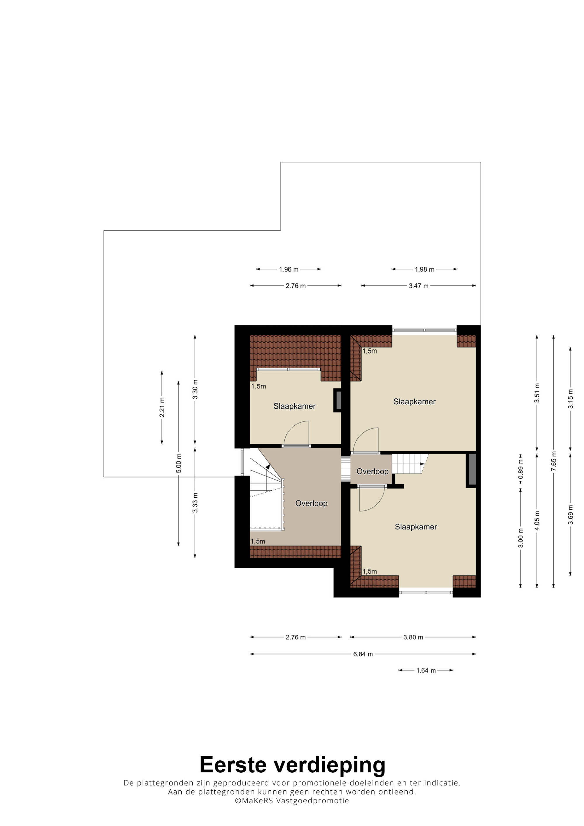 Een royale overloop biedt toegang tot de 3 slaapvertrekken en de vaste trap naar de zolder.