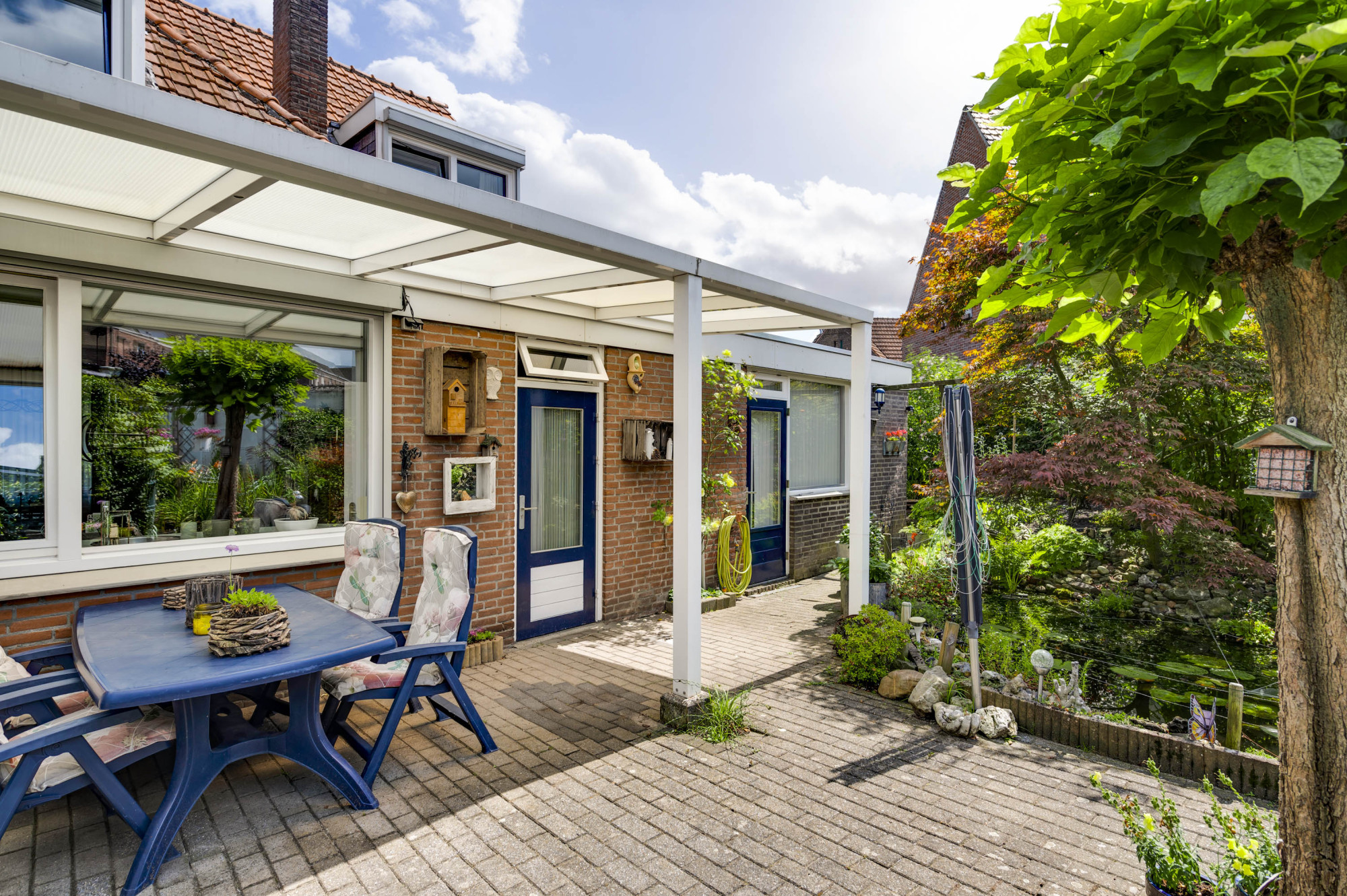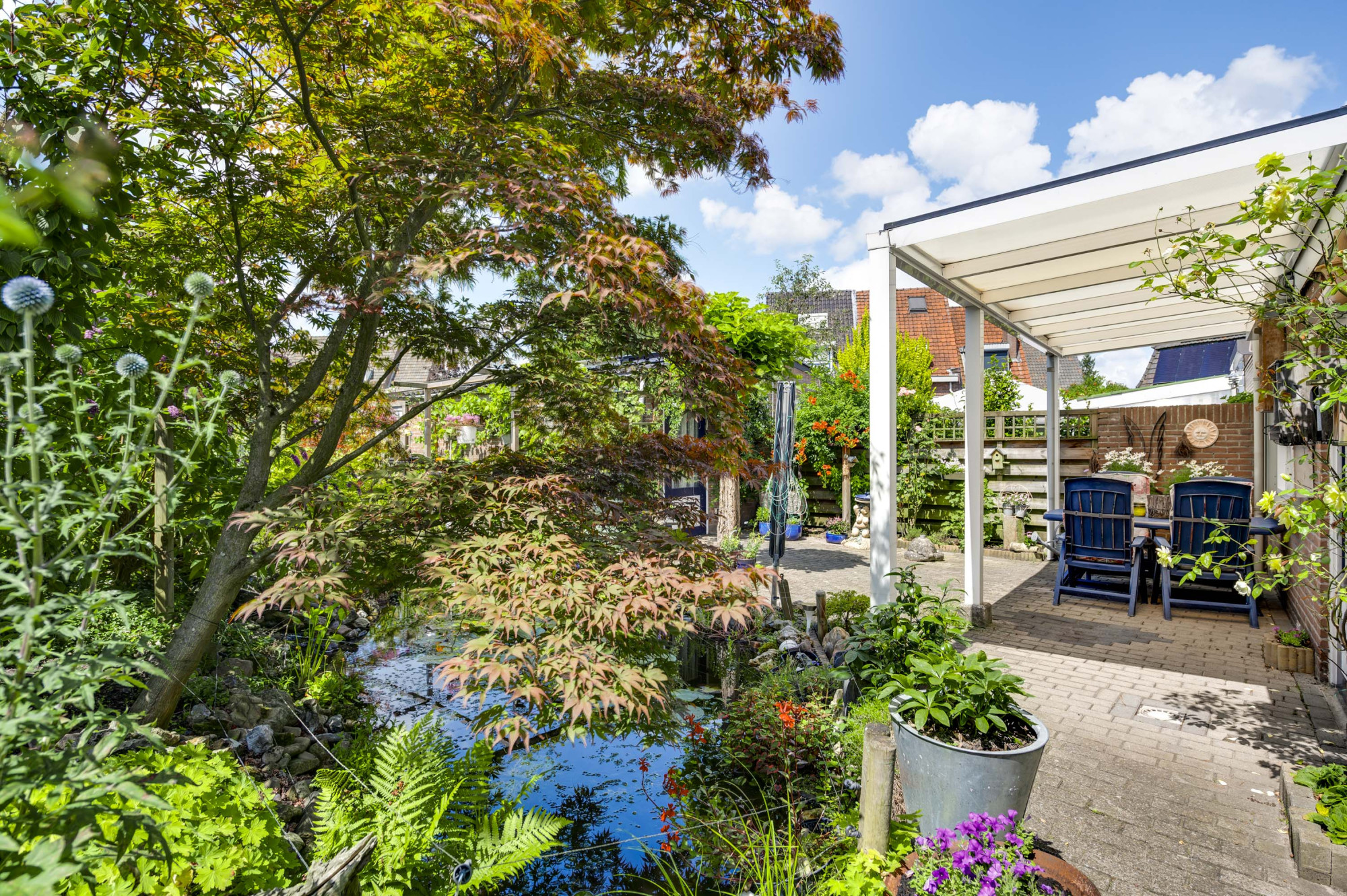 * ACHTERTUIN MET OVERDEKT TERRAS, VIJVERPARTIJ EN AANPLANTING