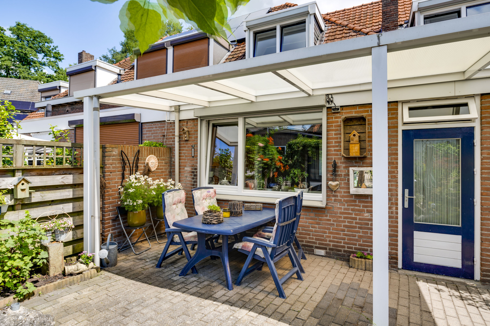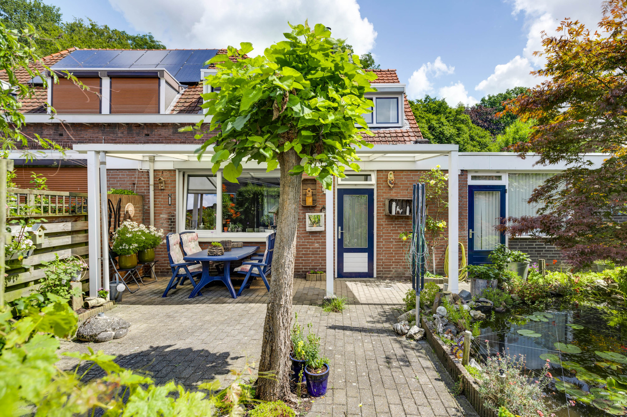 De volledig omsloten achtertuin is een oase van rust met een overdekt terras, groene borders, een vijverpartij en een vrijstaande garage die via een gemeenschappelijk achterpad te bereiken is. Daarnaast beschikt de zij-tuin over een houten tuinberging, ideaal voor al uw tuinspullen.