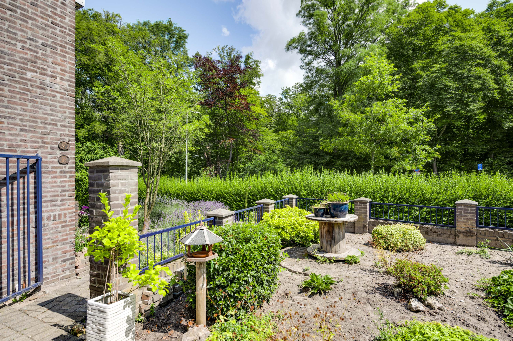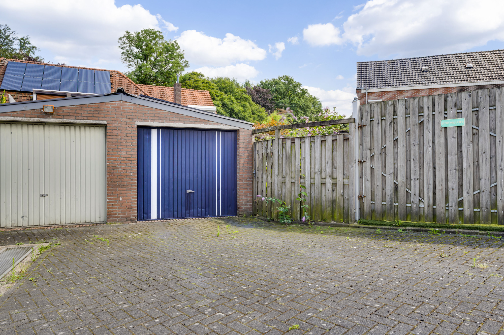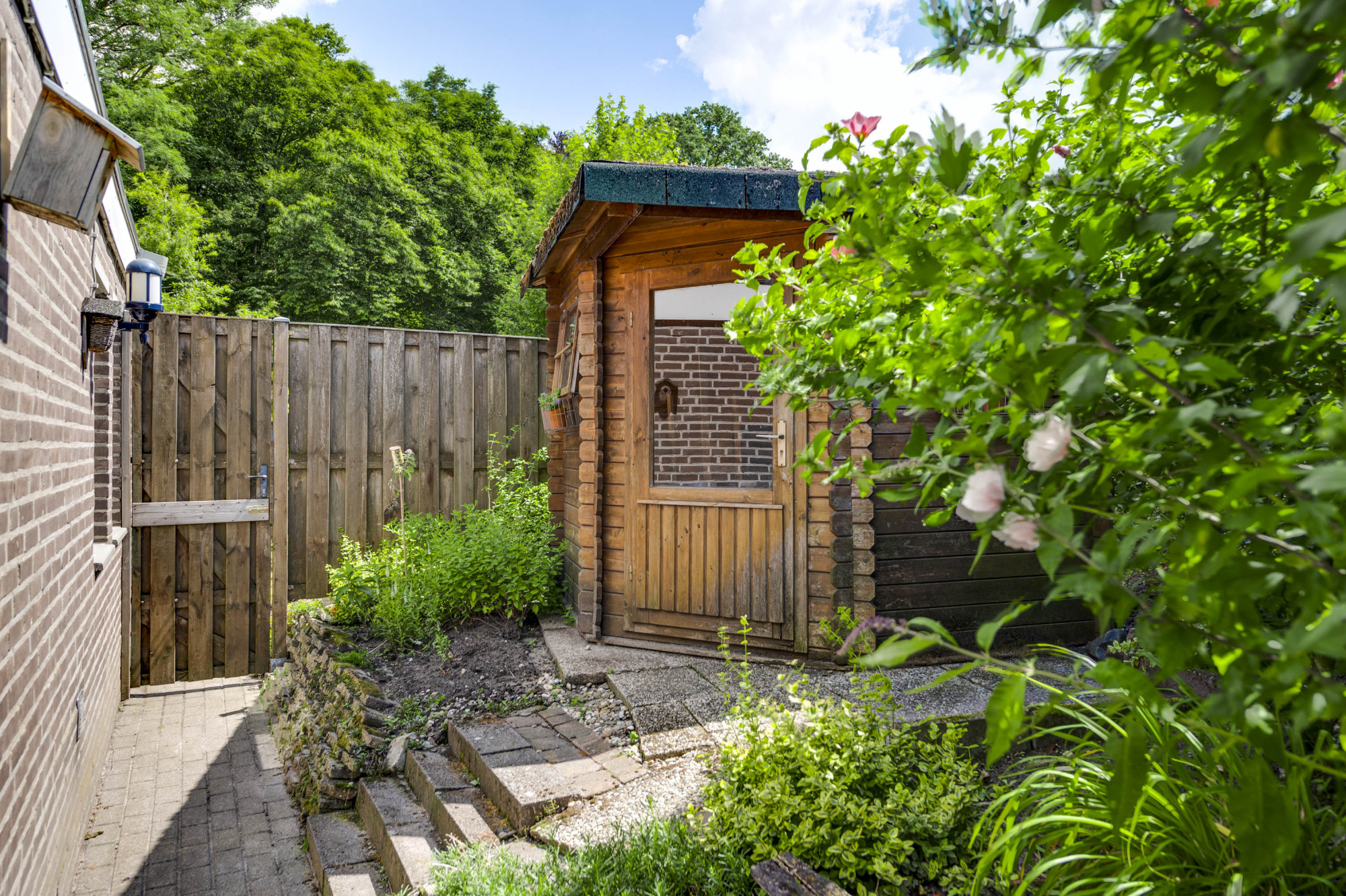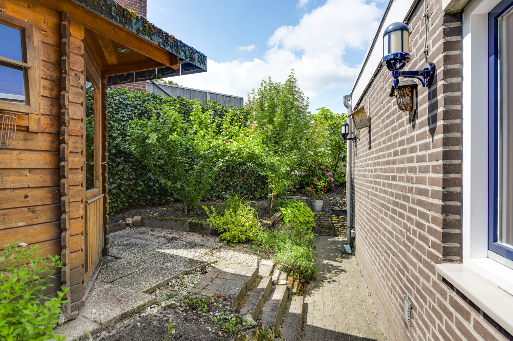 * ZIJ-TUIN MET VRIJSTAANDE HOUTEN TUINBERGING