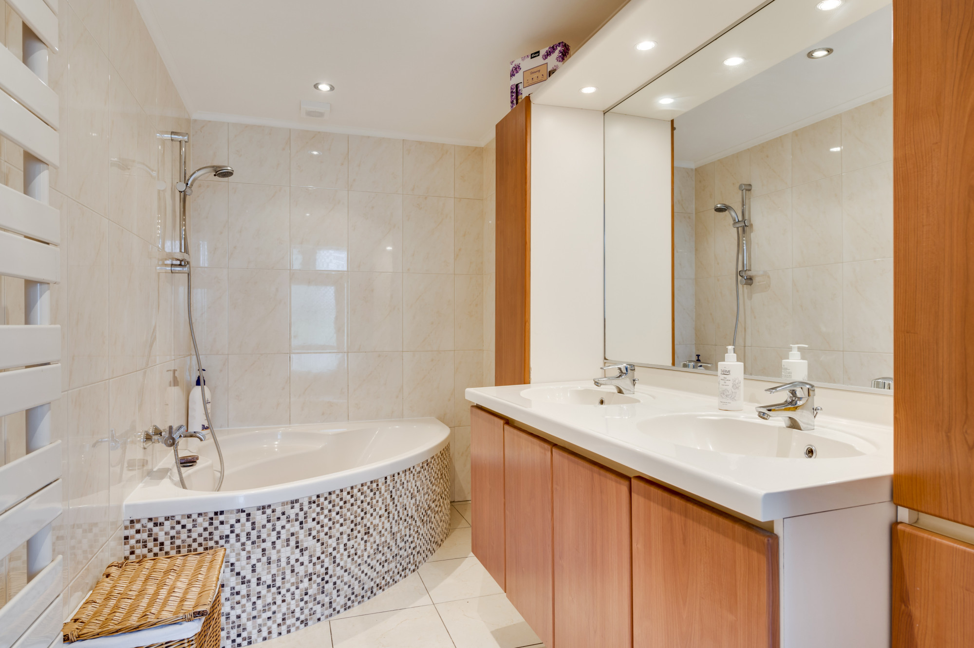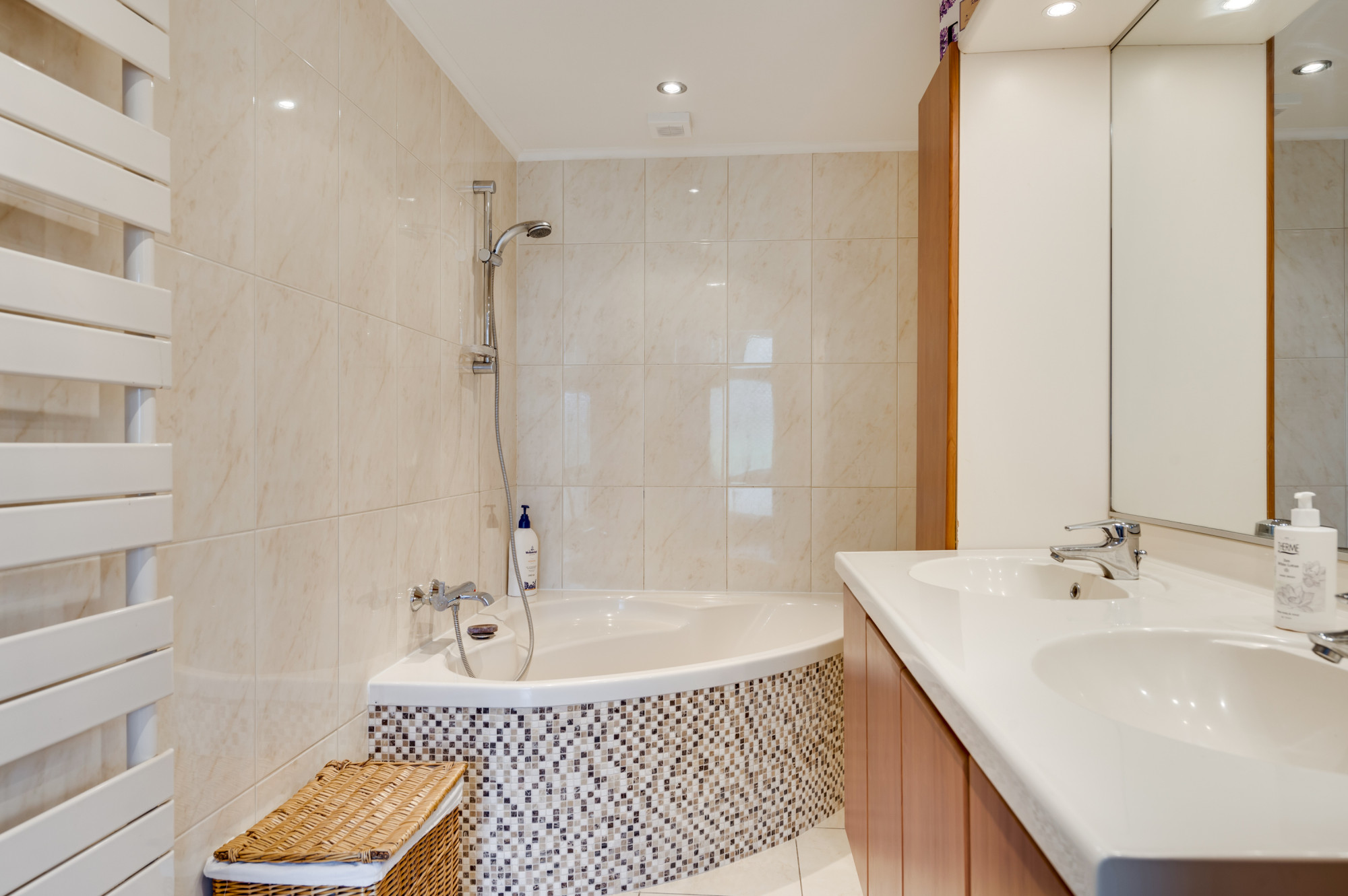 * GEHEEL BETEGELDE BADKAMER MET HOEK-/ZITBAD EN DUBBELE WASTAFEL