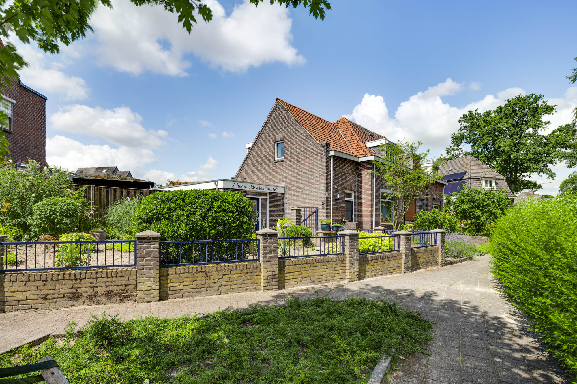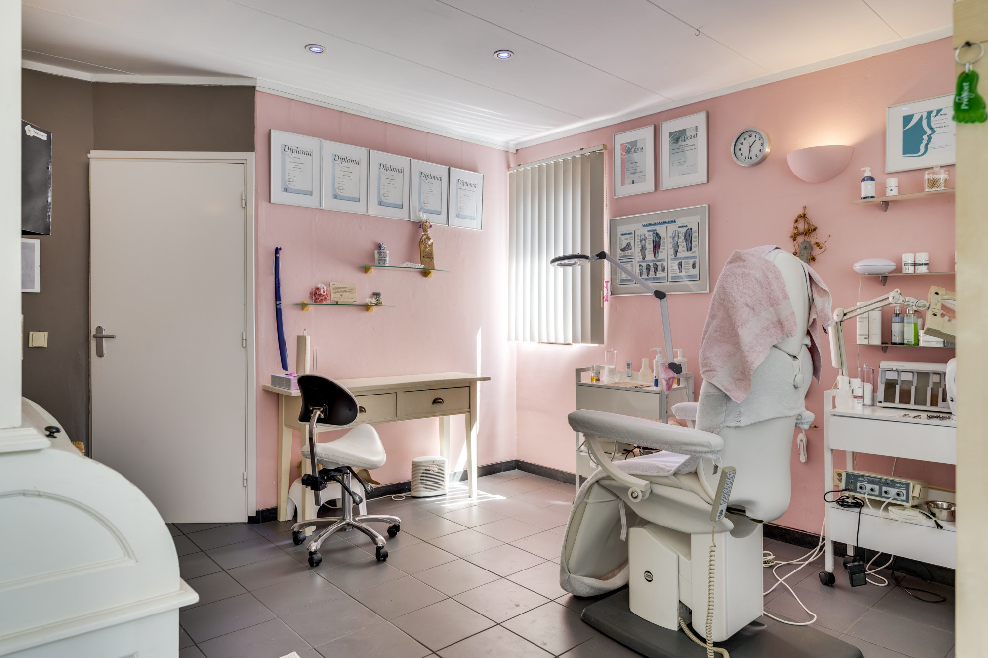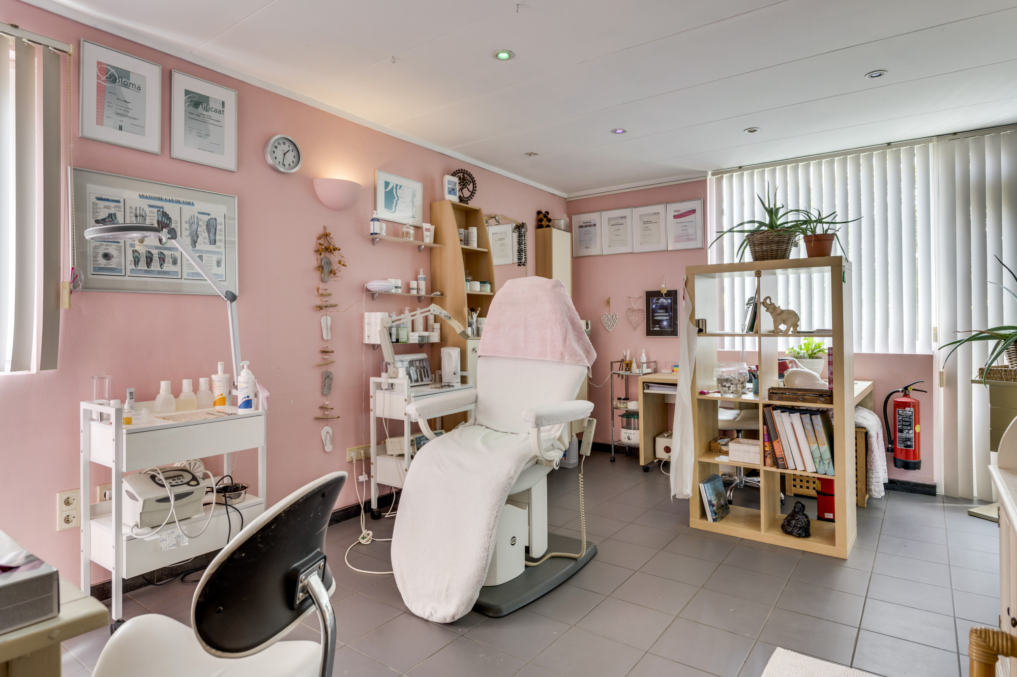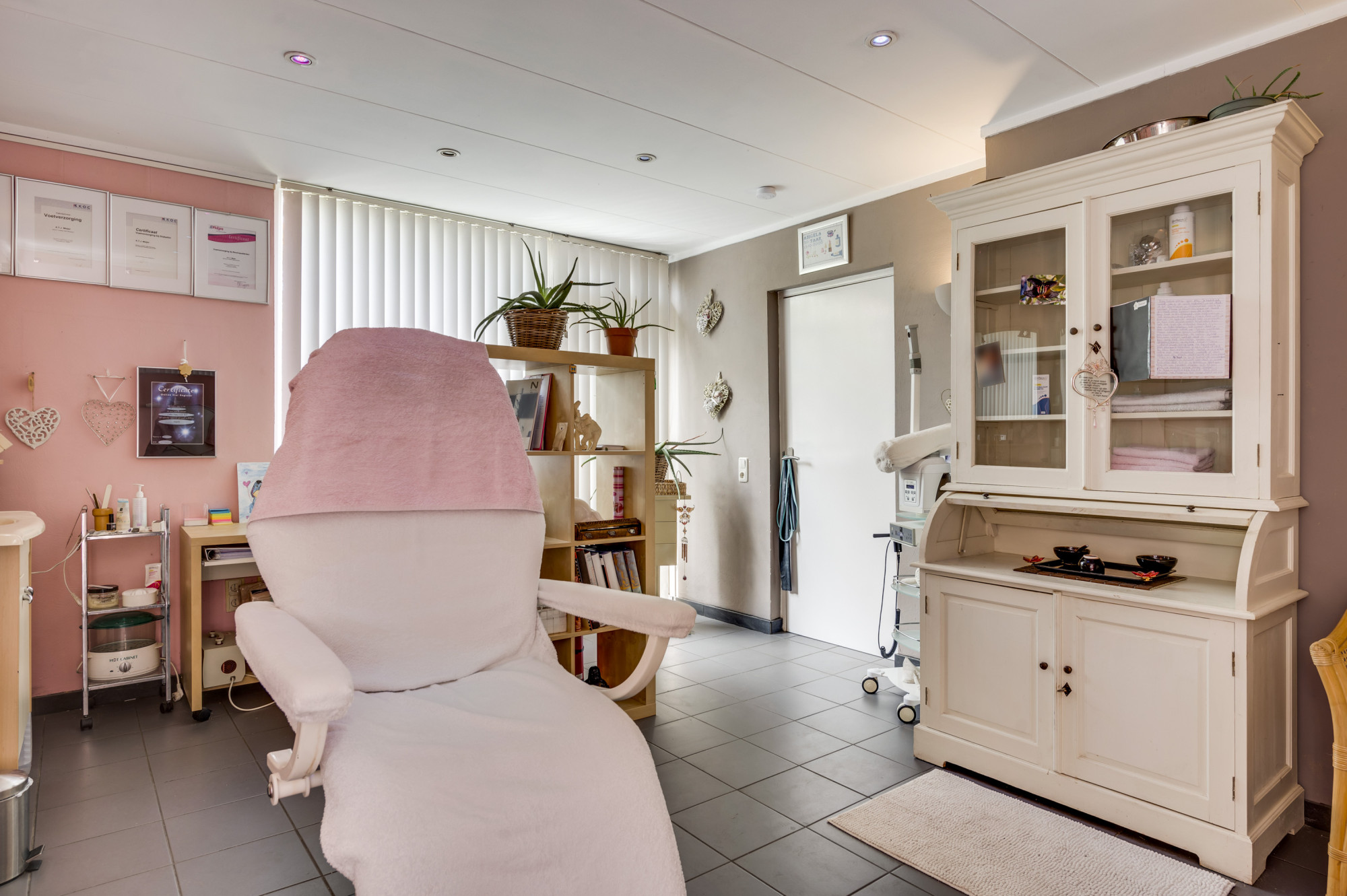 Het unieke aan deze woning is de direct aangrenzende salon-/praktijkruimte met een eigen entree, wachtkamer en gastentoilet. Deze lichte ruimte, voorzien van een plavuizen vloer met vloerverwarming, is perfect voor het ontvangen van klanten in een comfortabele en professionele setting.