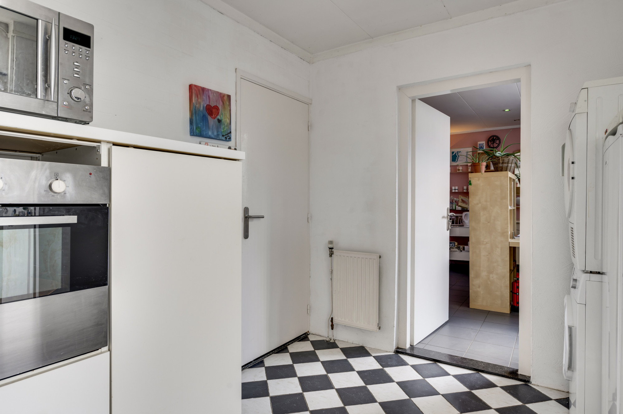 Doorgang naar de bijkeuken met witgoedaansluitingen voor wasmachine/droger, elektrische oven en opslagmogelijkheden. Stookruimte waar geplaatst de gehuurde AWB CV-Combiketel (Volta / Bouwjaar 2014). Inpandige doorgang naar de salon en loopdeur naar de achtertuin met overdekt terras.