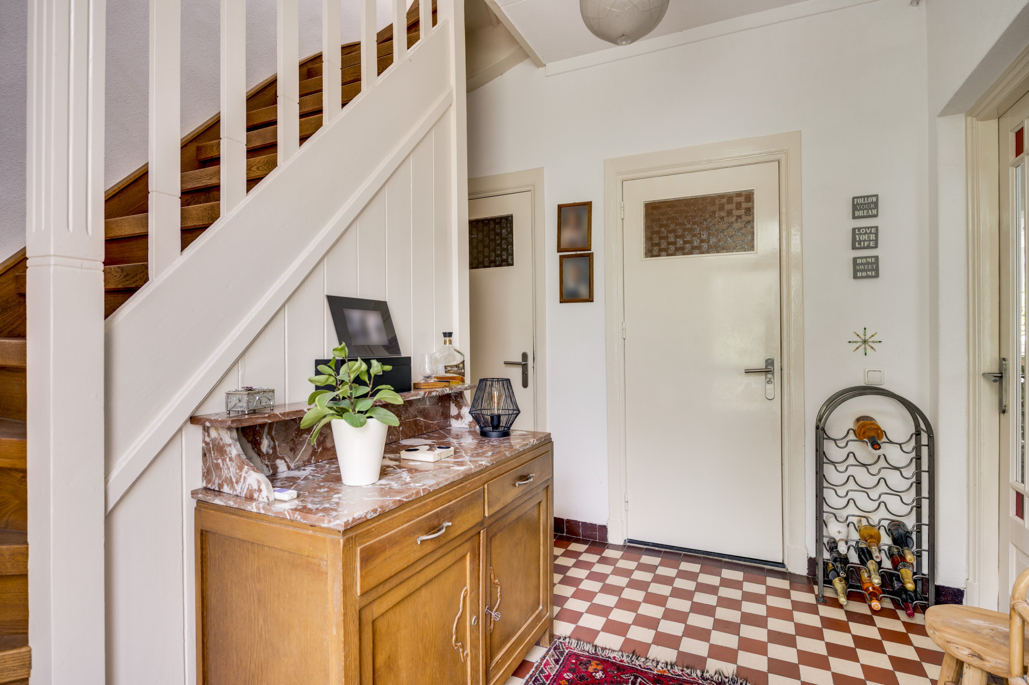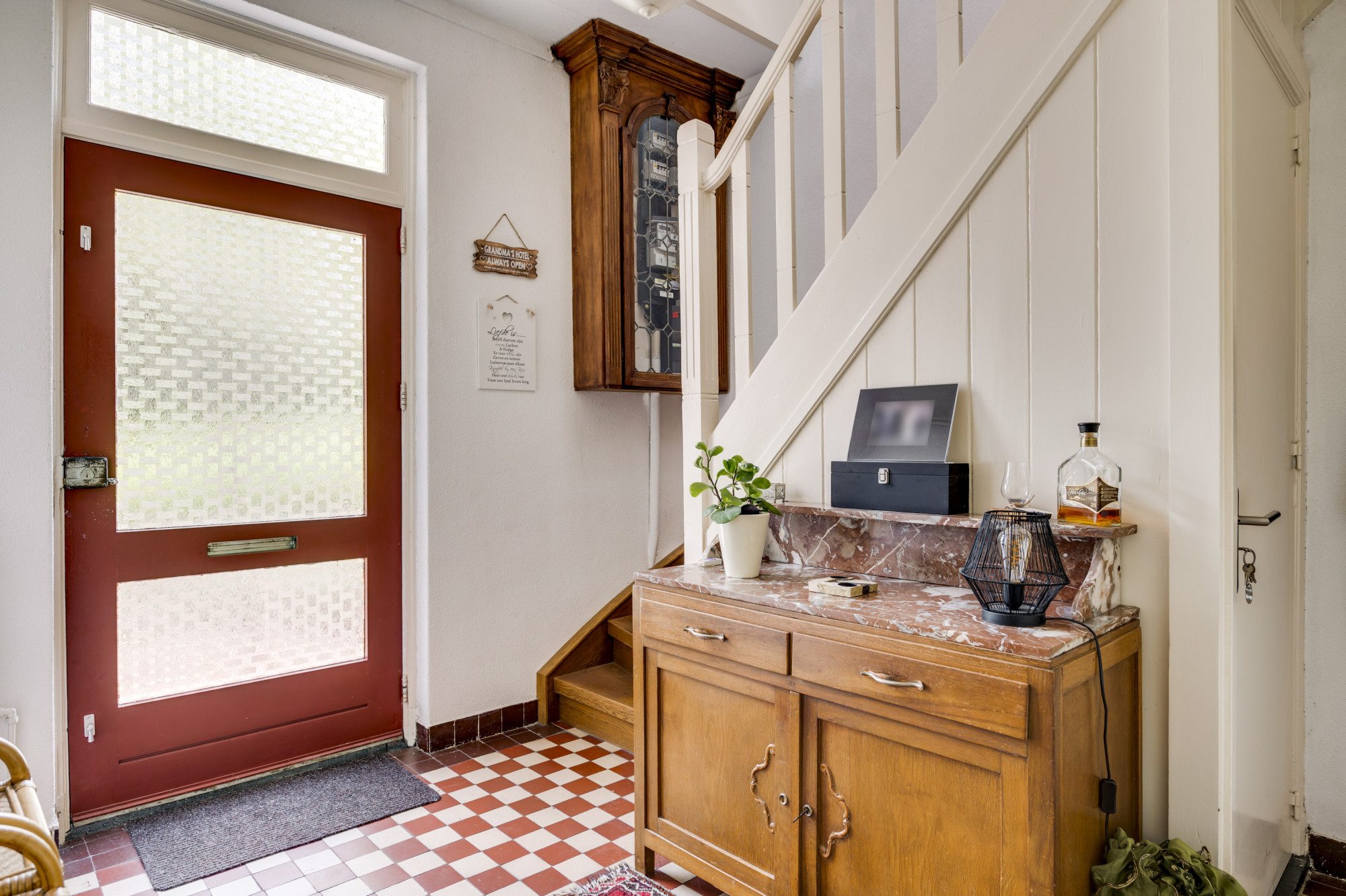 Hal/Entree, klassiek trappenhuis naar de kelder en verdieping. Meterkast voorzien van 6 groepsinstallatie / 2x aardlekschakelaar / kookgroep / separate groep voor de zonnepanelen / digitale meter met dag-/nachtstroom en digitale meters. Modern geheel betegelde toiletruimte met zwevend wandcloset en fonteintje. Ruime badkamer voorzien van hoek-/zitbad / dubbele wastafel in een badkamermeubel / handdoekradiator en mechanische afzuiging. Loopdeur naar de woonkamer.