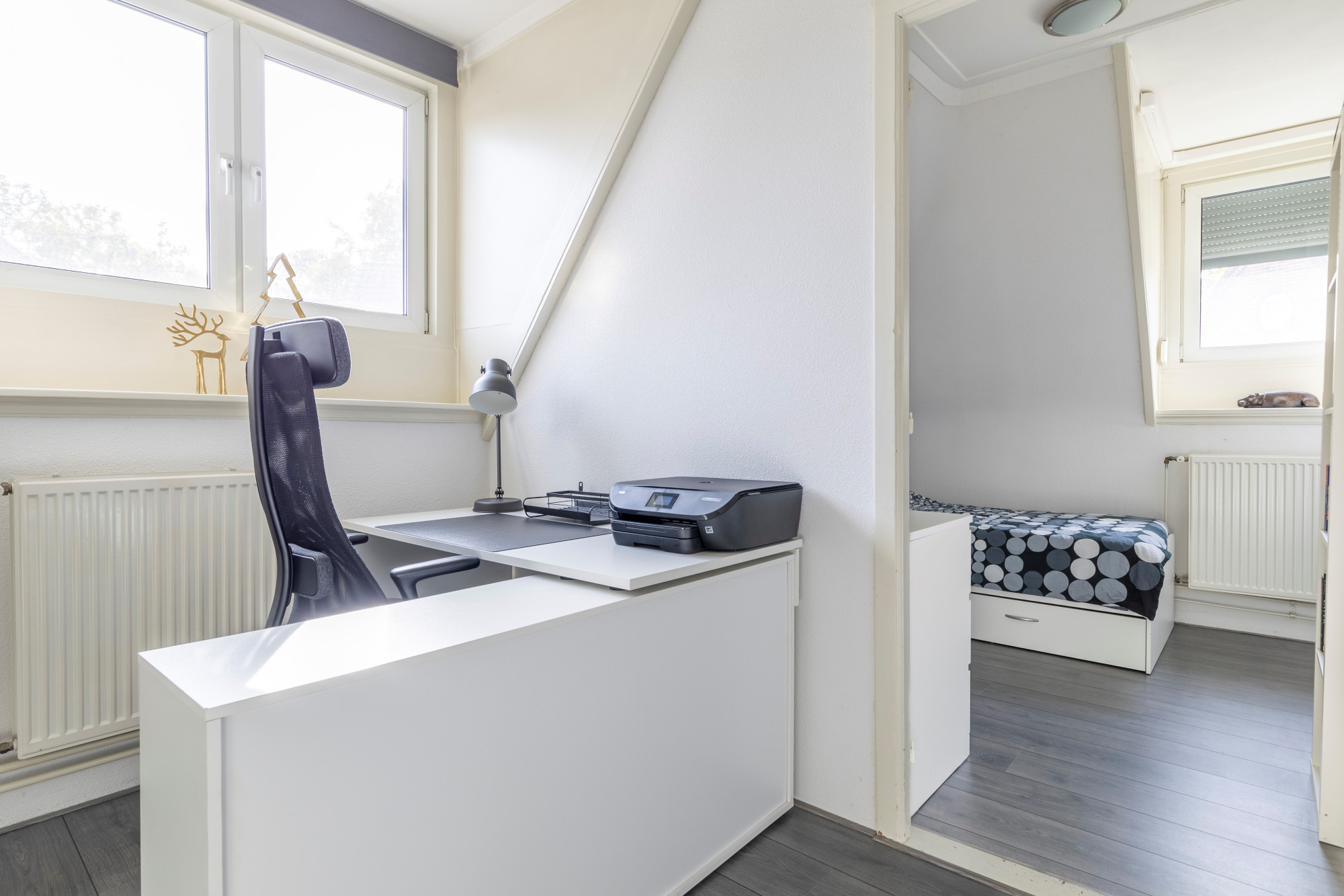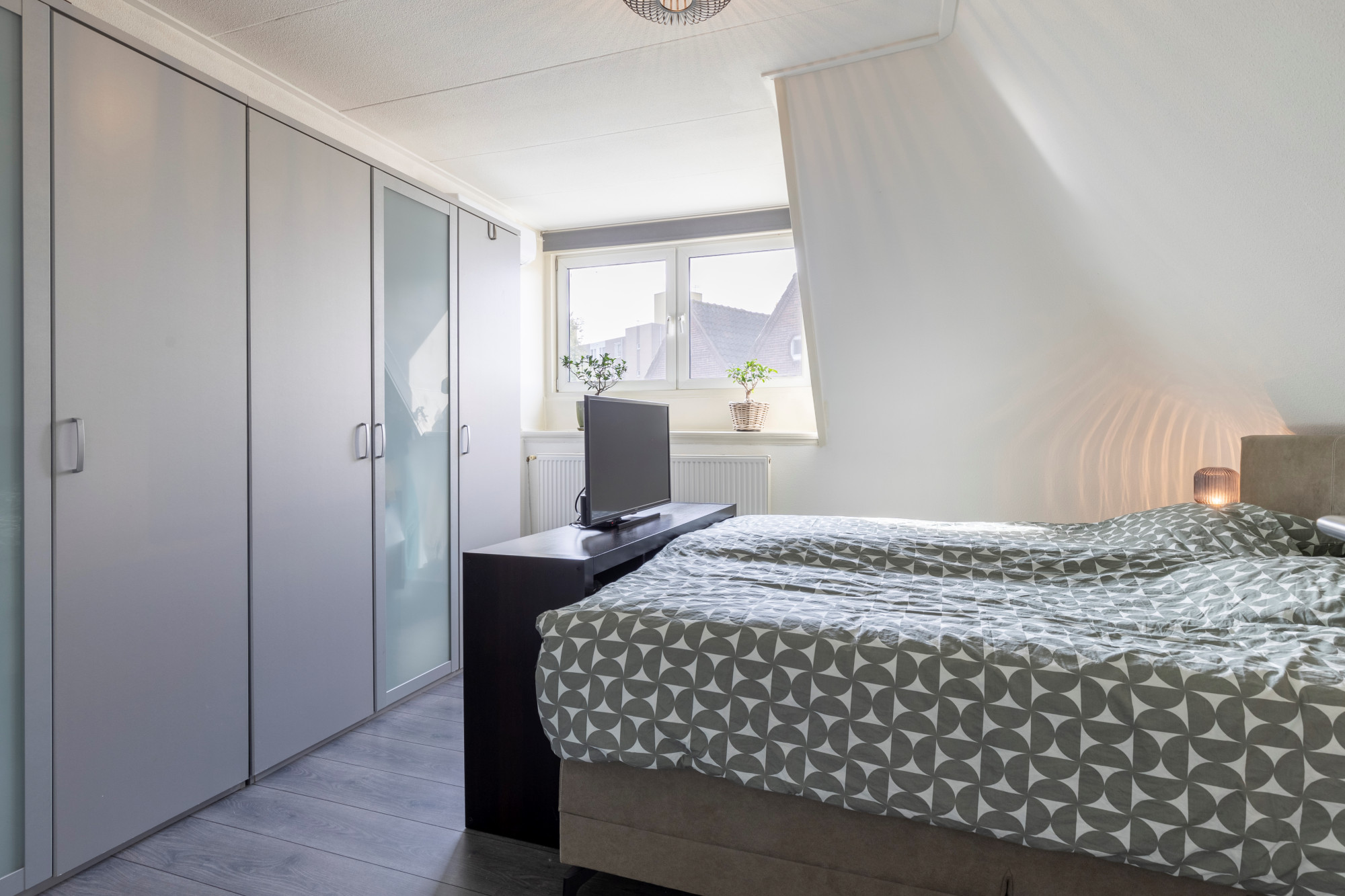 Slaapkamer 2 voorzien van een laminaatvloer en dakkapel