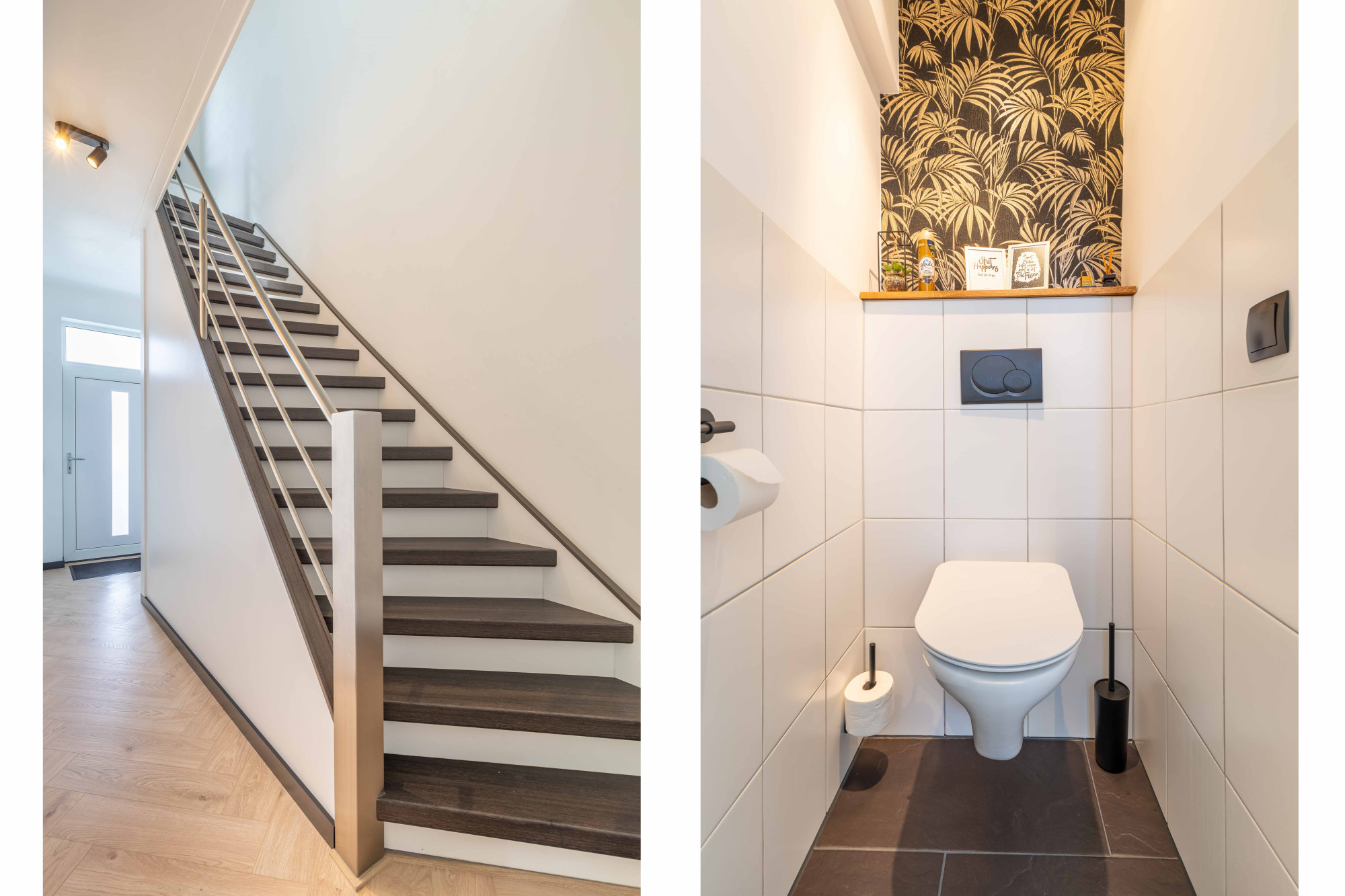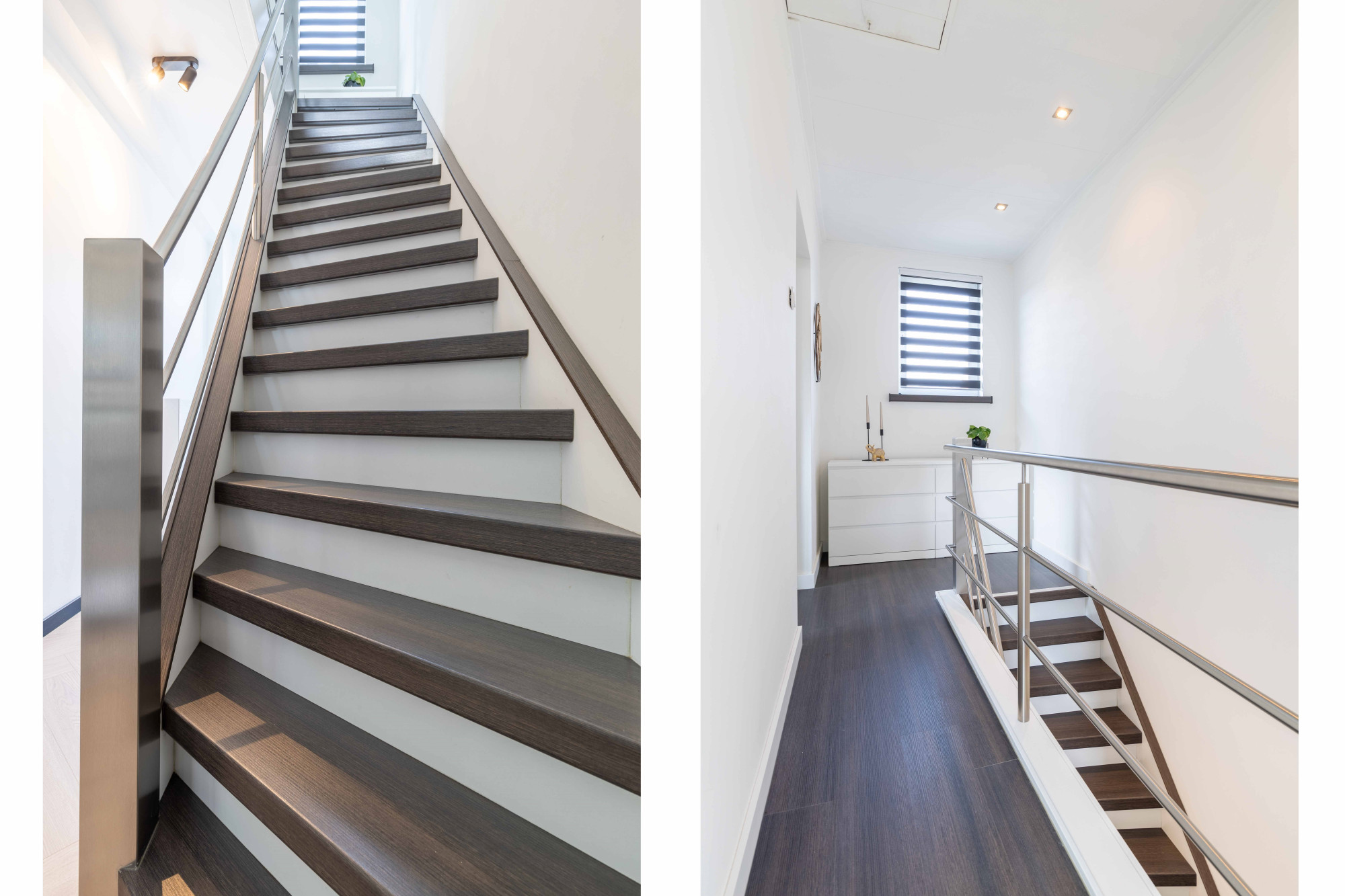 Overloop met laminaatvloer en rvs trapleuning en balustrade alsmede toegangsluik naar de bergzolder,
