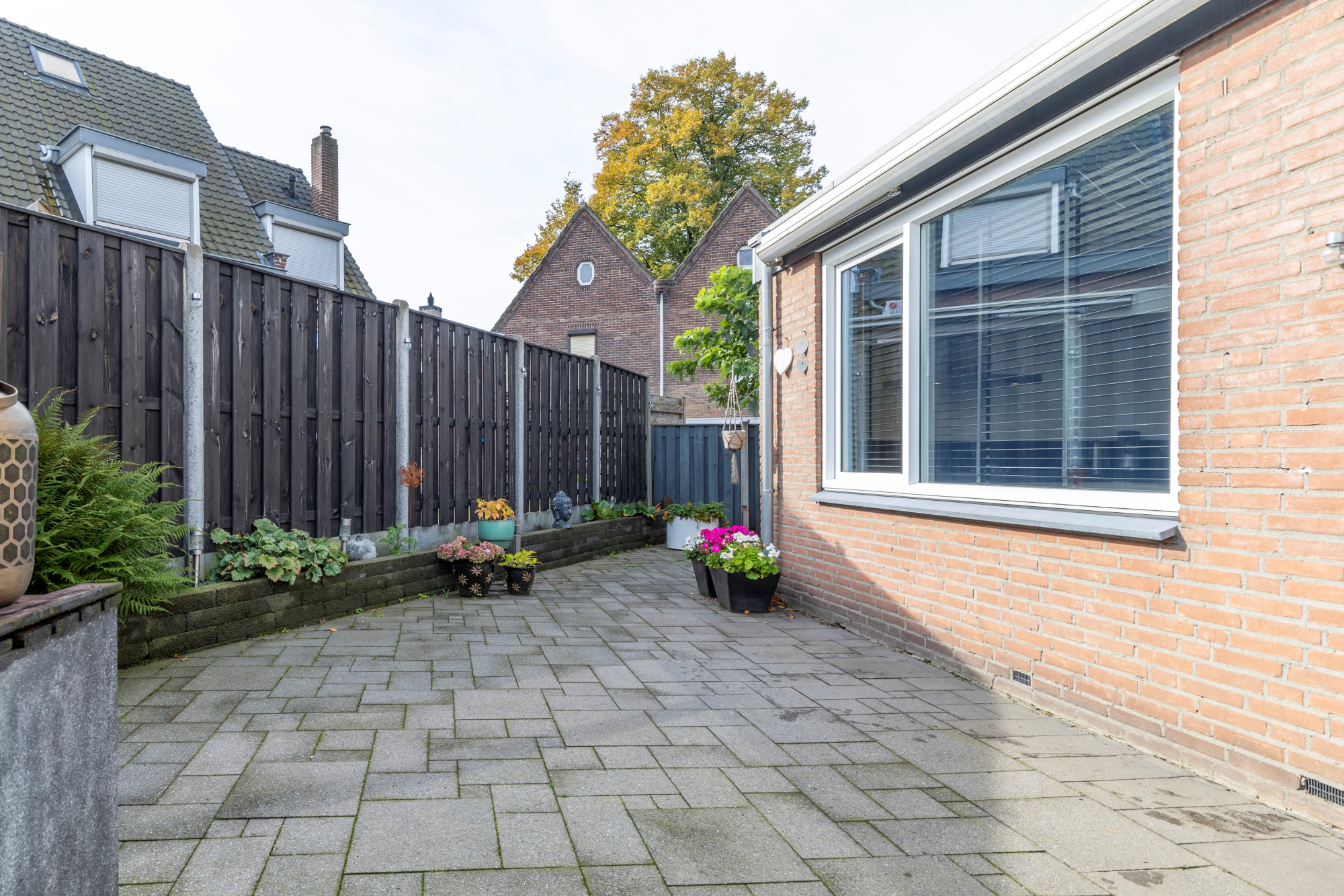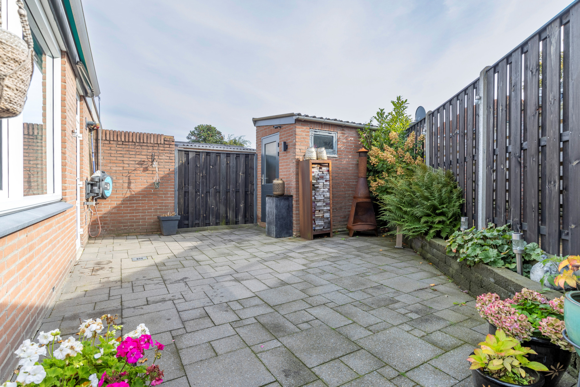 Goed aangelegde besloten en beklinkerde gezellige achtertuin met stenen berging en zij-ingang.