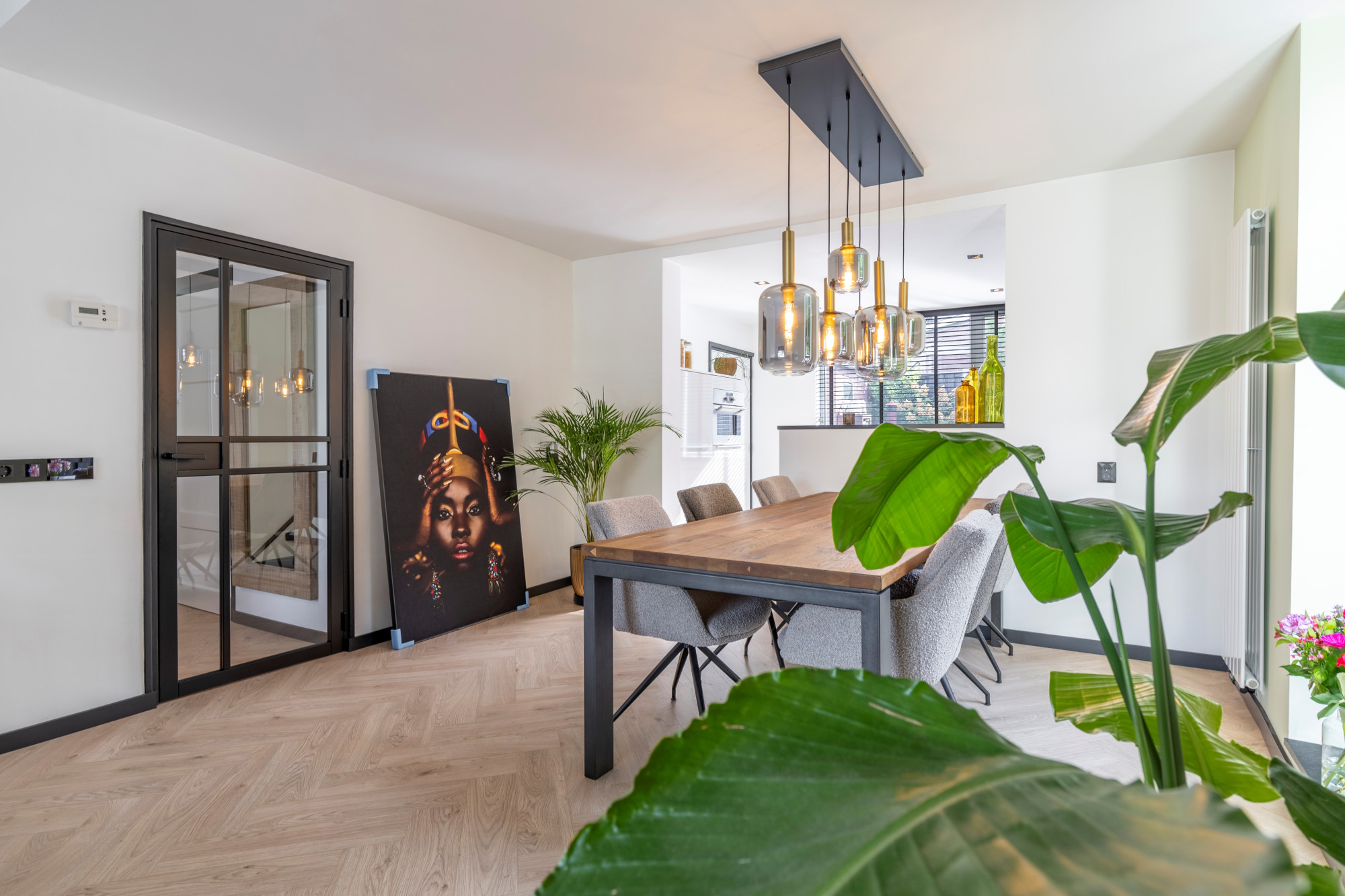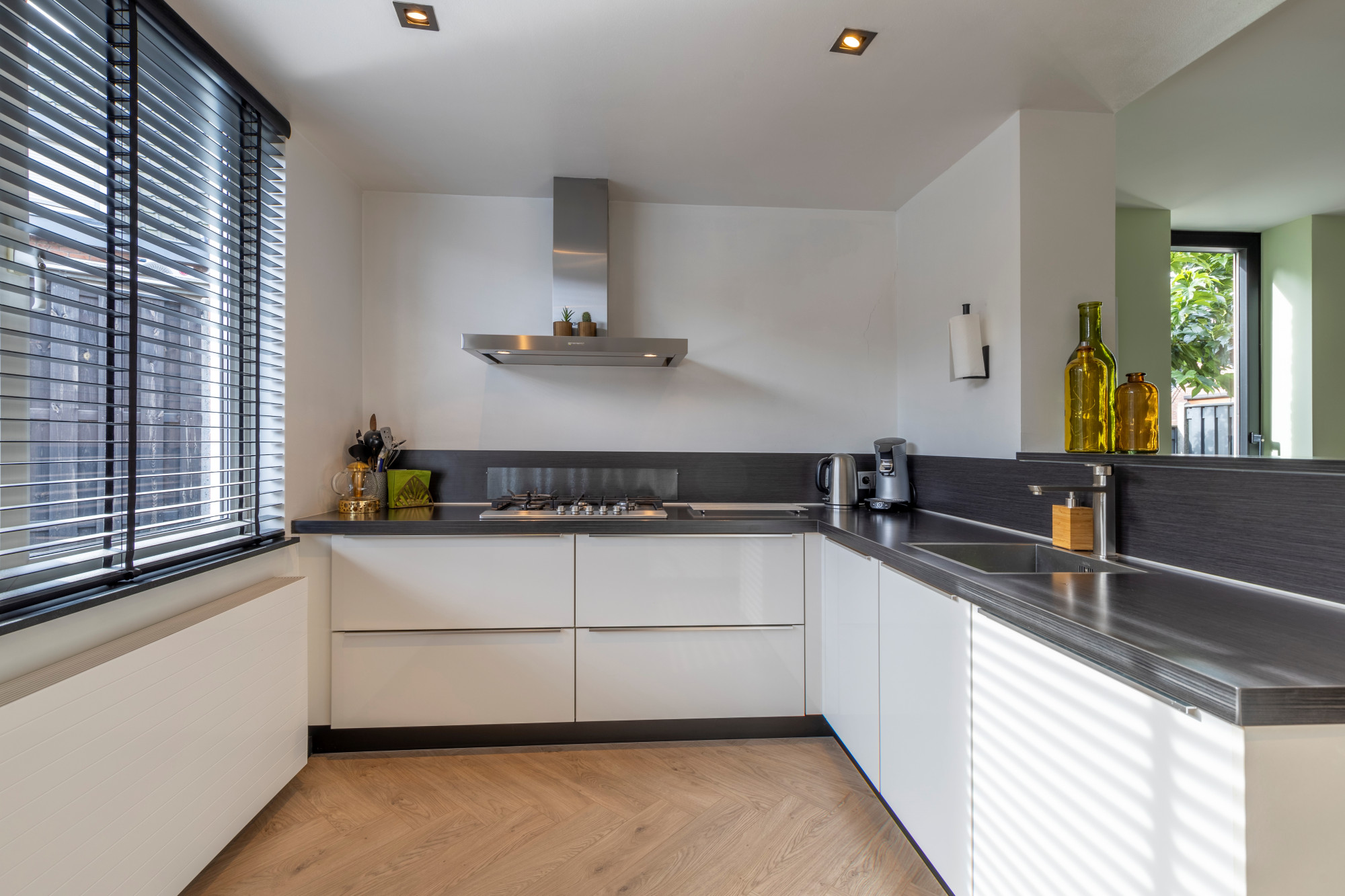 Royale woonkamer met visgraat laminaatvloer en staat in half open verbinding met de ruime keuken met moderne witte hoogglans installatie inclusief inbouwapparatuur, te weten, 5-pits gaskookplaat, vaatwasser, combi-oven en koel/vriescombinatie.