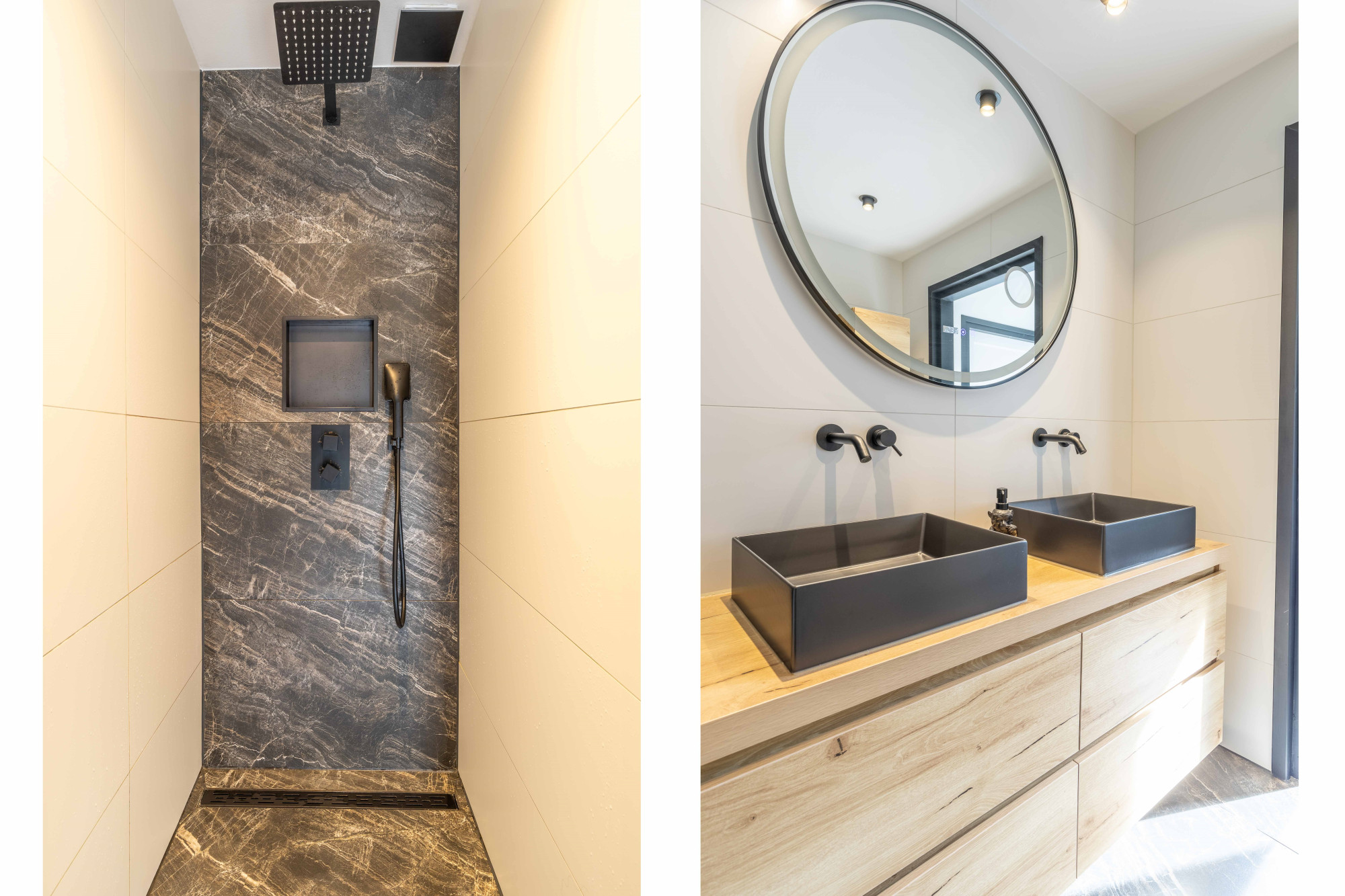 Riante, luxe badkamer voorzien van dubbele wastafelmeubel, ruime inloopdouche, designradiator en verlichte en verwarmde designspiegel.