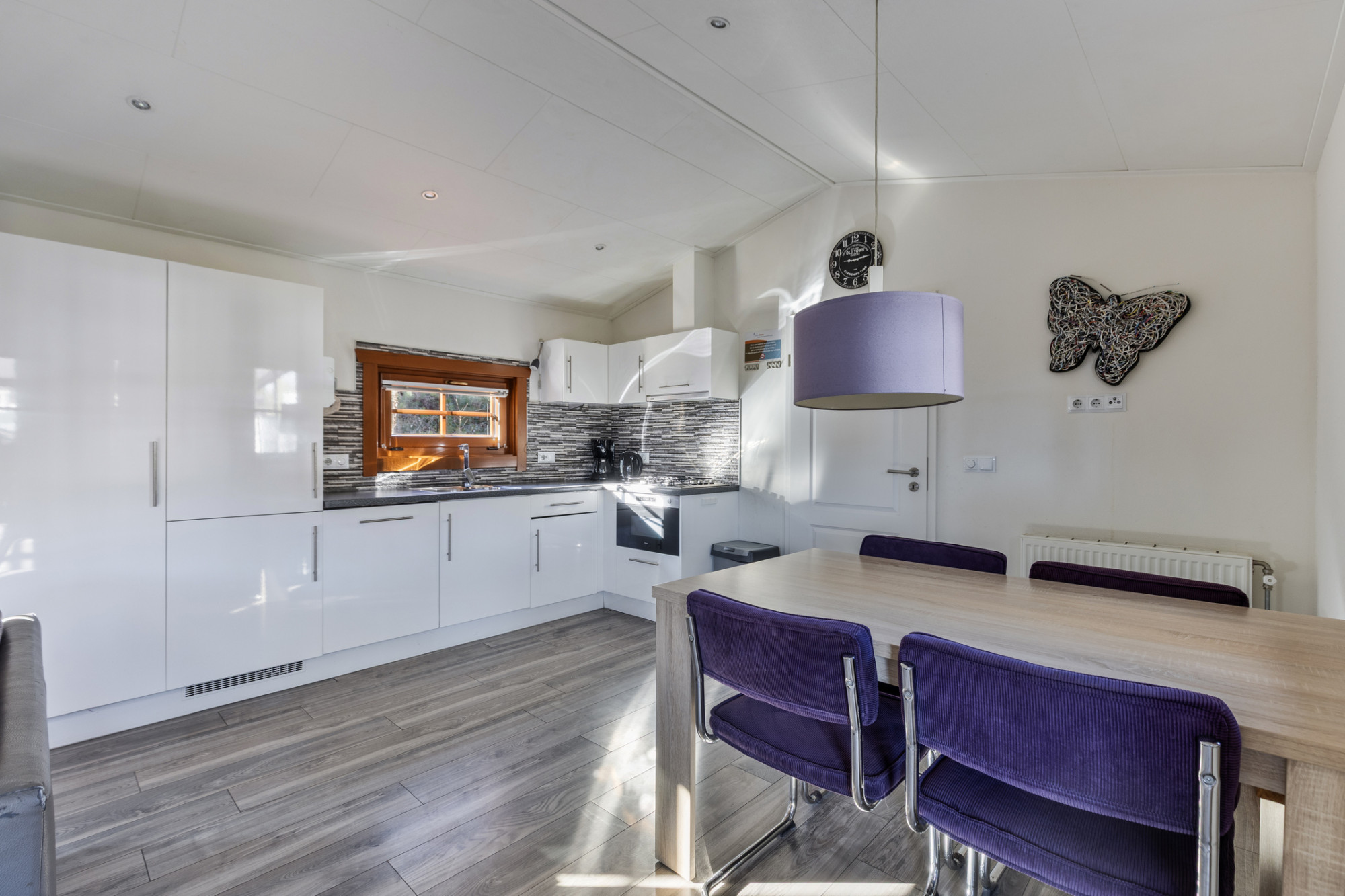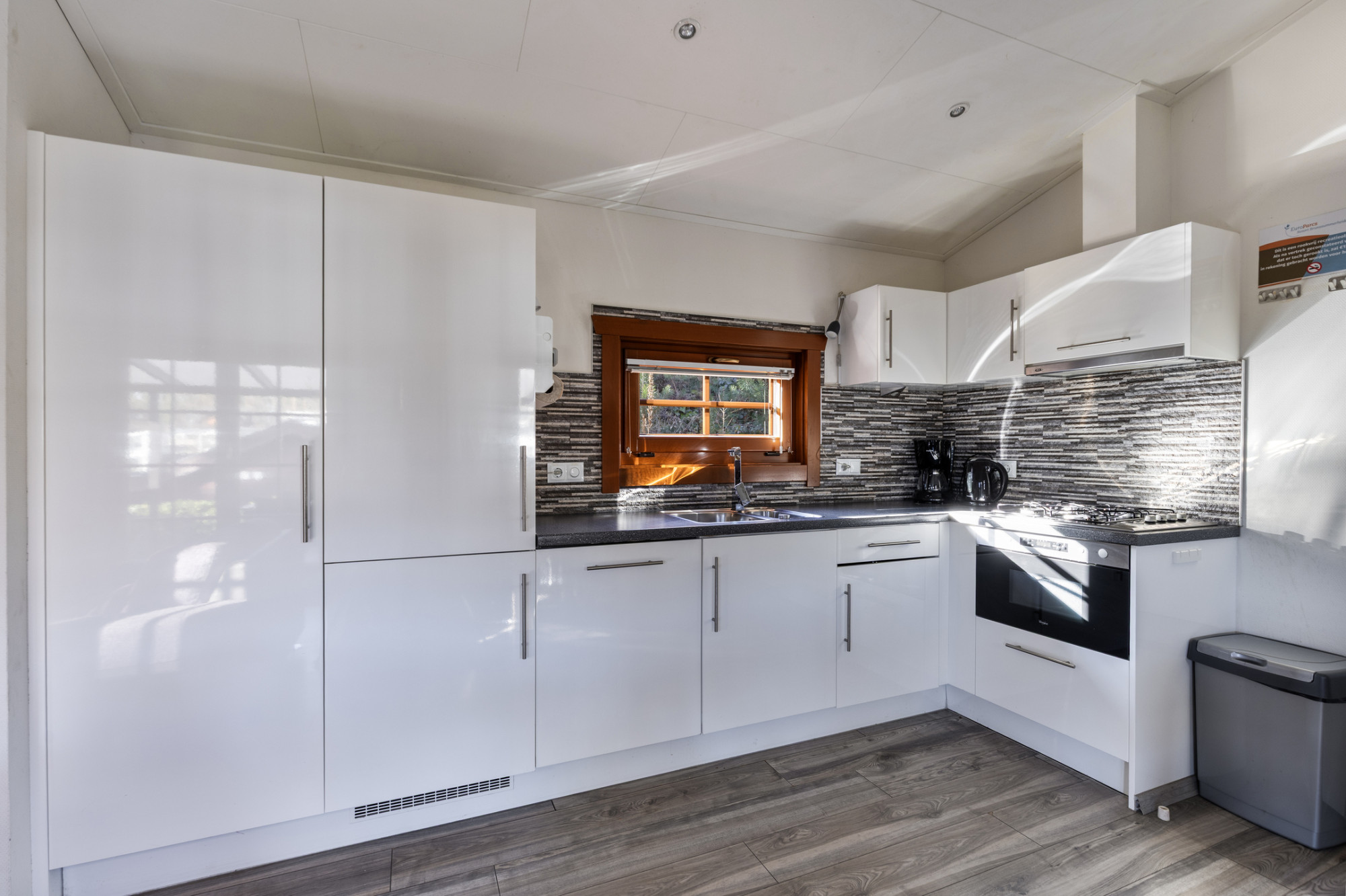 De open keuken is van vele gemakken voorzien. Zo zit er een gaskomfoor, afzuigkap, koelkast met vriesladen, combimagnetron en een afwasmachine.
